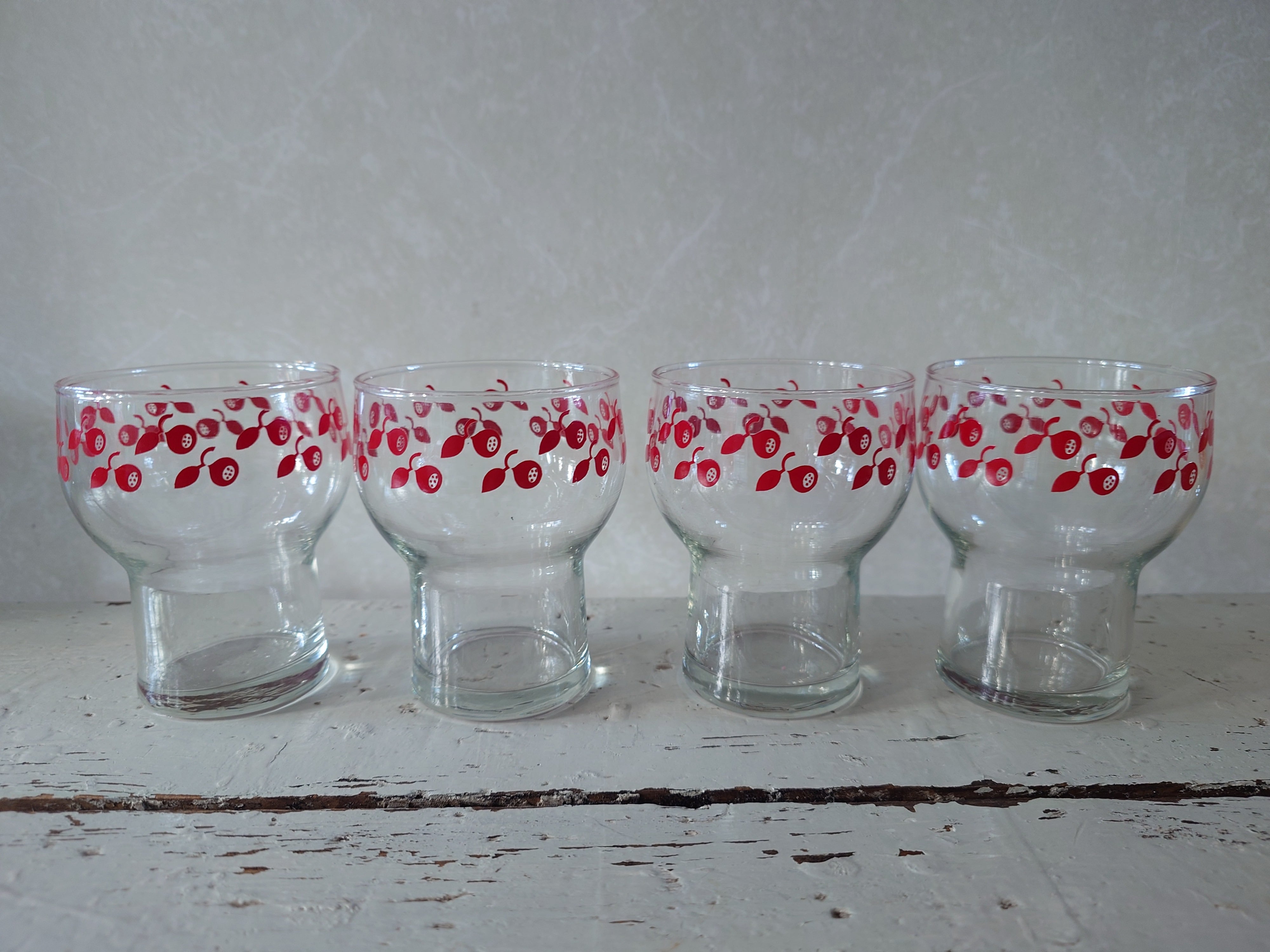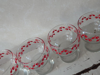 Vintage juomalasit, joissa on punainen puolukka aihe. Valmistaja Ravenhead Englanti, 1970-luku.