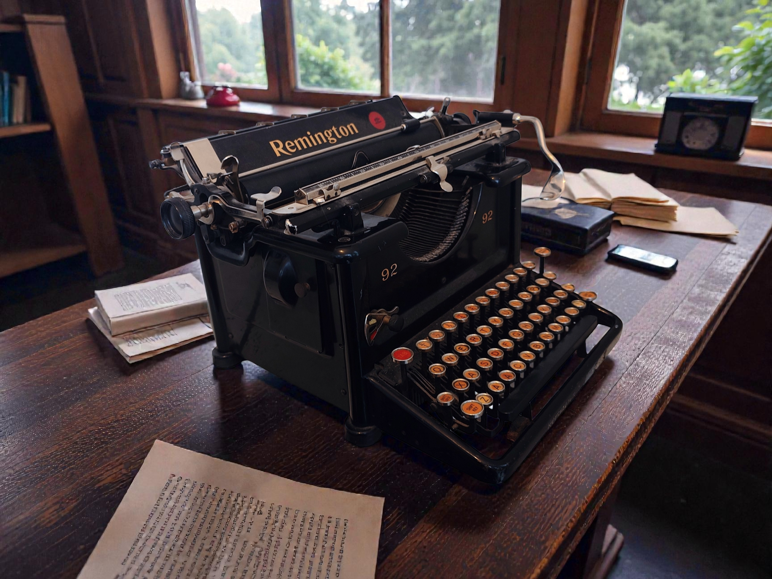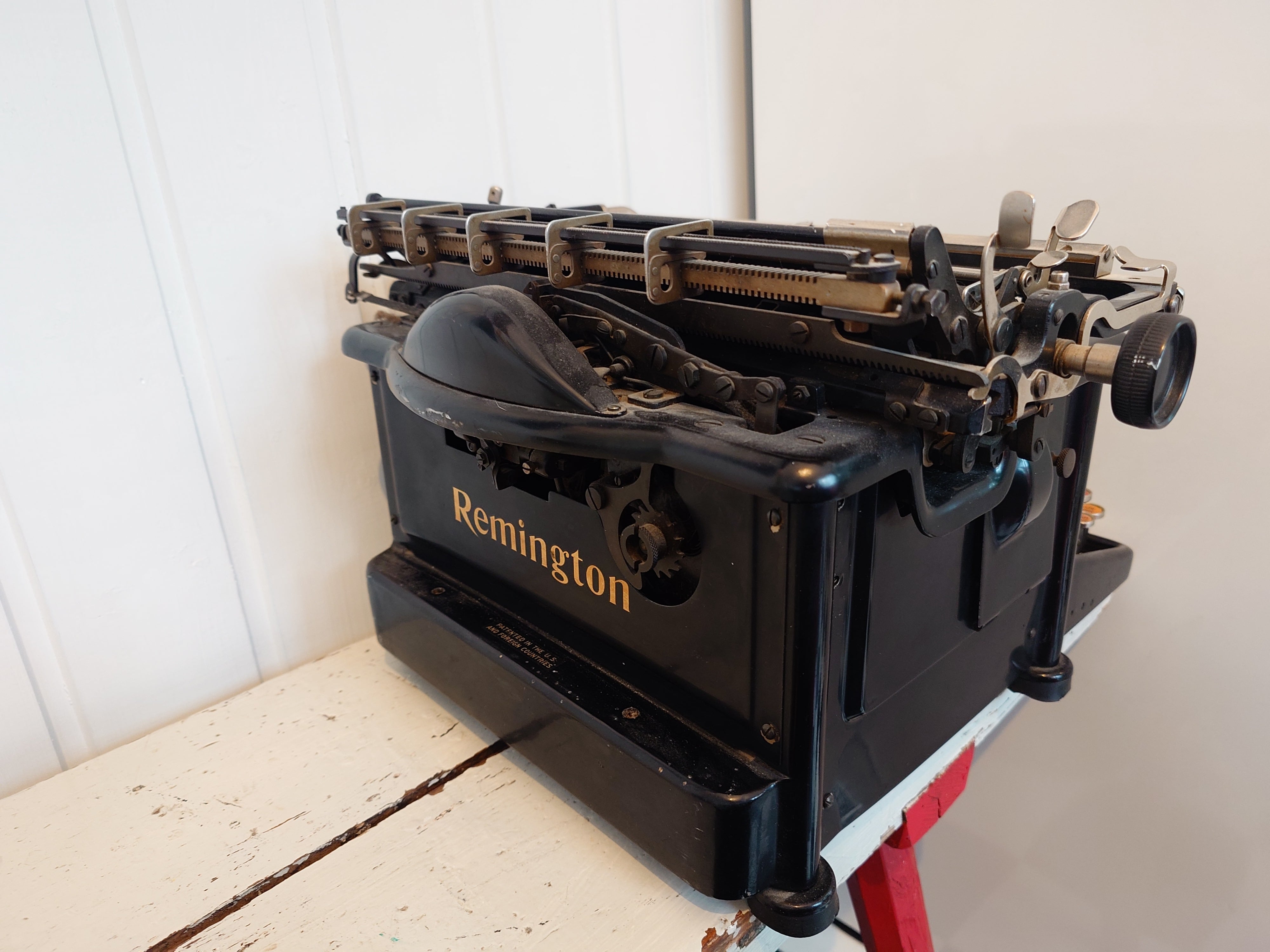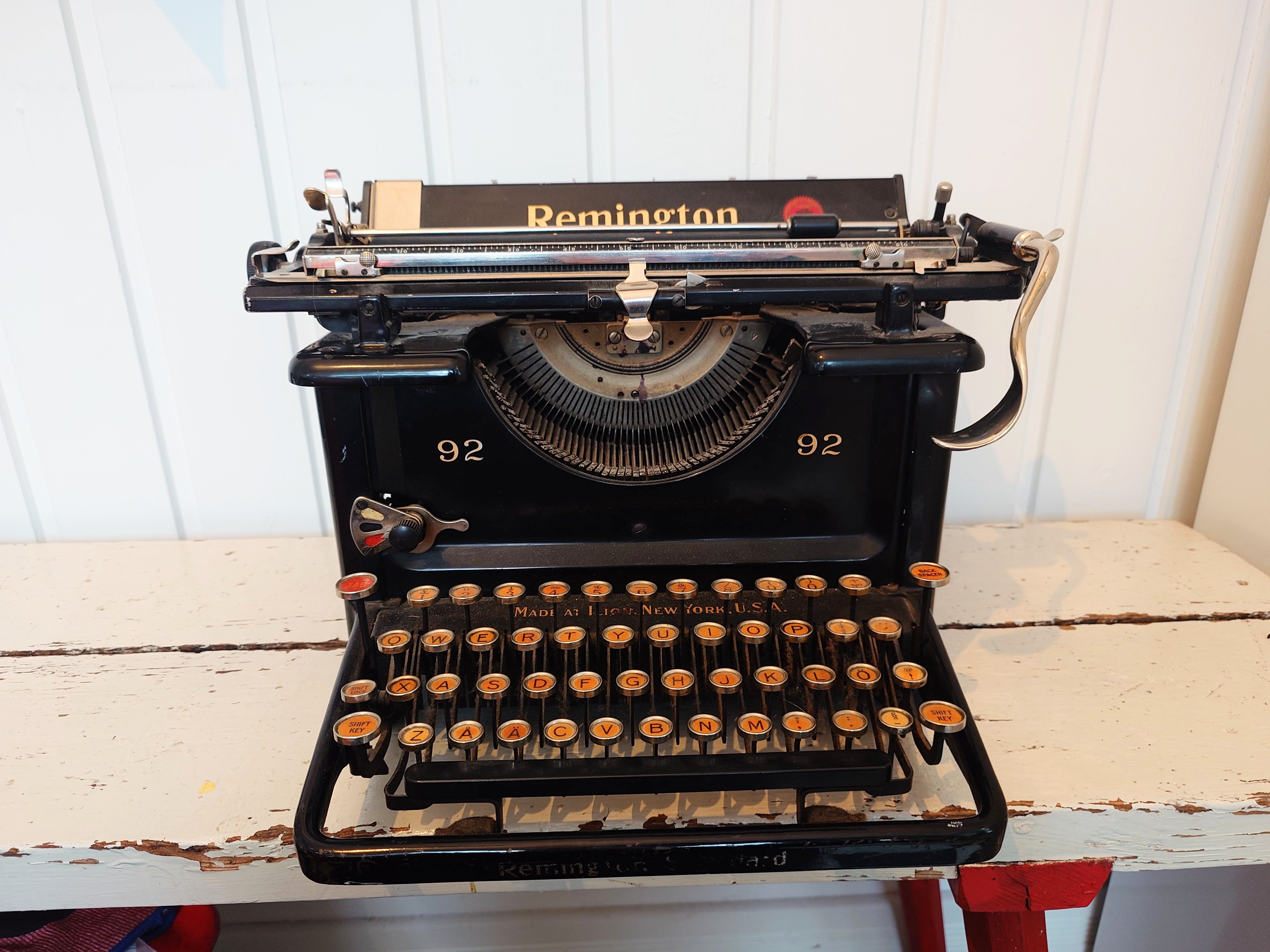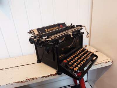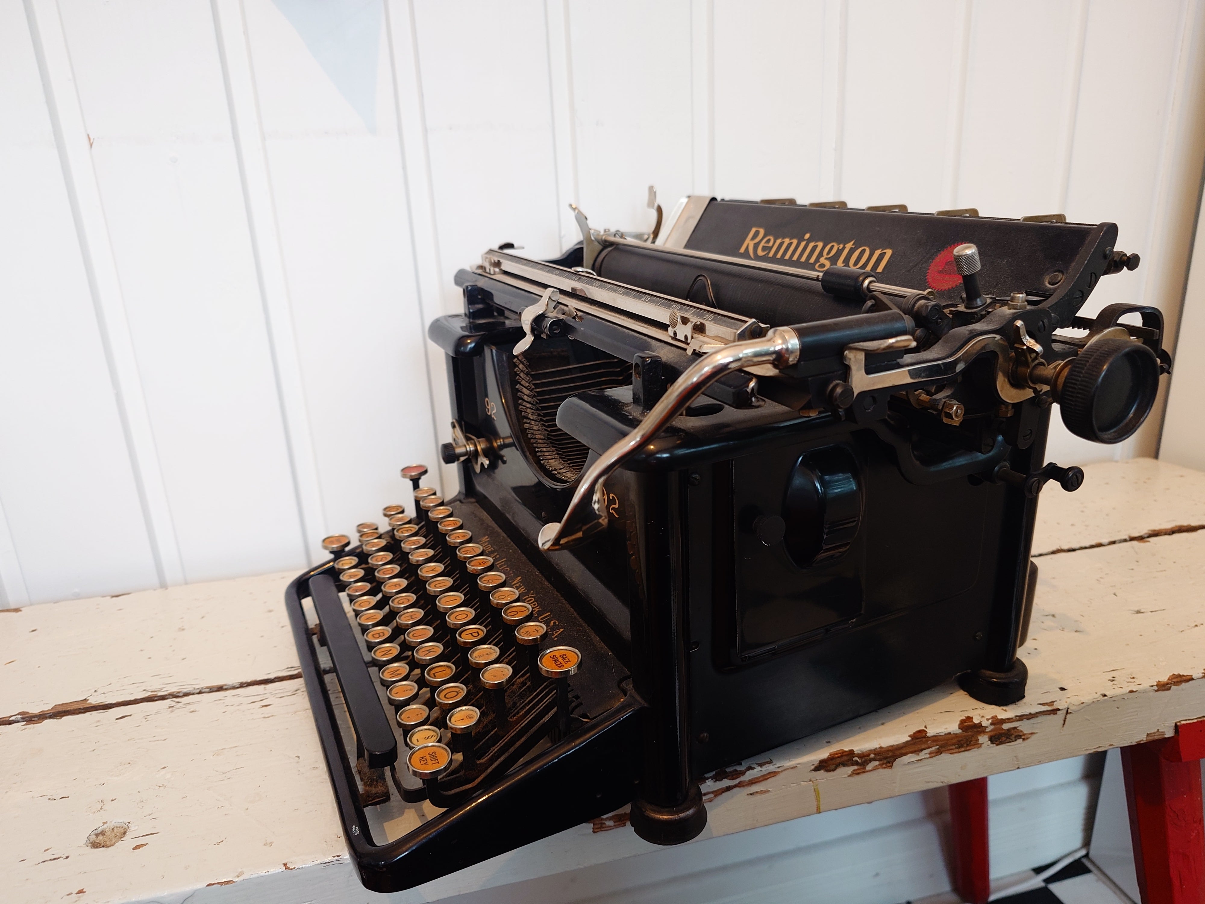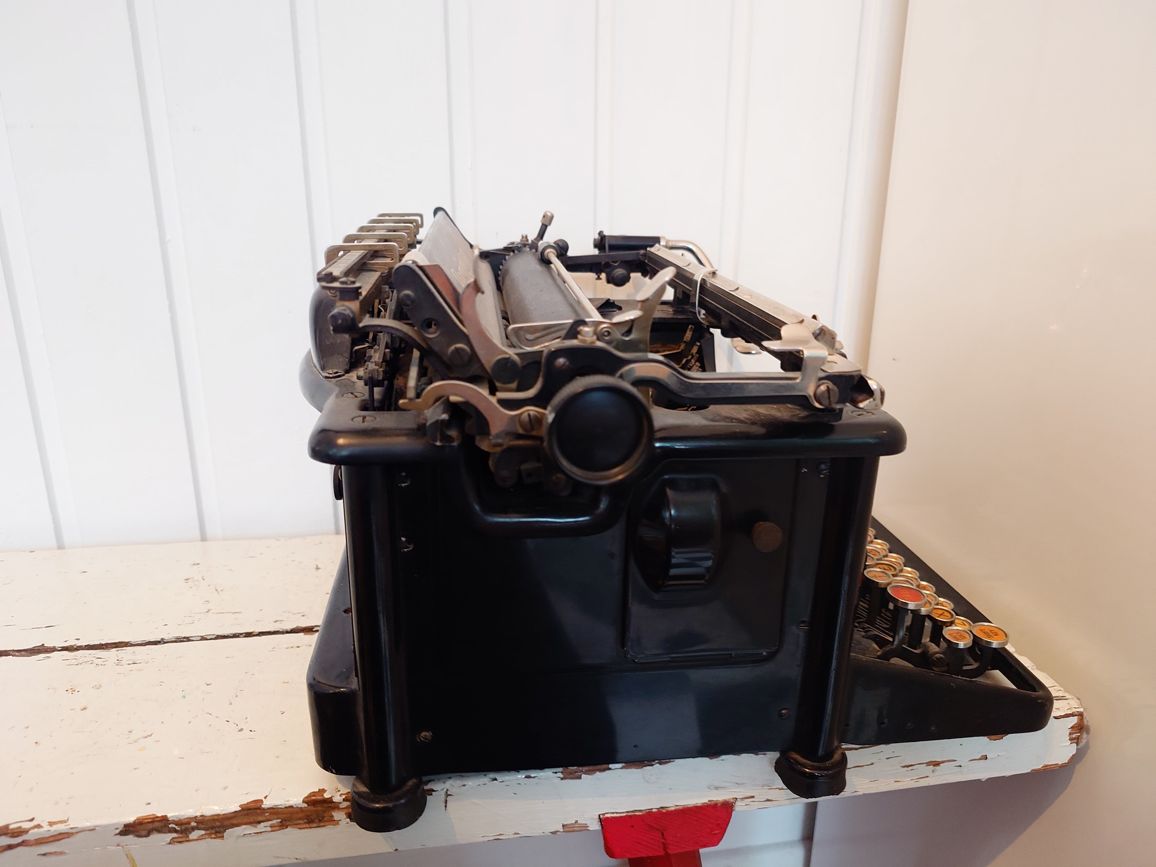 1920-luvulta peräisin oleva jykevä vanha kirjoituskone. Painoa on peräti 16 kg.