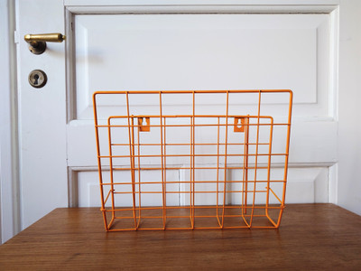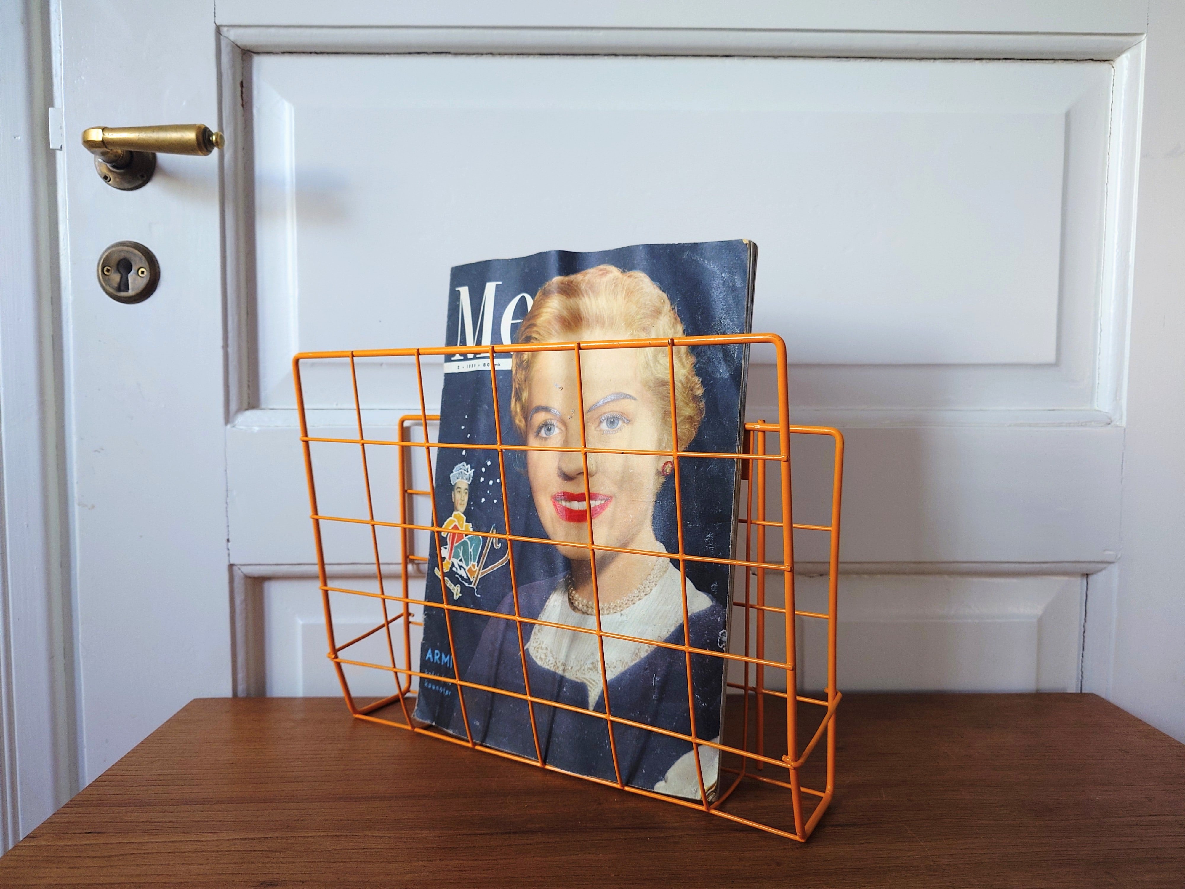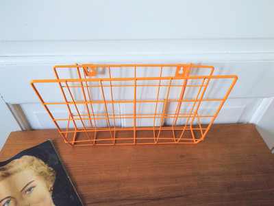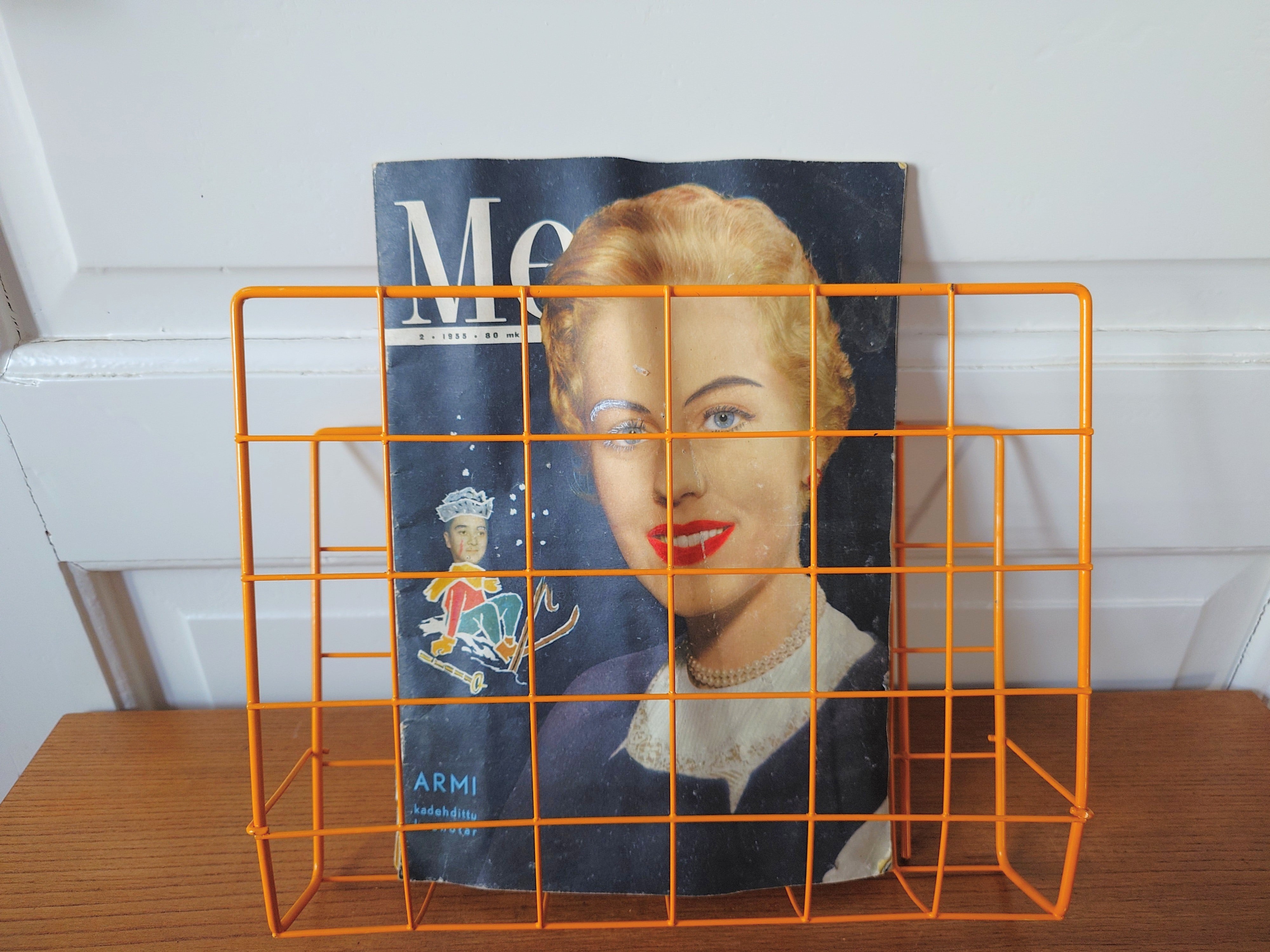 Vanha seinälle sijoitettava lehtiteline 1970-1980-luvulta. Metallia. Keltainen väri.