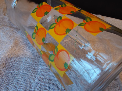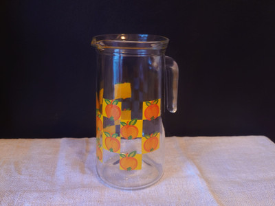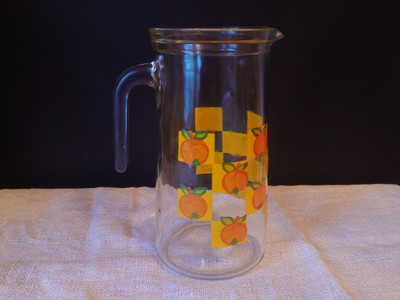 Italialainen pirteä lasikannu 1970-luvulta, jossa on oransseja appelsiineja.