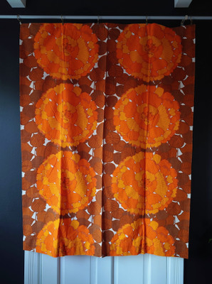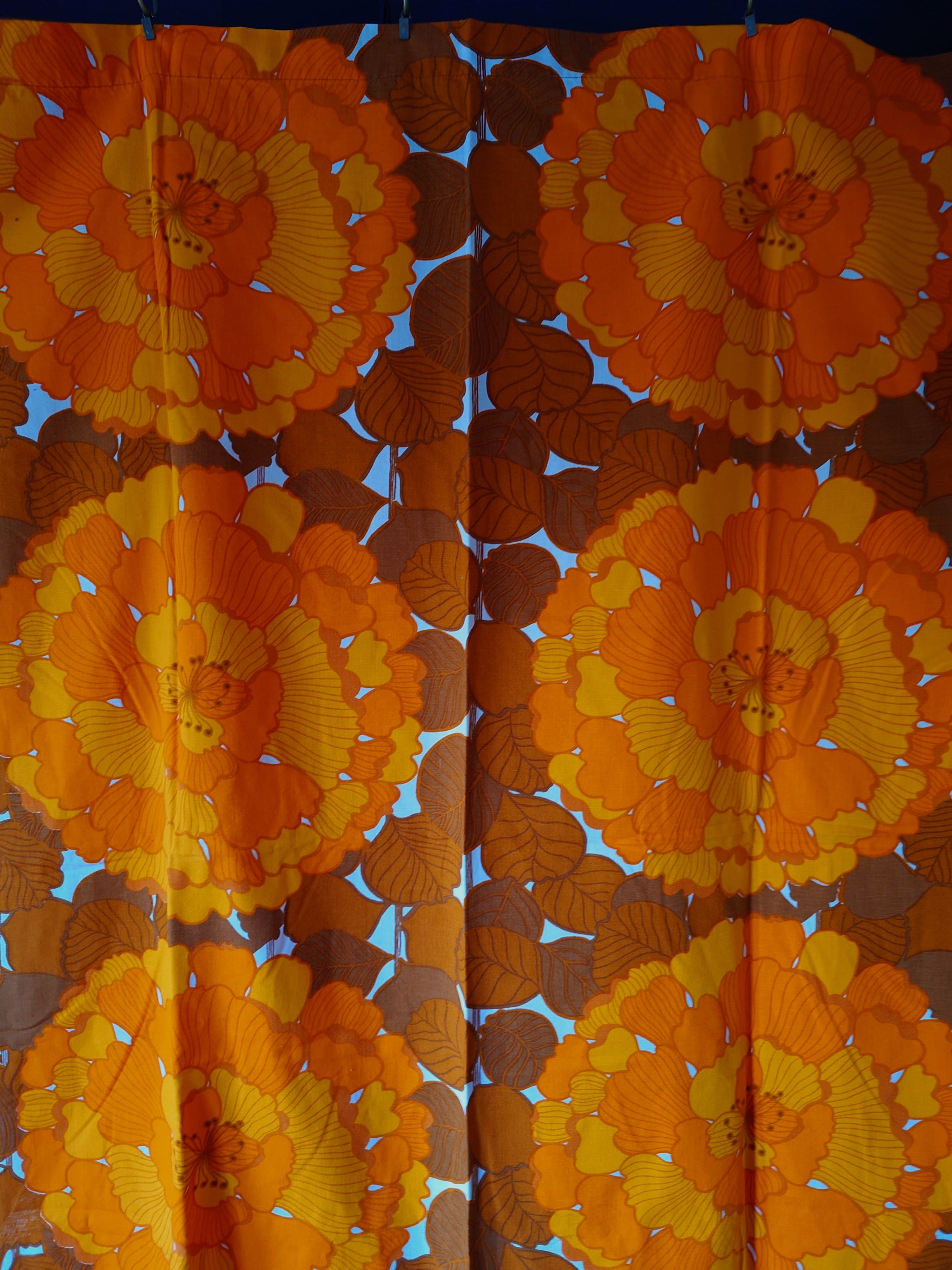 Kaunis vanha puuvillakangas, jossa on oransseja kukkia ja ruskeita lehtiä.