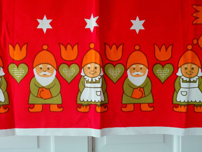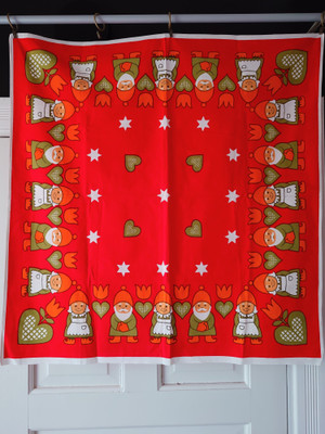 Vintage värikäs tonttukuvioinen pöytäliina.