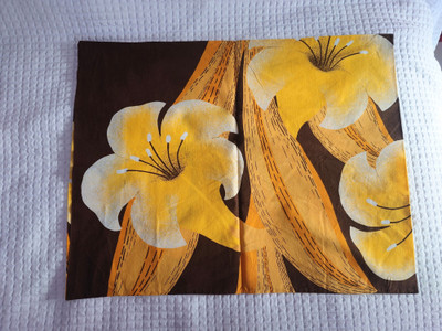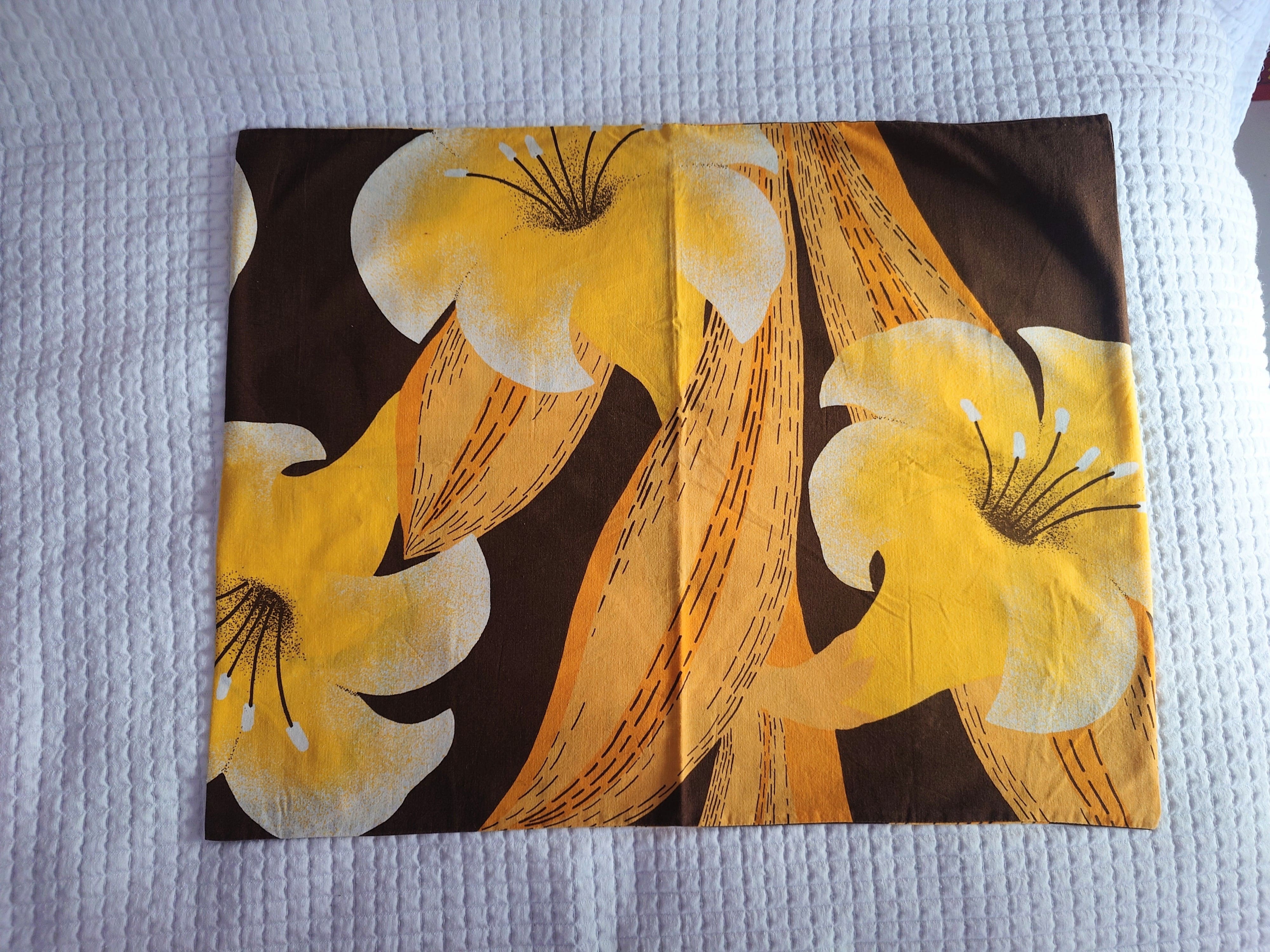 Retro tyynyliina, jossa on ruskealla pohjalla keltaisia isoja kukkia. Puuvillaa.