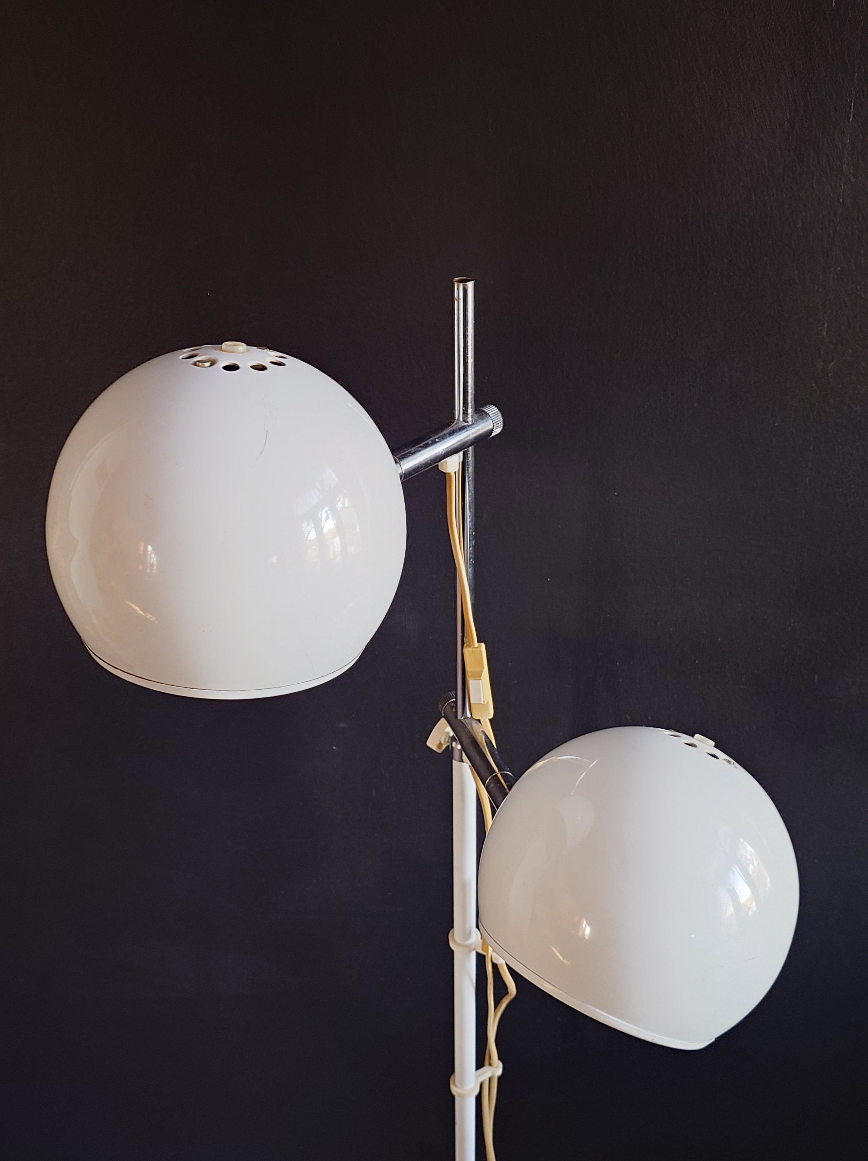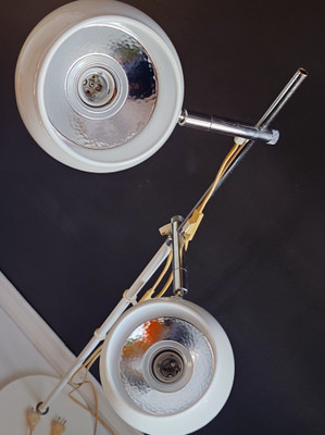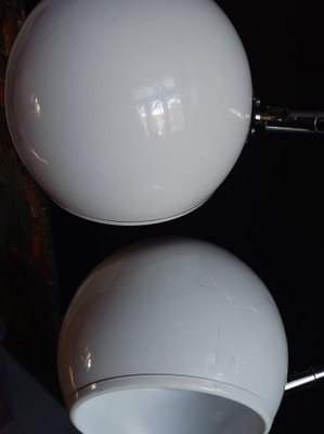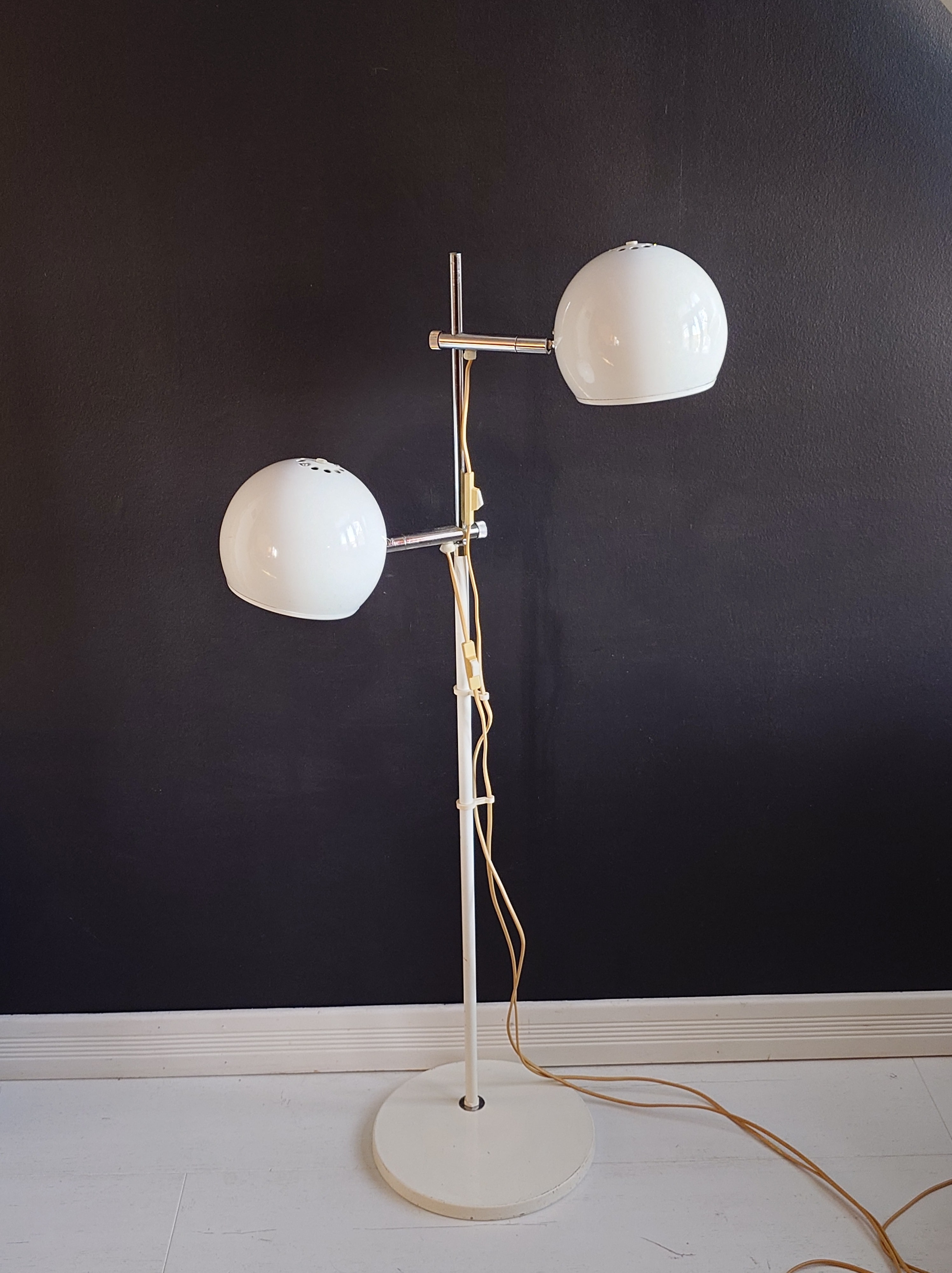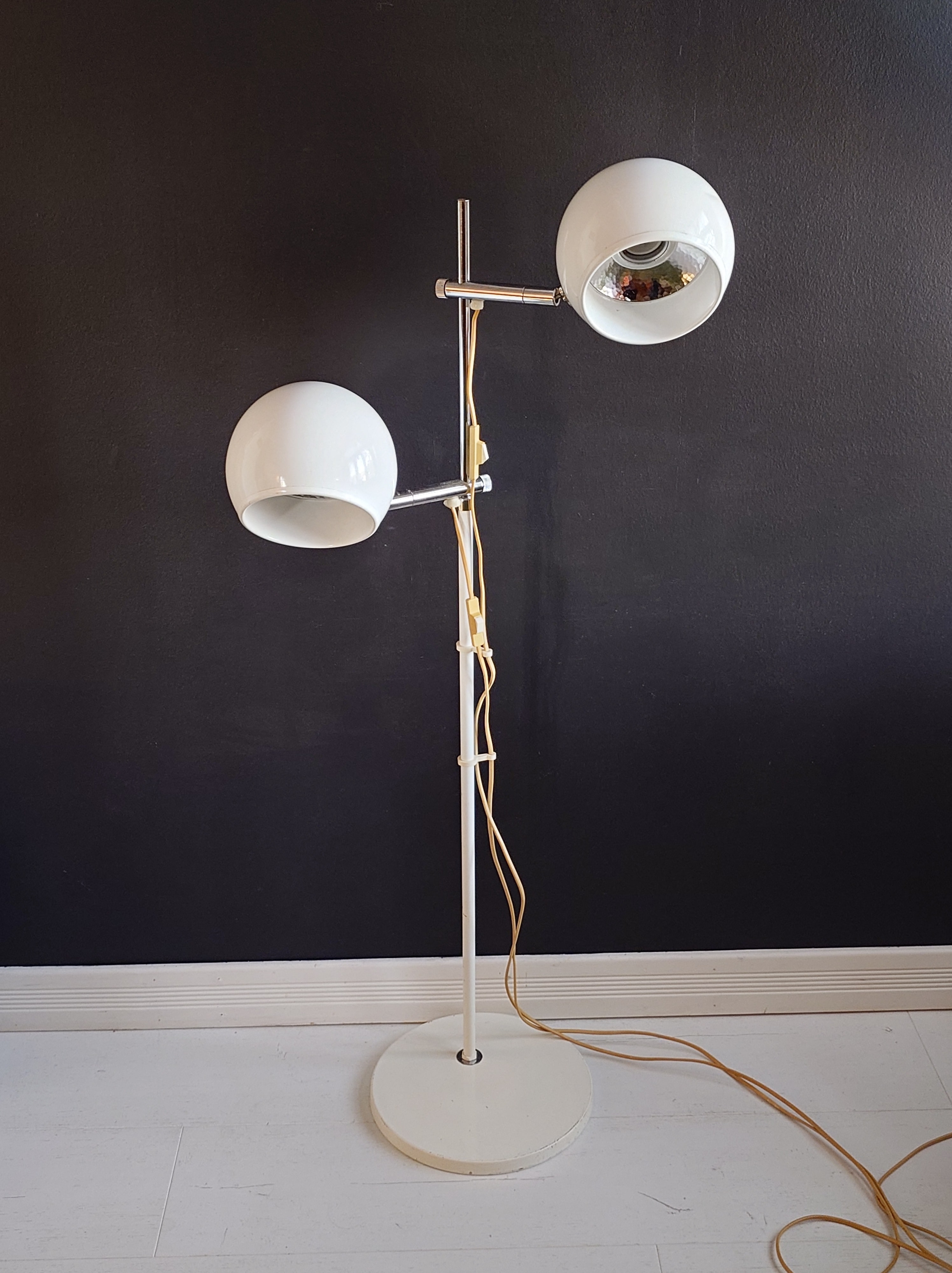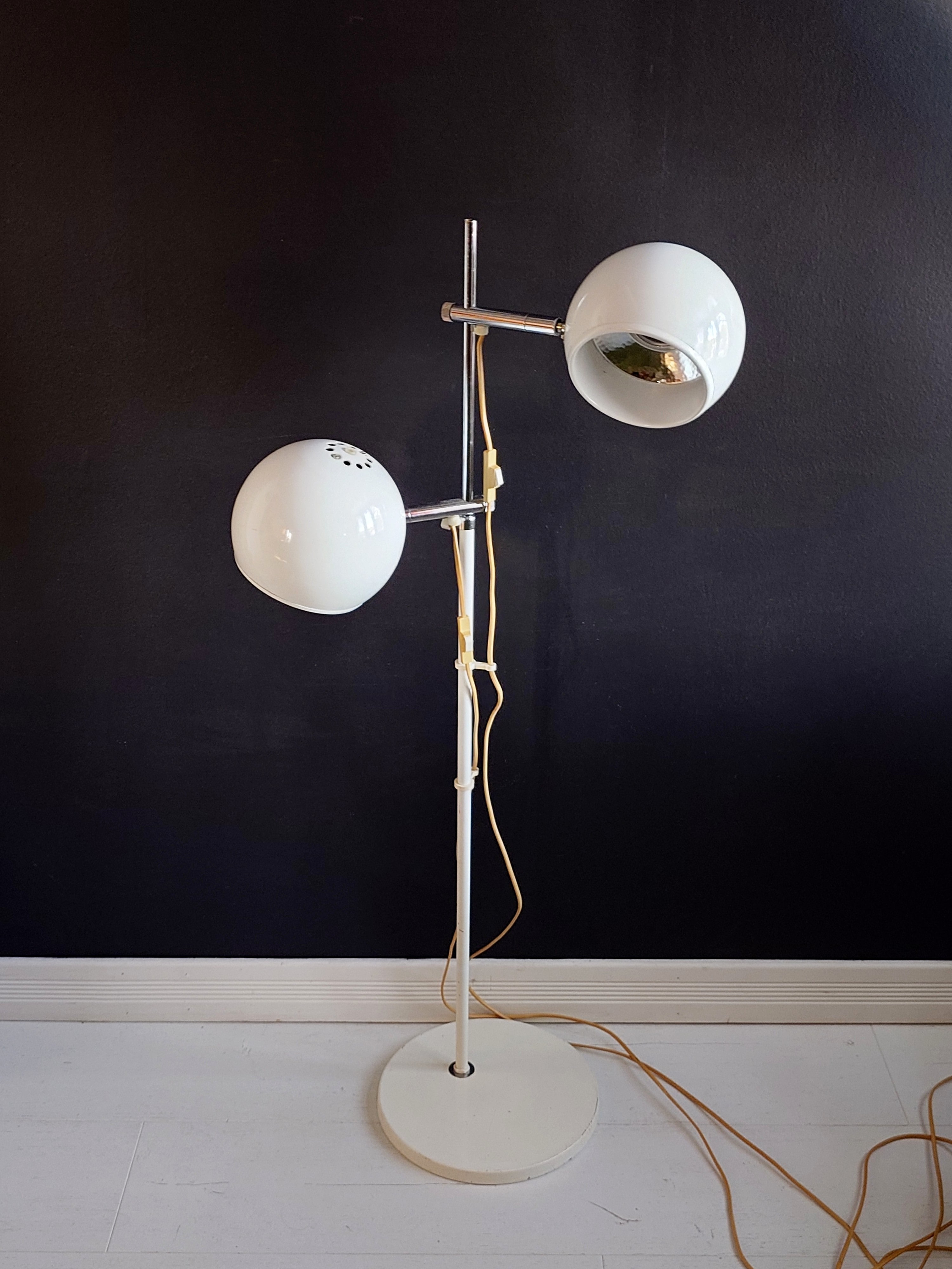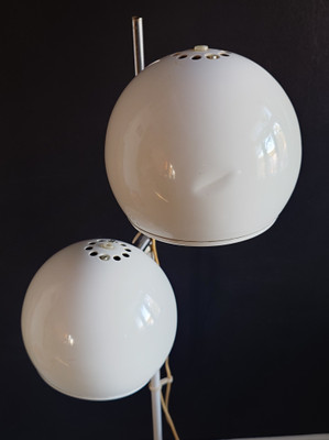1970-luvun lattiavalaisin, missä on kaksi pallovarjostinta. Valkoiset pallot ja kromatut heijastajat. Rungossa on OMI stanssaukset.