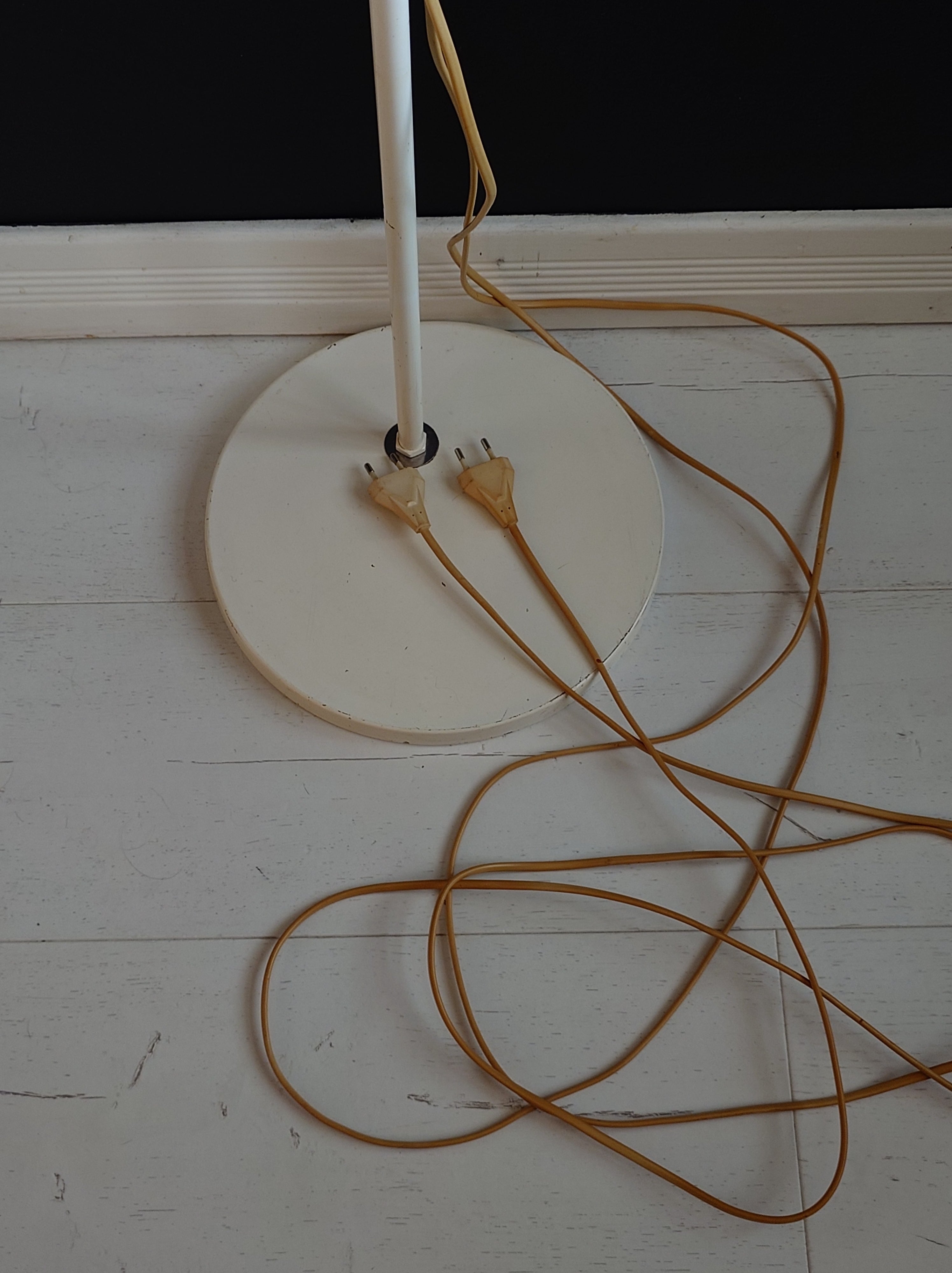 Valaisin on toimiva ja hyväkuntoinen. Pieni kuhmu toisessa kuvussa. Joitain pieniä käytön jälkiä. Molempiin varjostimiin on oma katkaisija. Litteä sähköpistoke. Sähköjohdot ovat kellastuneet.