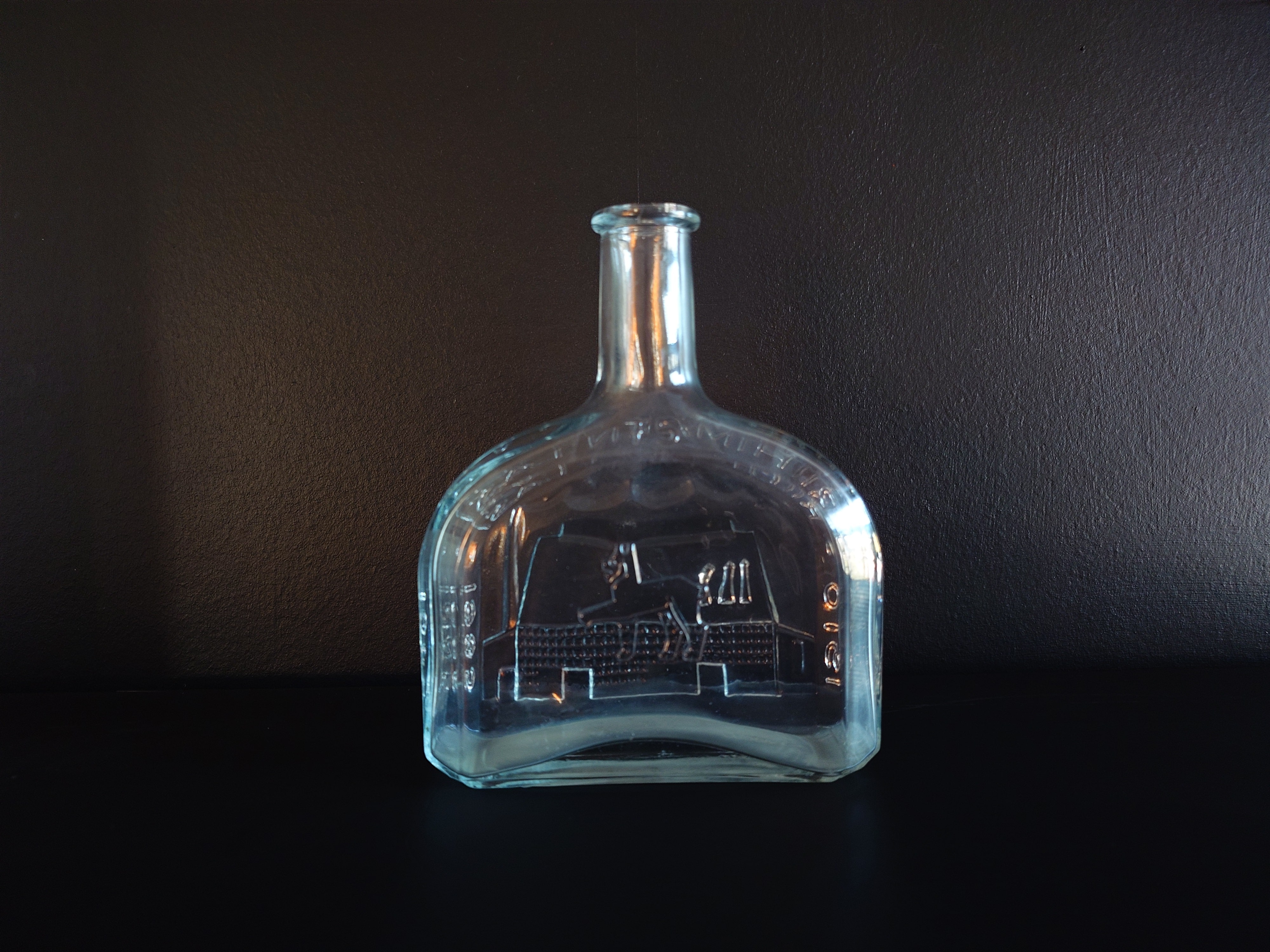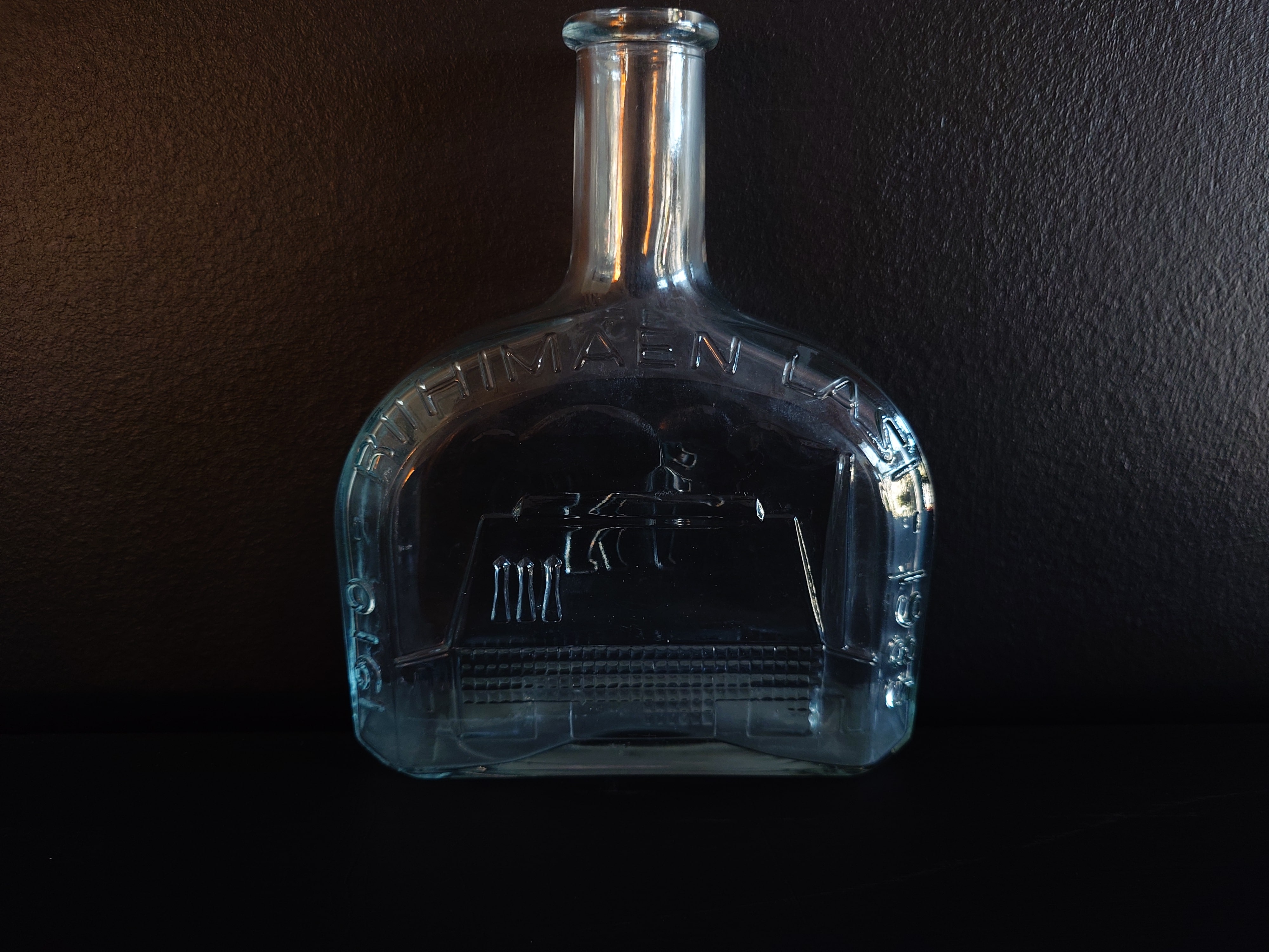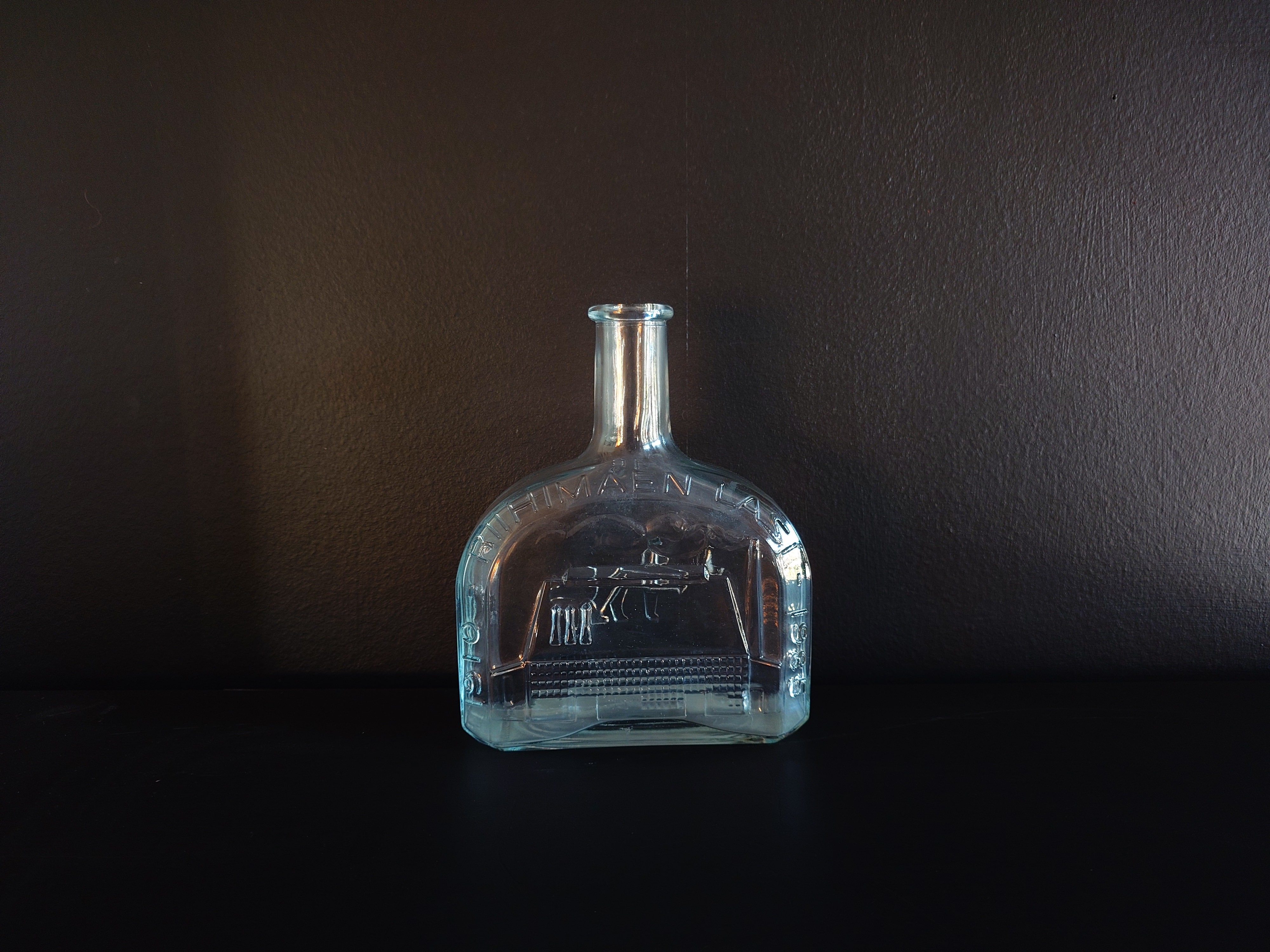 Pullossa on teksti Riihimäen Lasi 1910 - 1985 ja toisella puolella tuttu ilves kuvio.