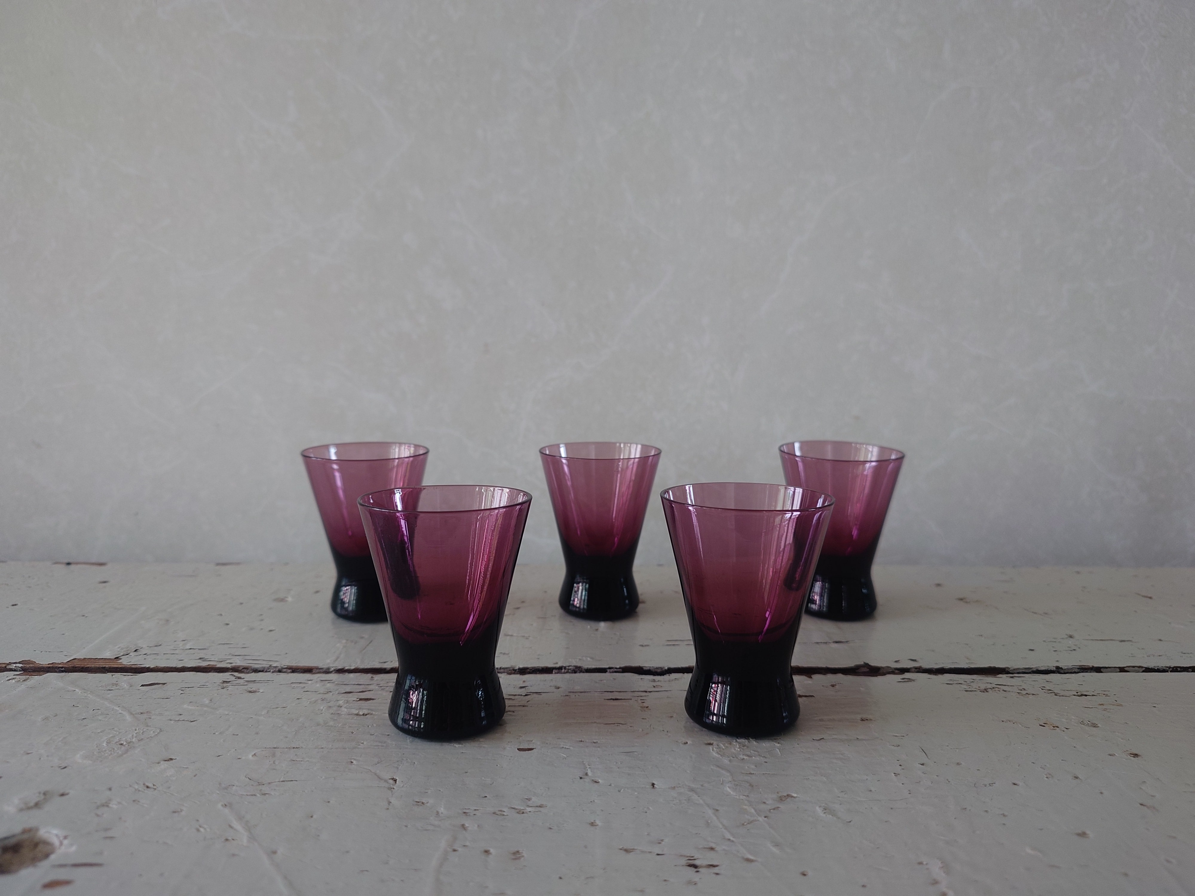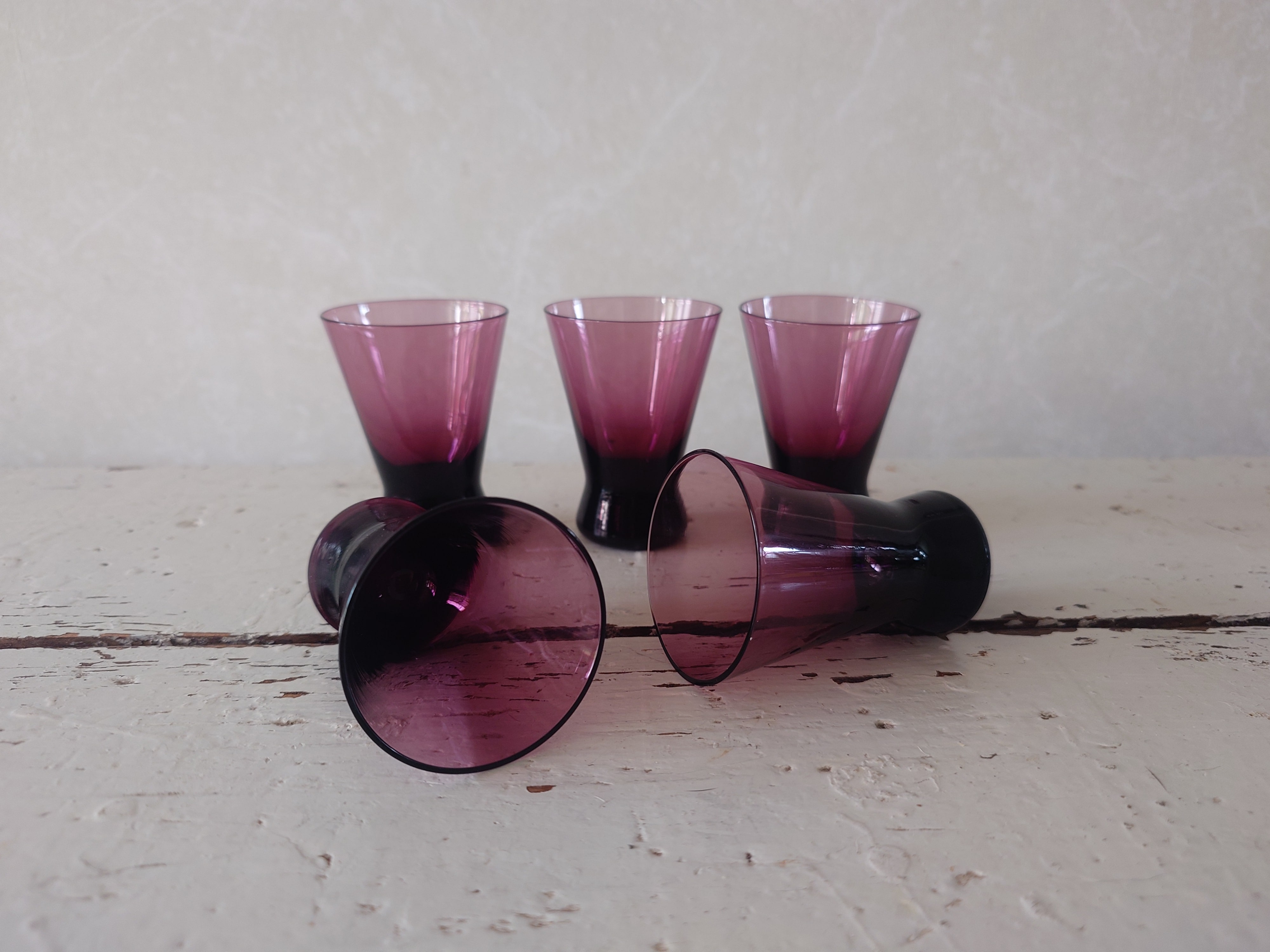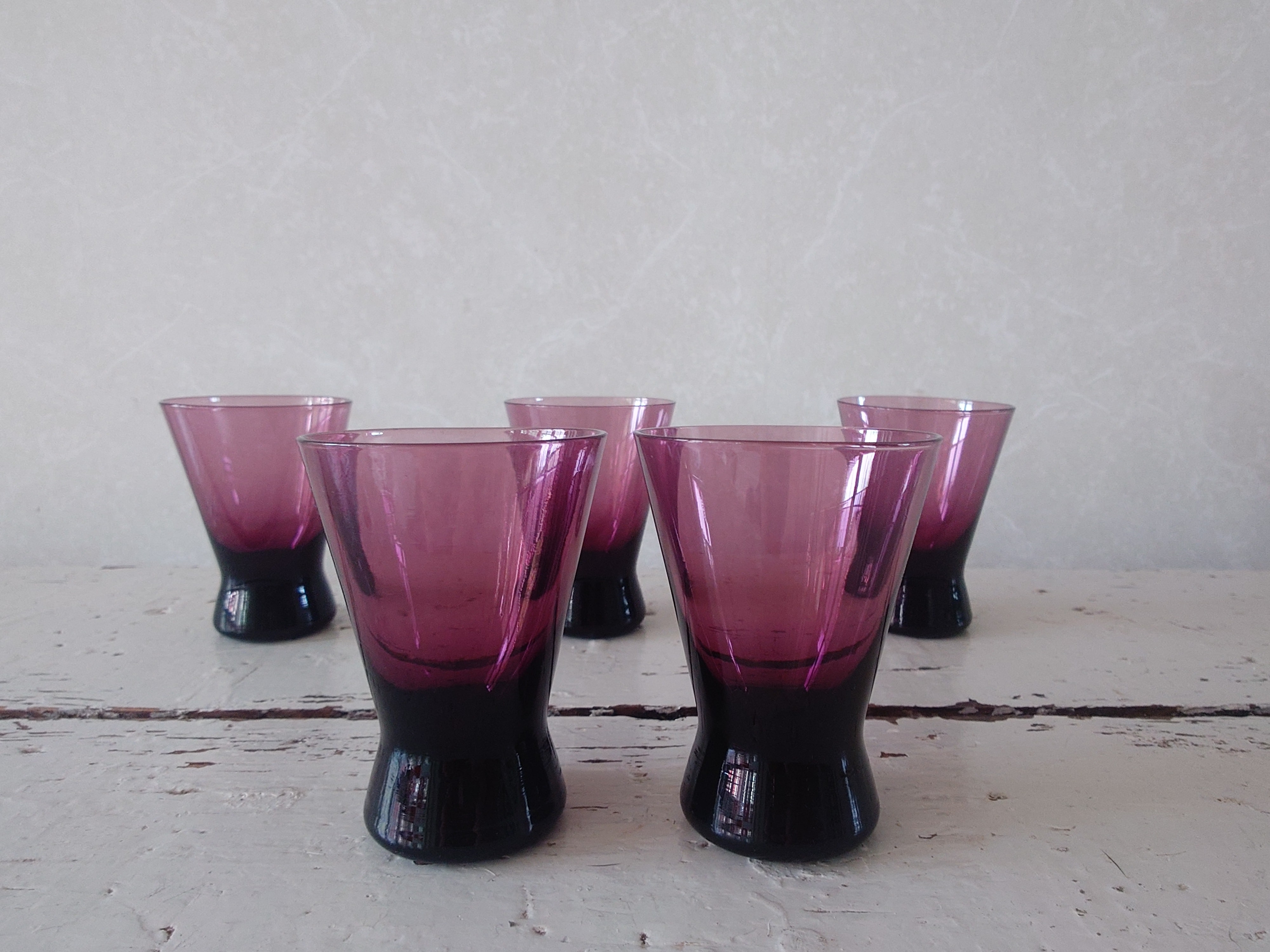 Hieno lila / viininpunainen pieni pikari. Kaikki ovat ehjiä ja hyväkuntoisia.