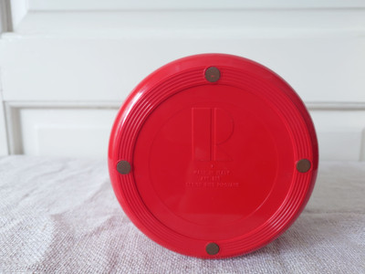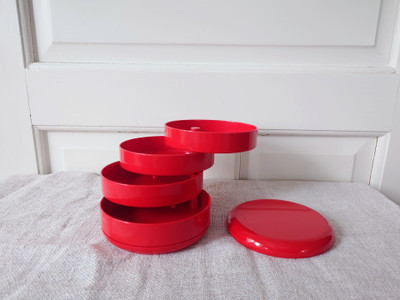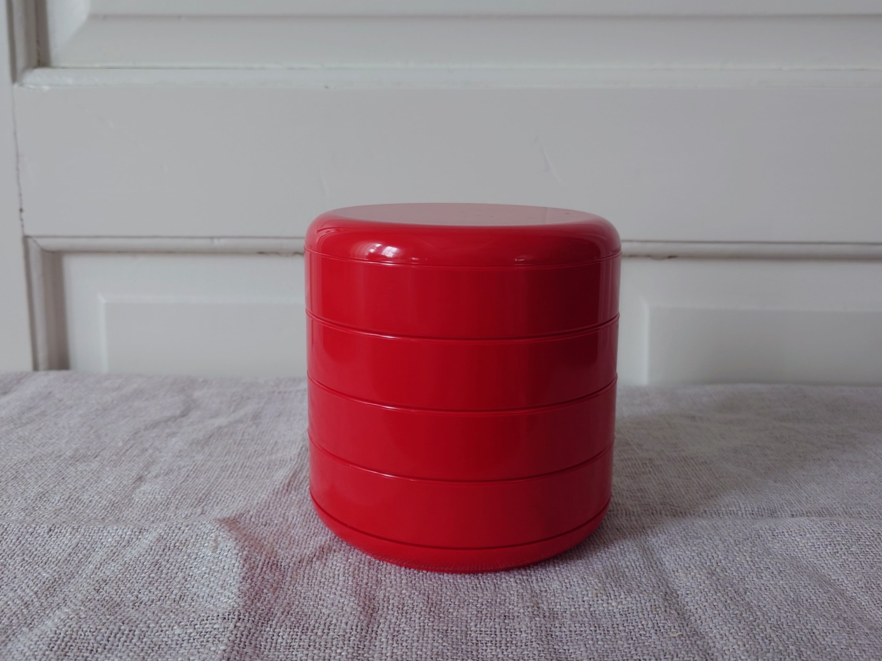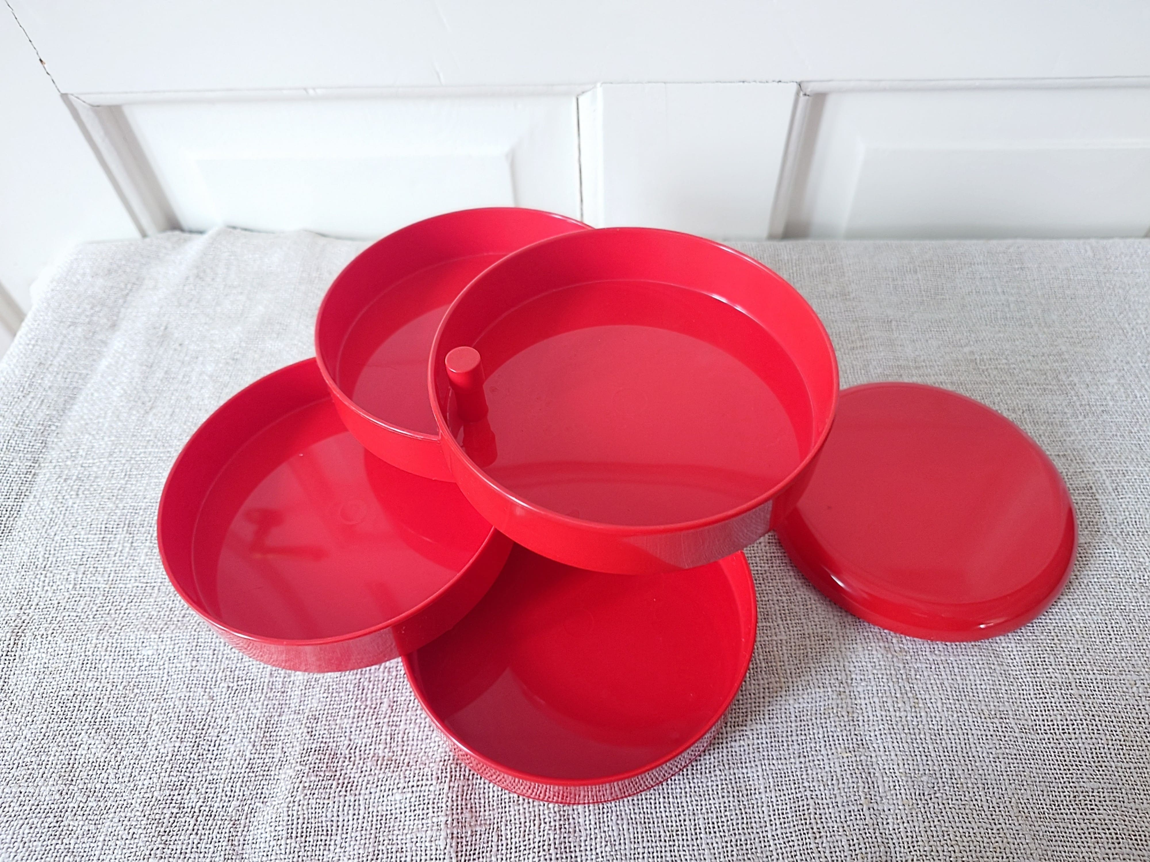 Italialainen retro muovipurkki, jossa on 4 pyörivää kerrosta ja päällimmäisenä kansi.
