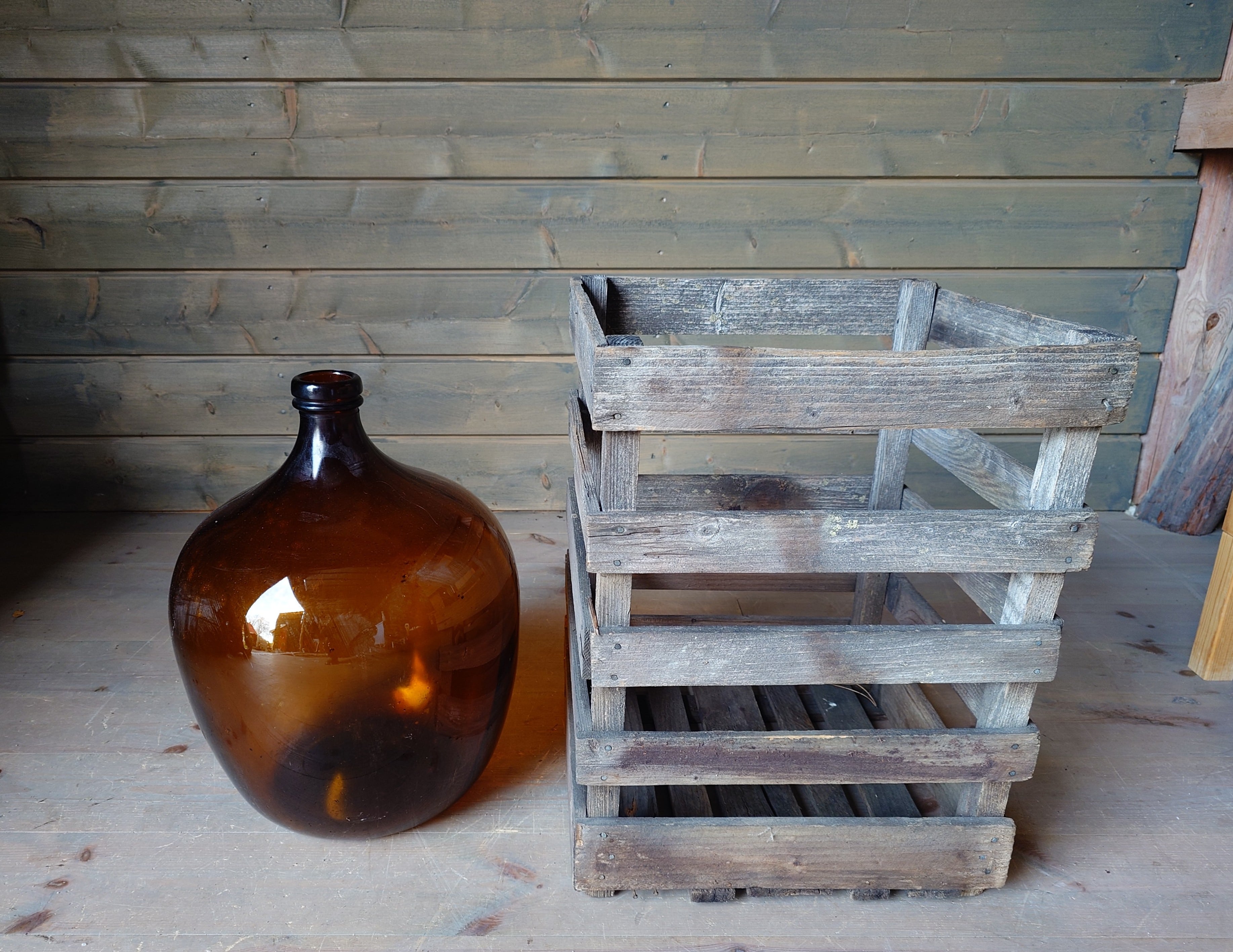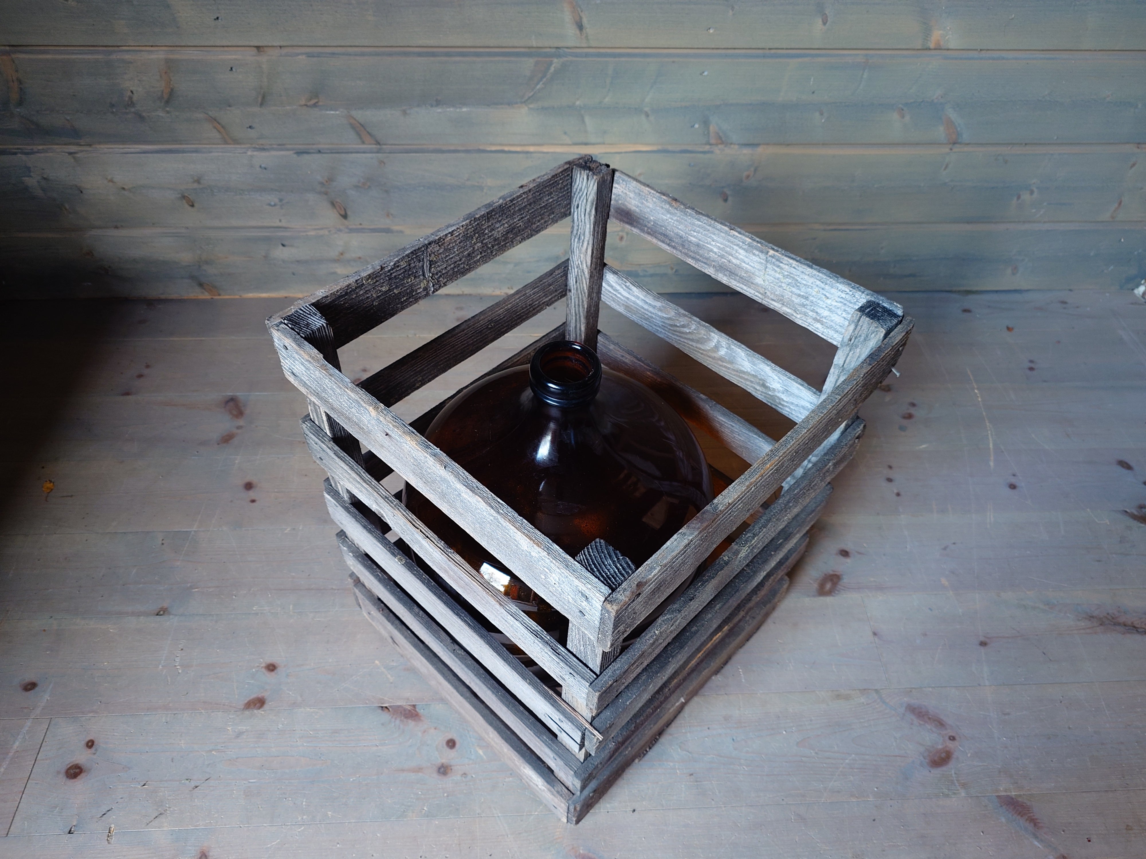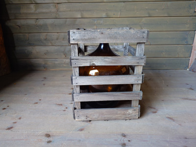 Puusta tehty kauniisti harmaantunut kehikko, jossa pulloa on säilytetty.