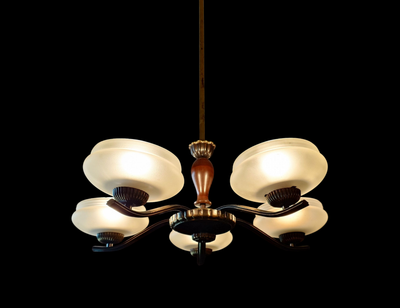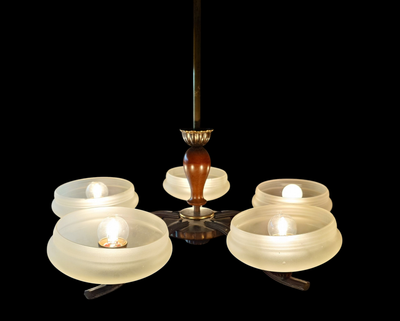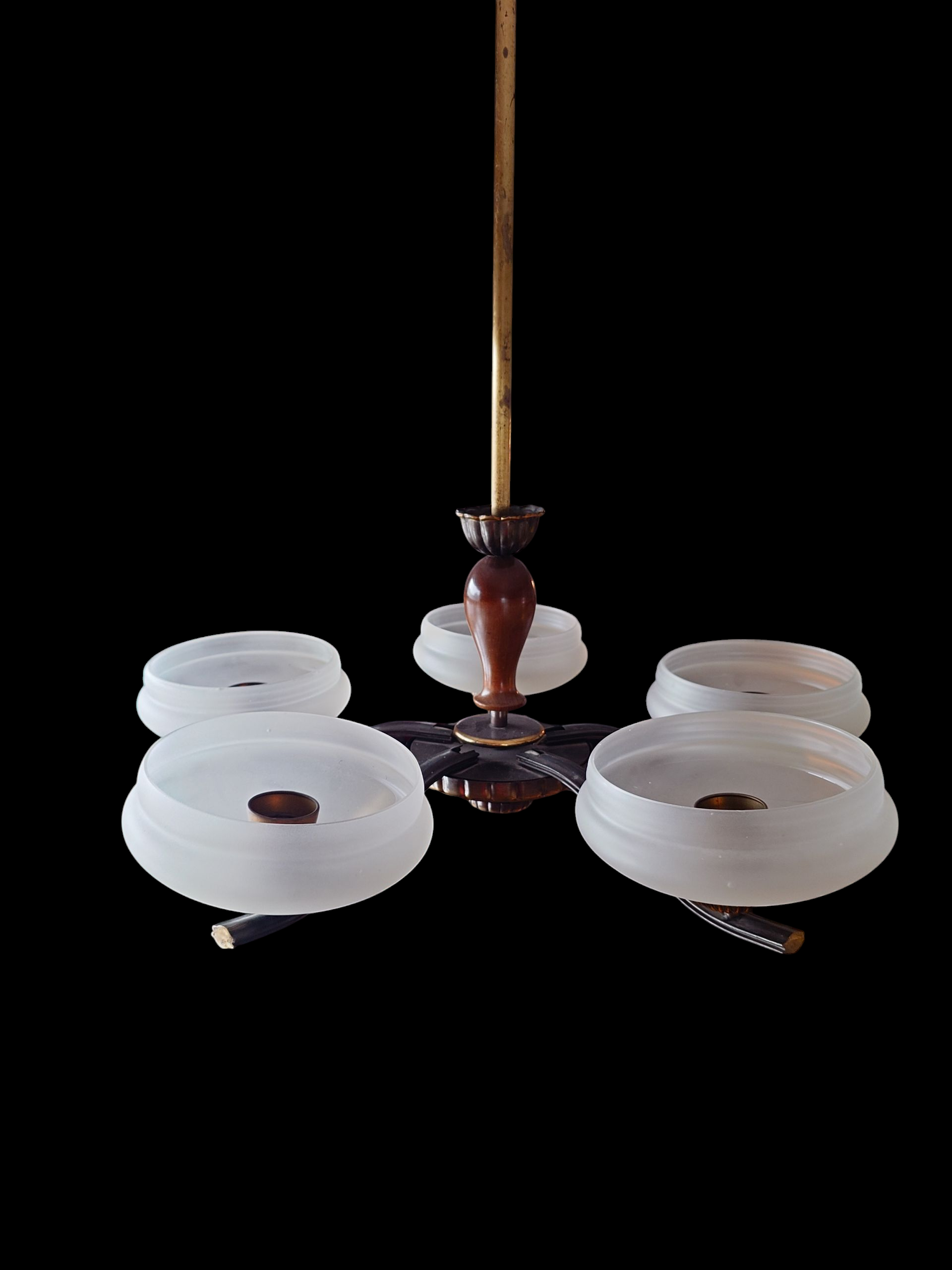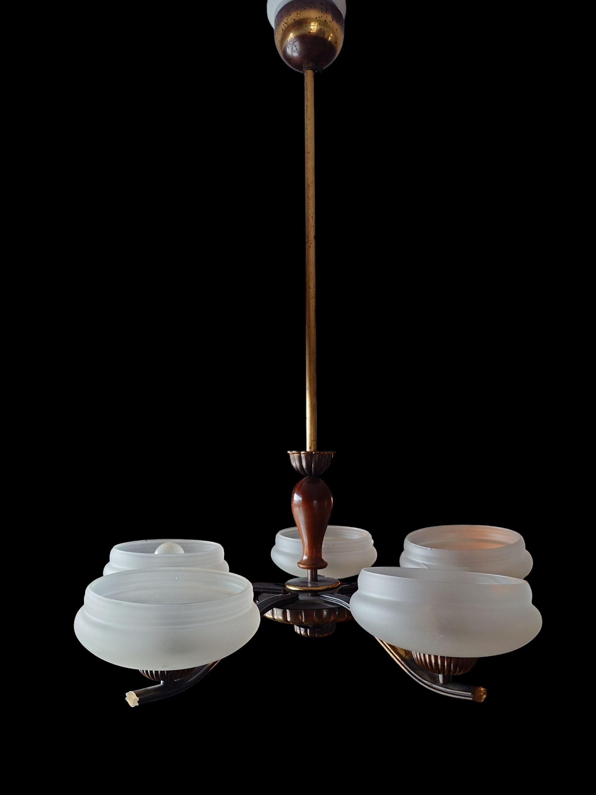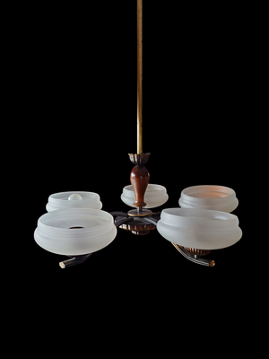 Art Deco tyyliä, jossa on matalat varjostimet mattapintaista lasia. Messinkirunko. Viisi valopistettä.