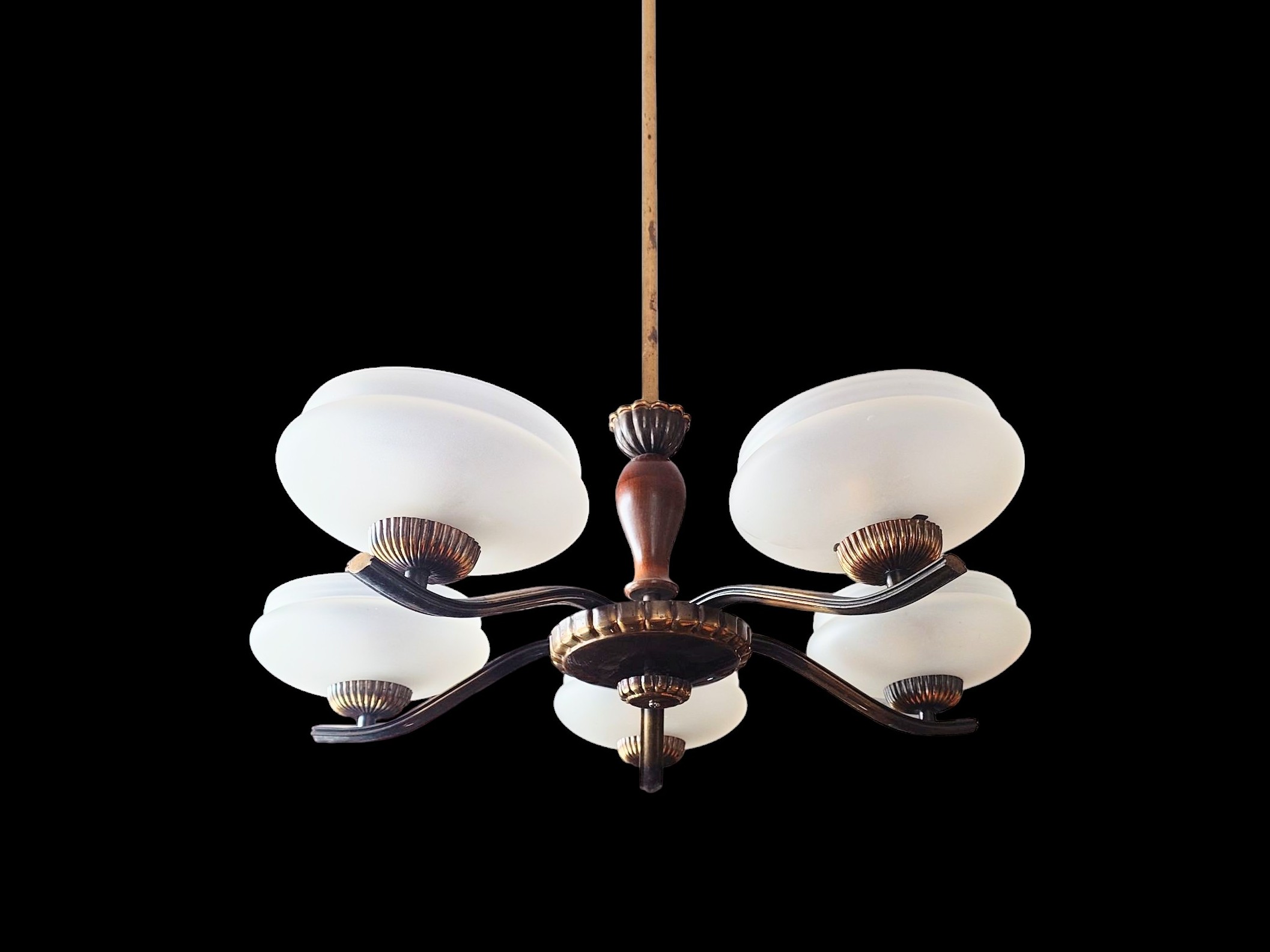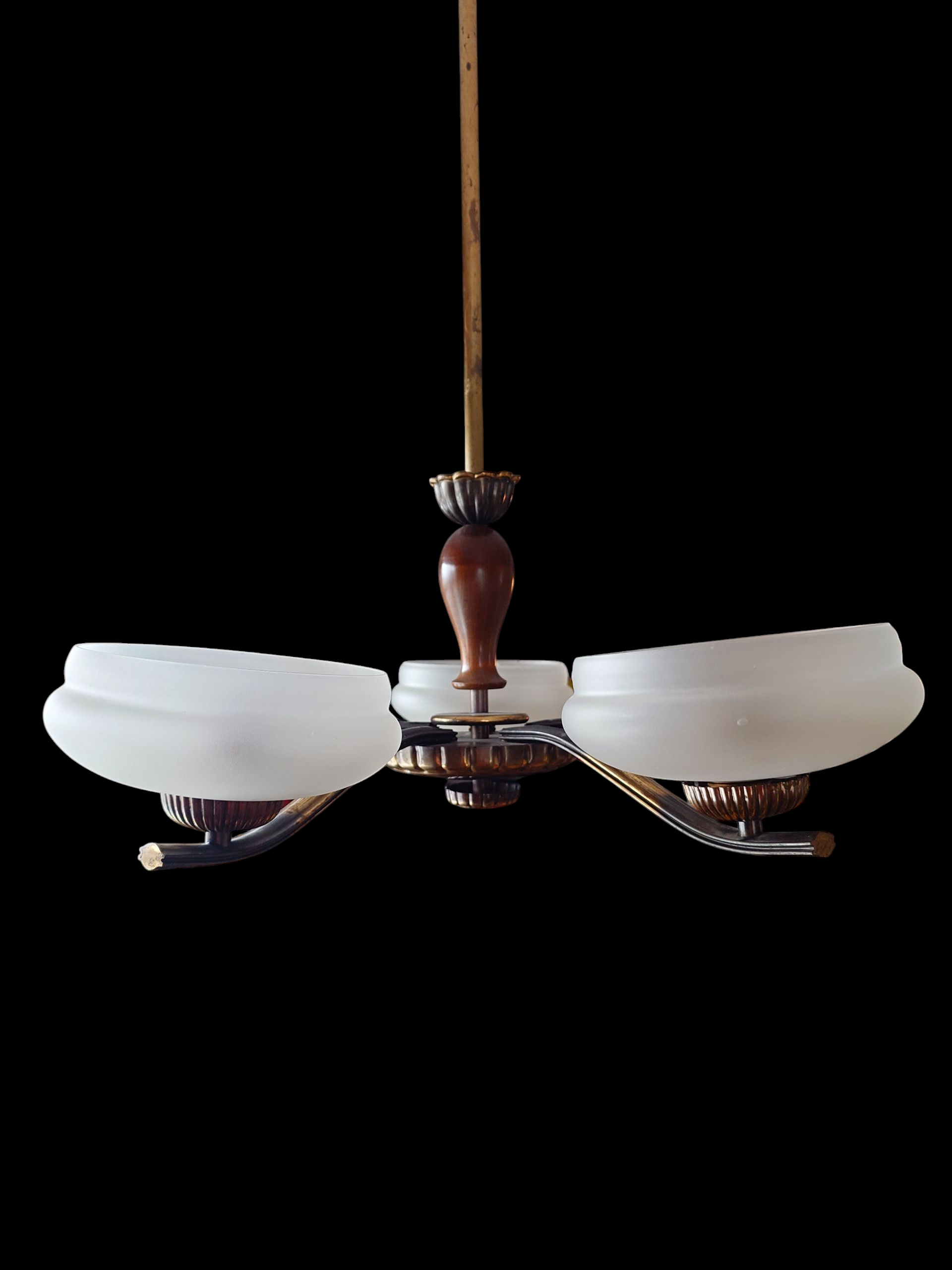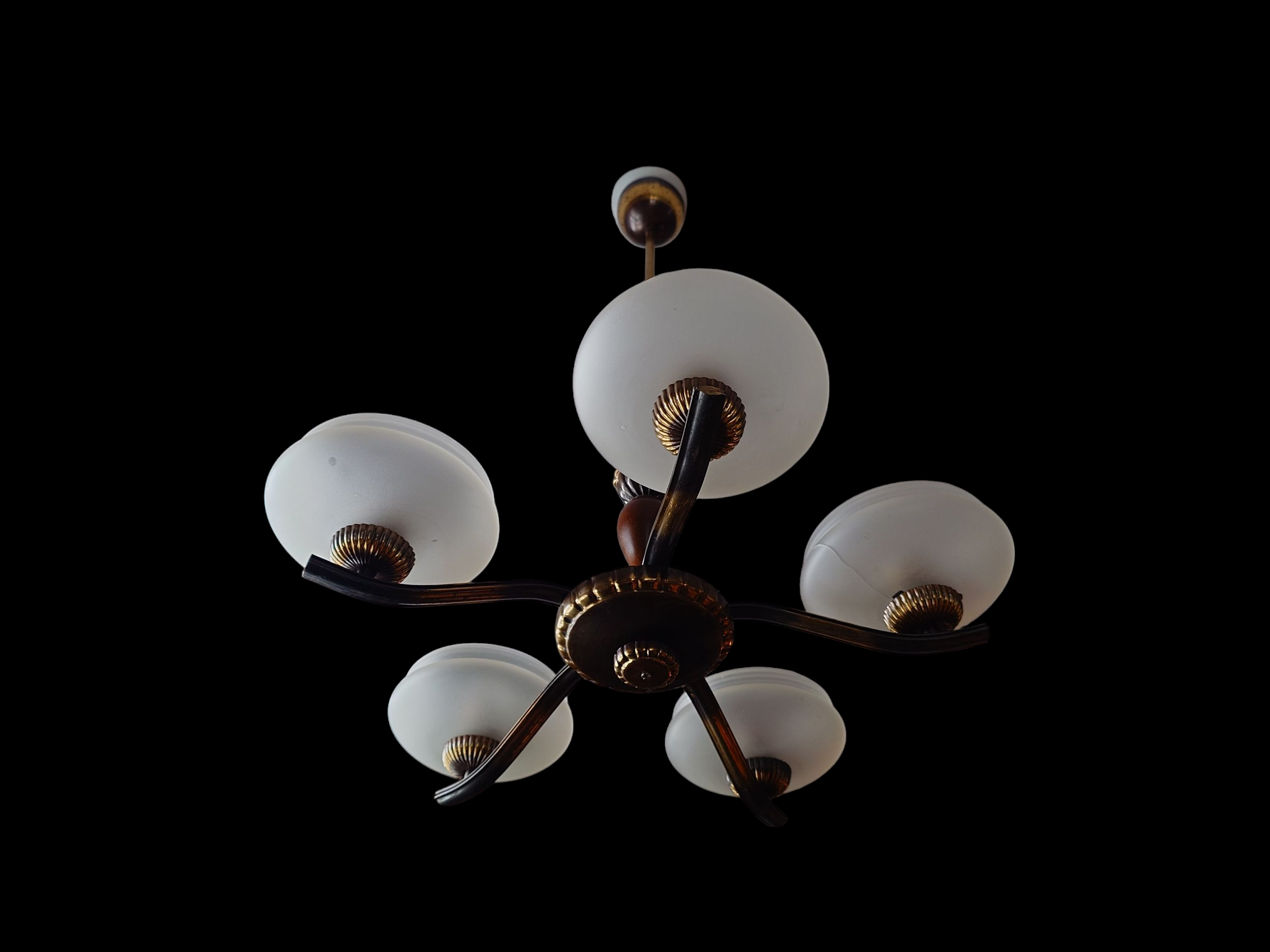 Art Deco tyyliä, jossa on matalat varjostimet mattapintaista lasia. Messinkirunko. Viisi valopistettä.