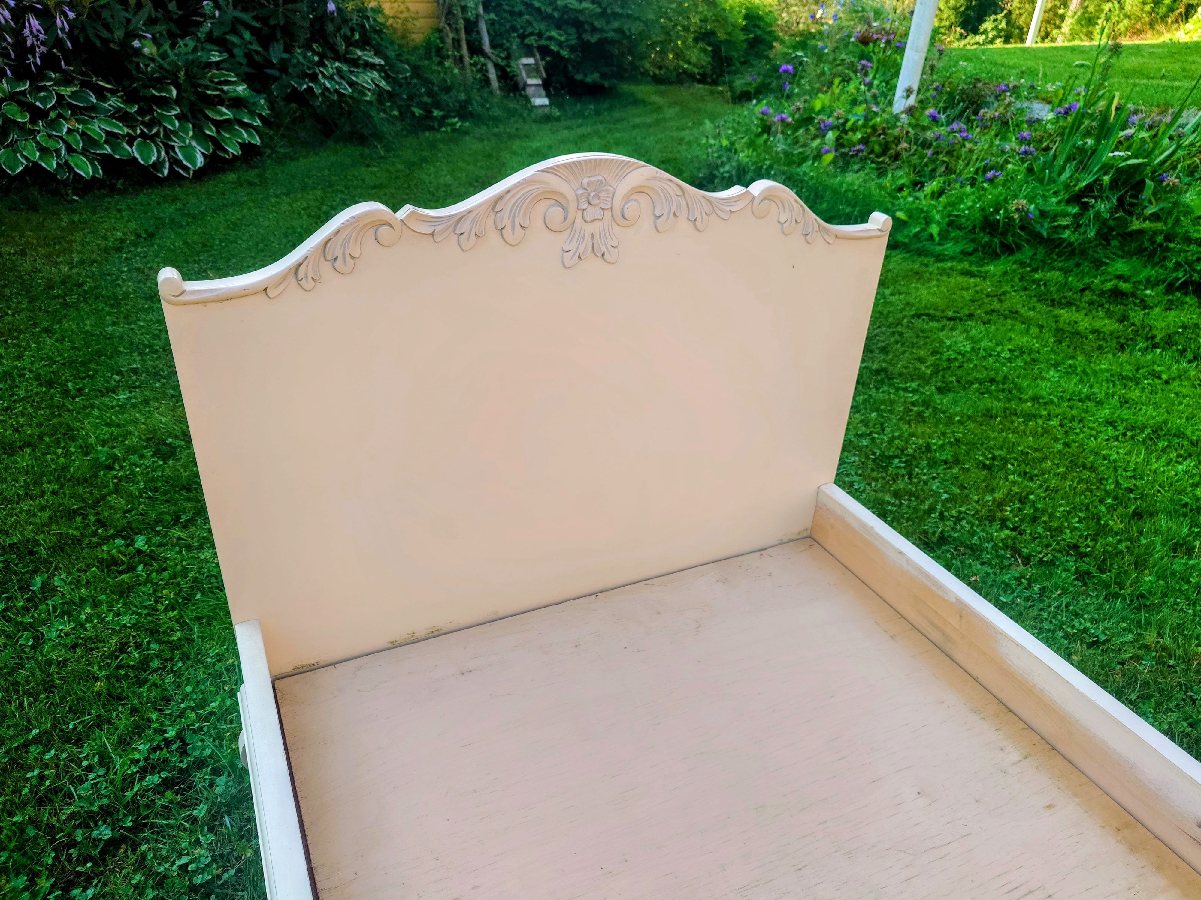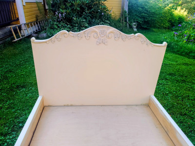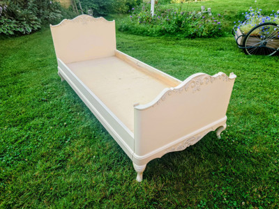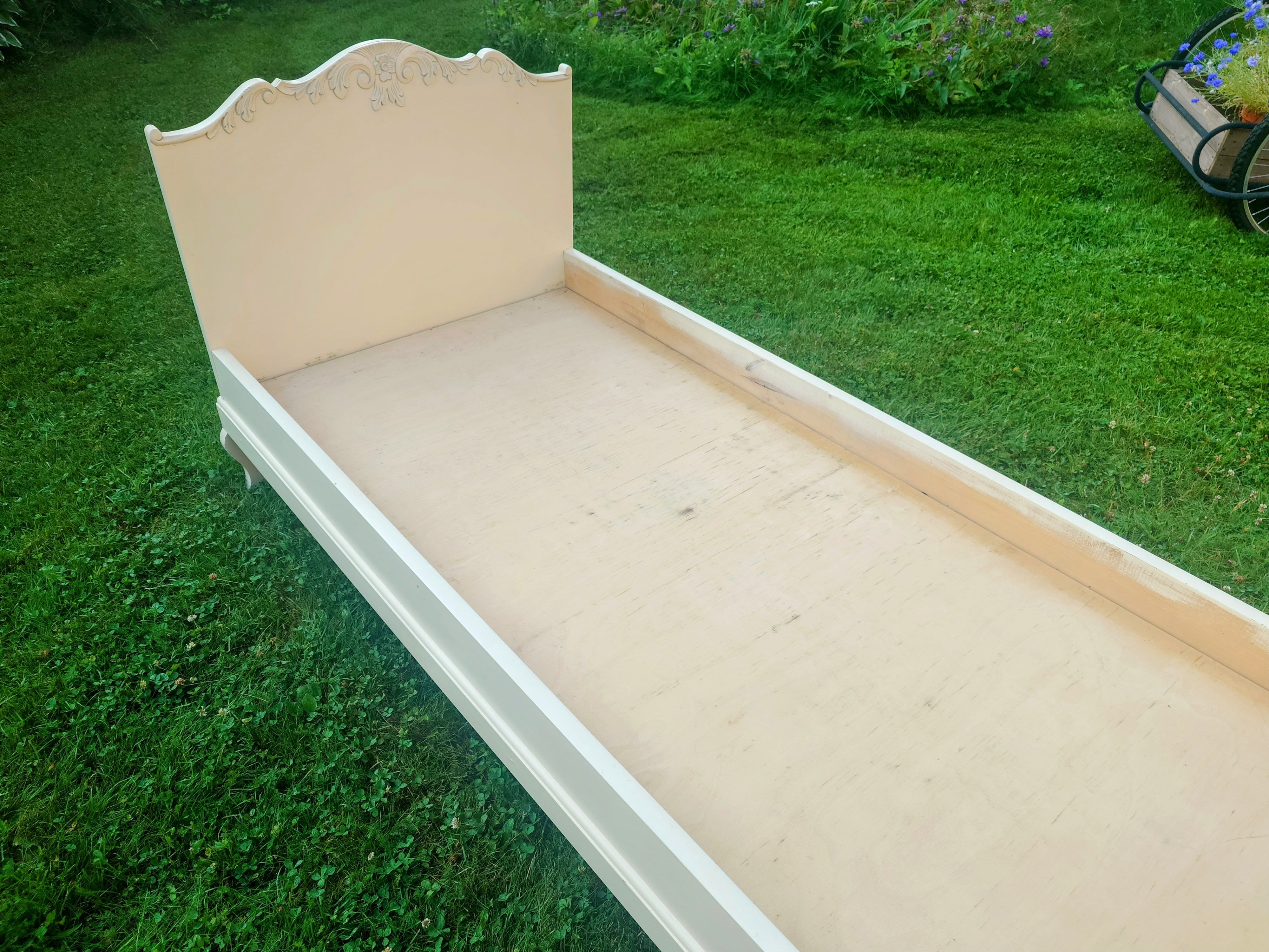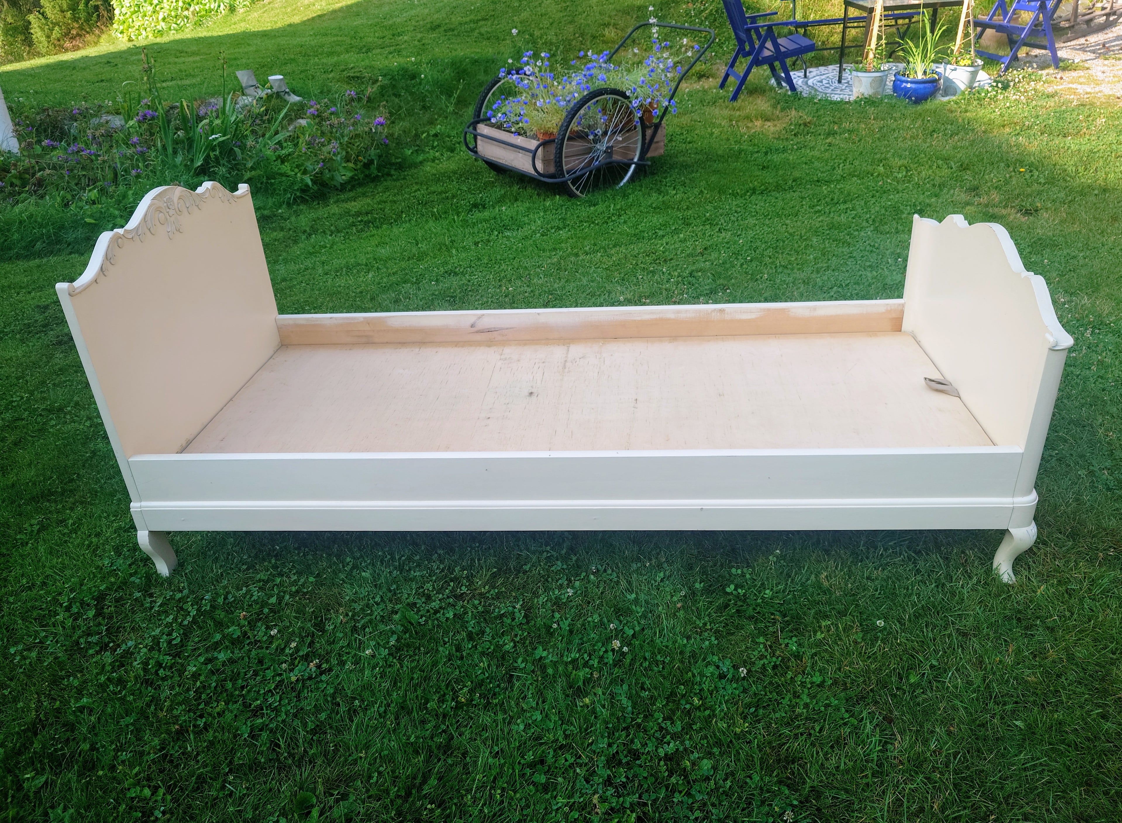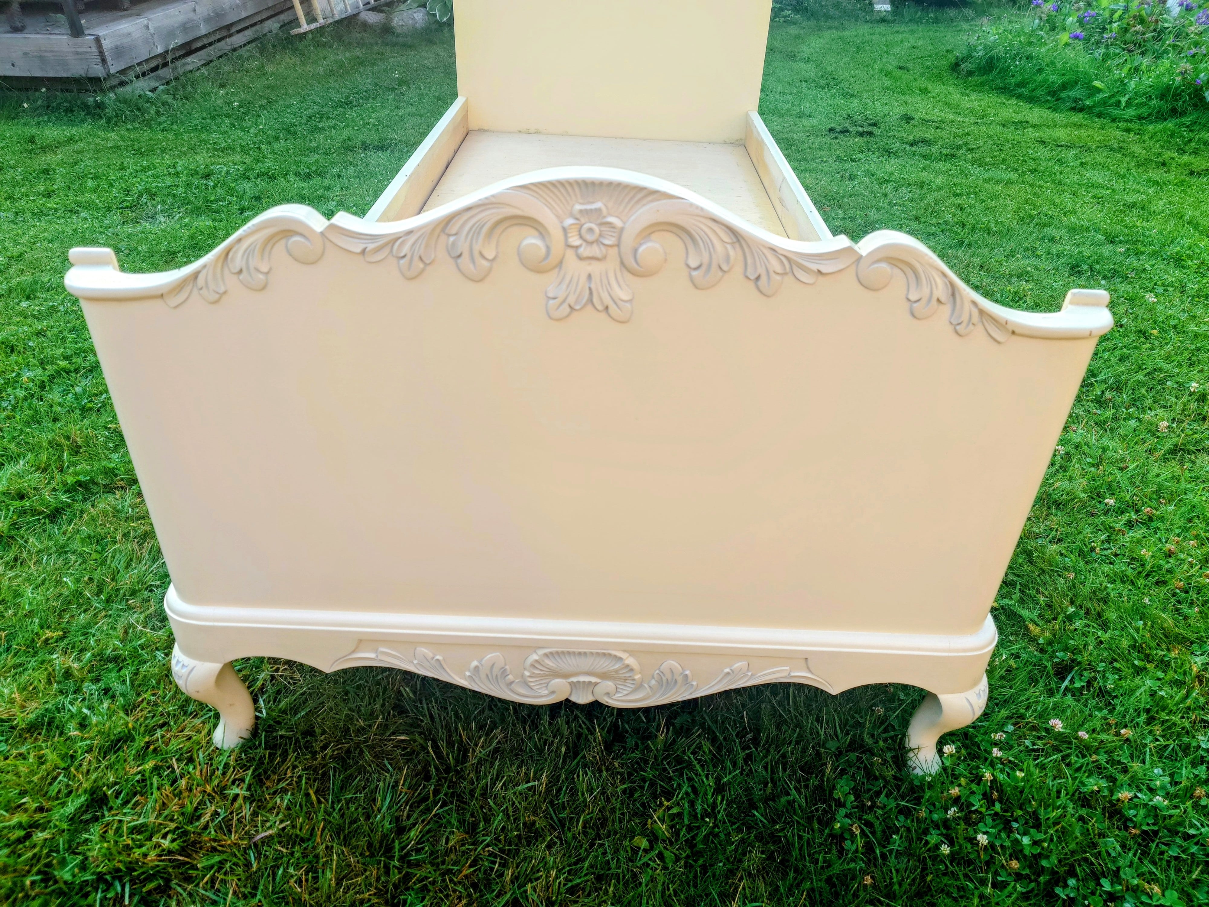 Yhden hengen sänky talonpoikaisrokoota. Luonnonvalkoinen/kermanvärinen.