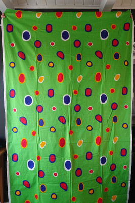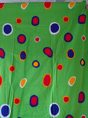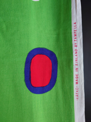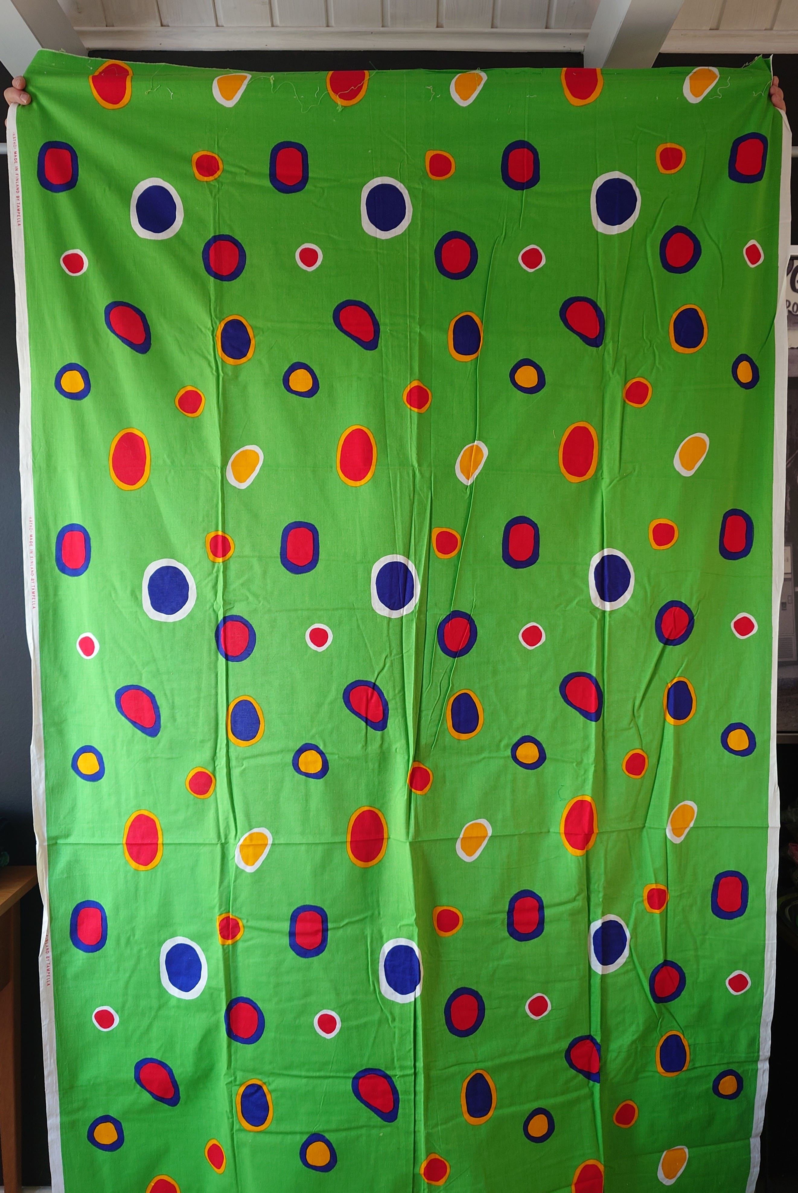 Kuosin nimi on Kätkö. Puuvillakangas, jossa on värikkäitä pyöreitä kuvioita kirkkaanvihreällä pohjalla.