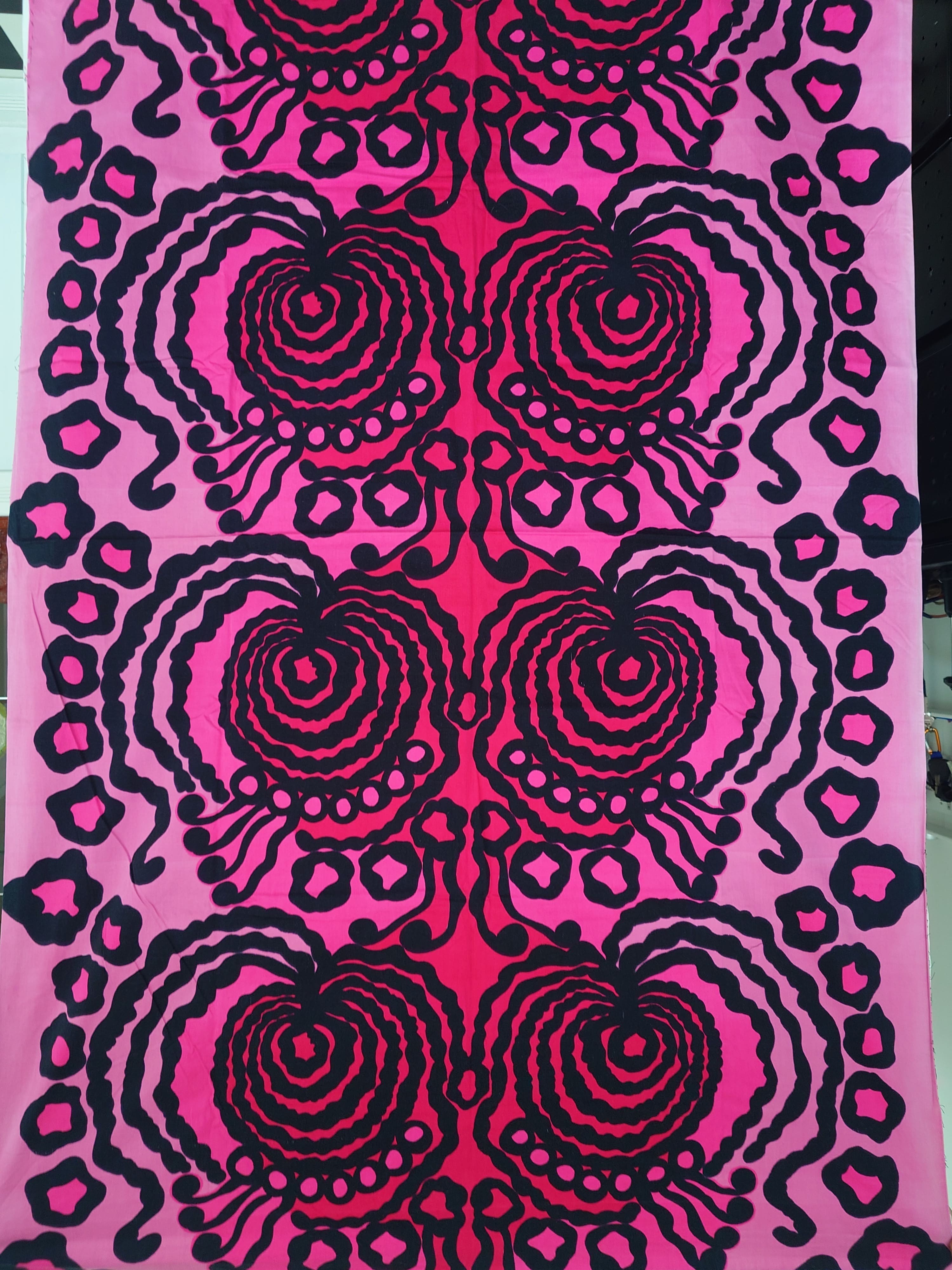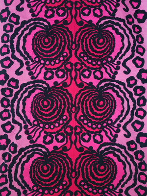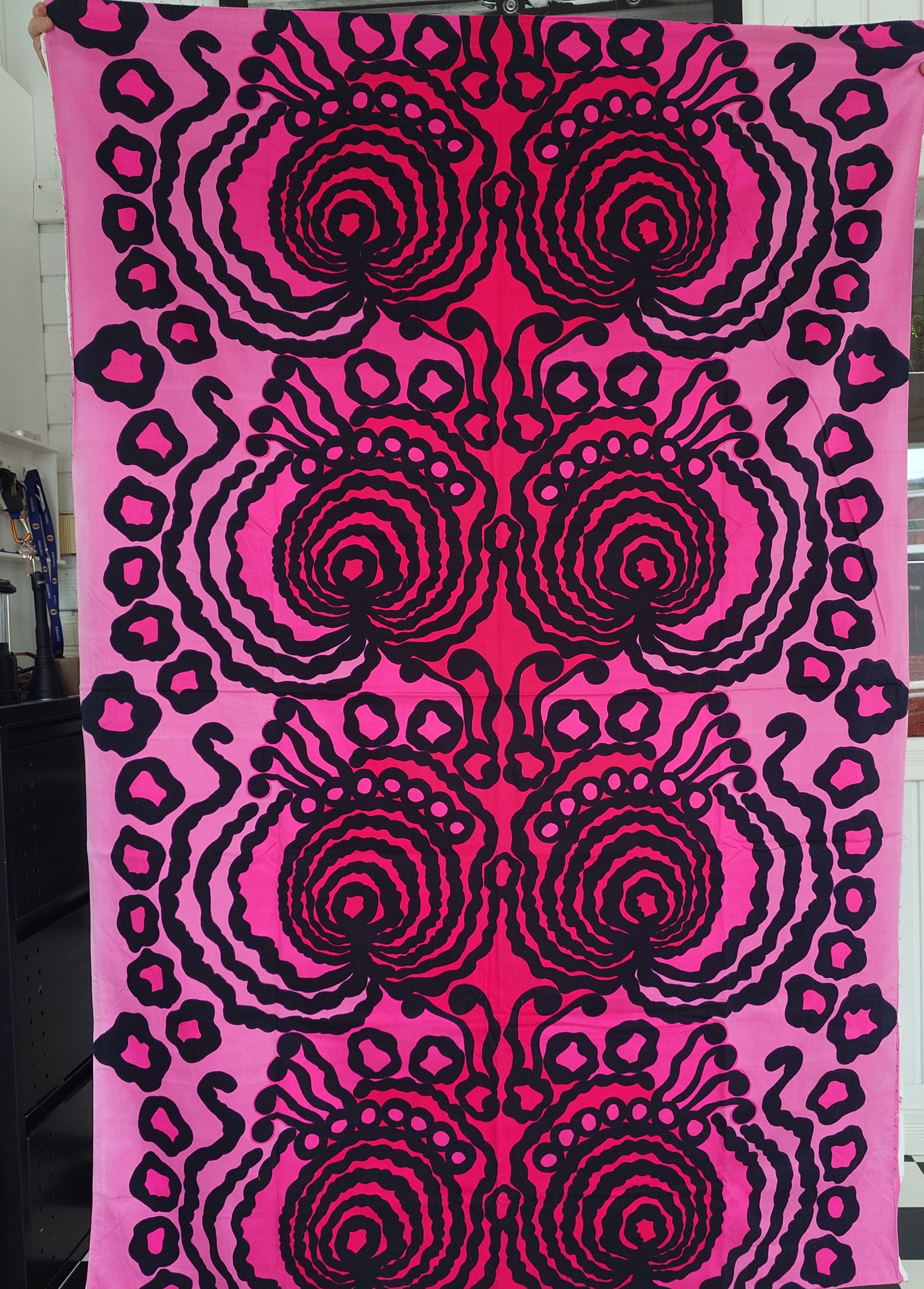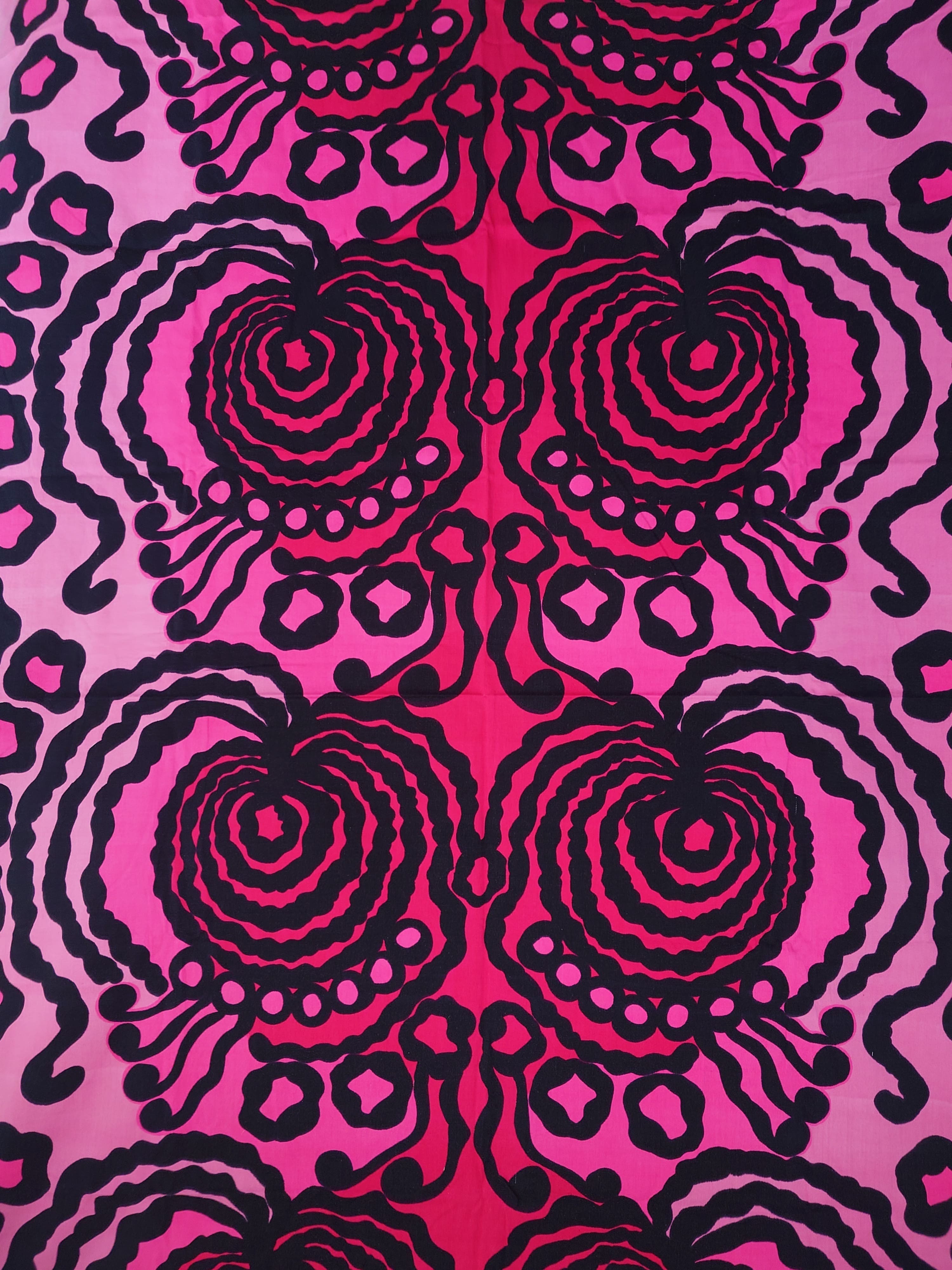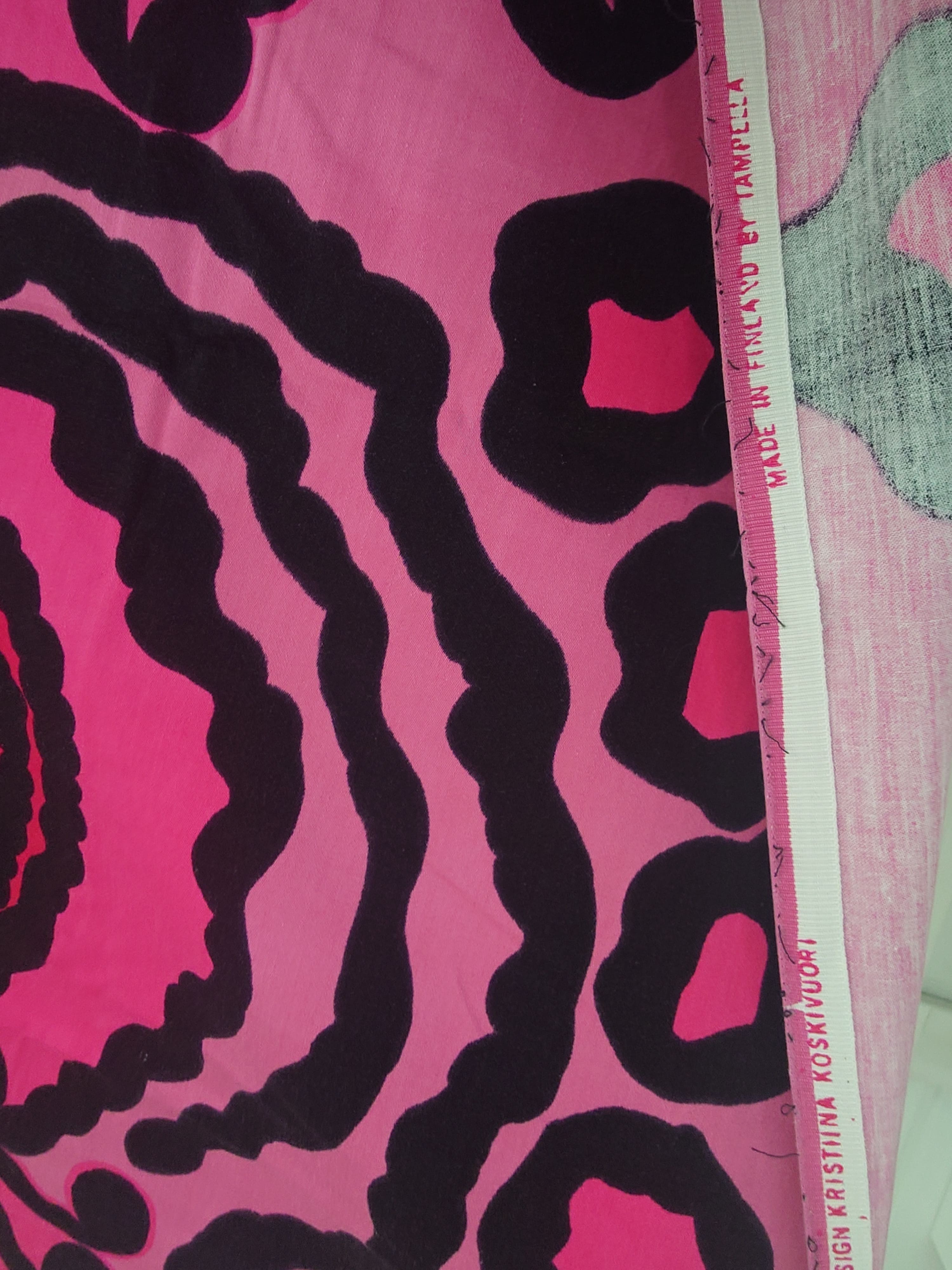 Hieno ja harvinainen abstrakti kuosi, kuin pyörteitä. Kangas on puuvillasatiinia ja värit kirkkaat.