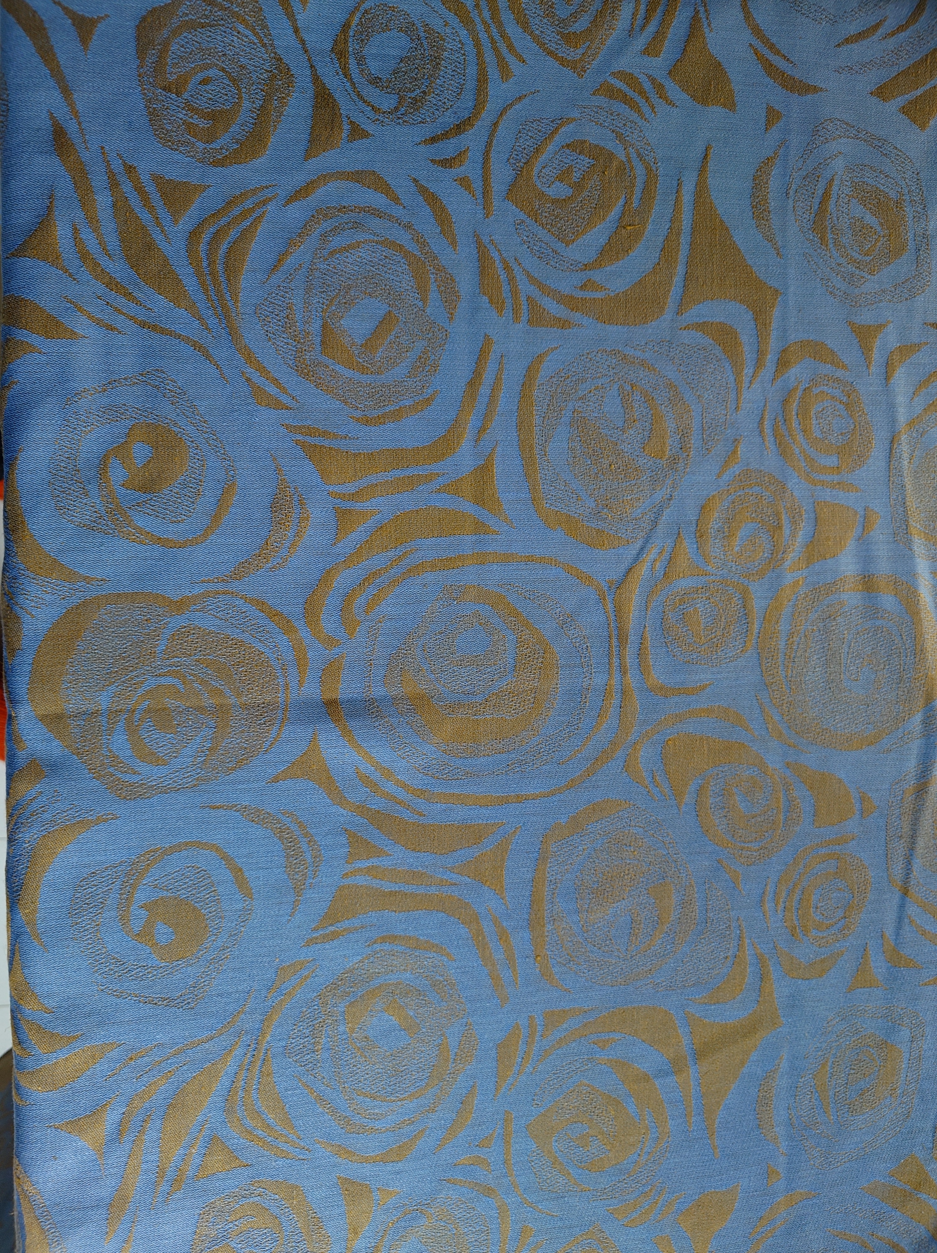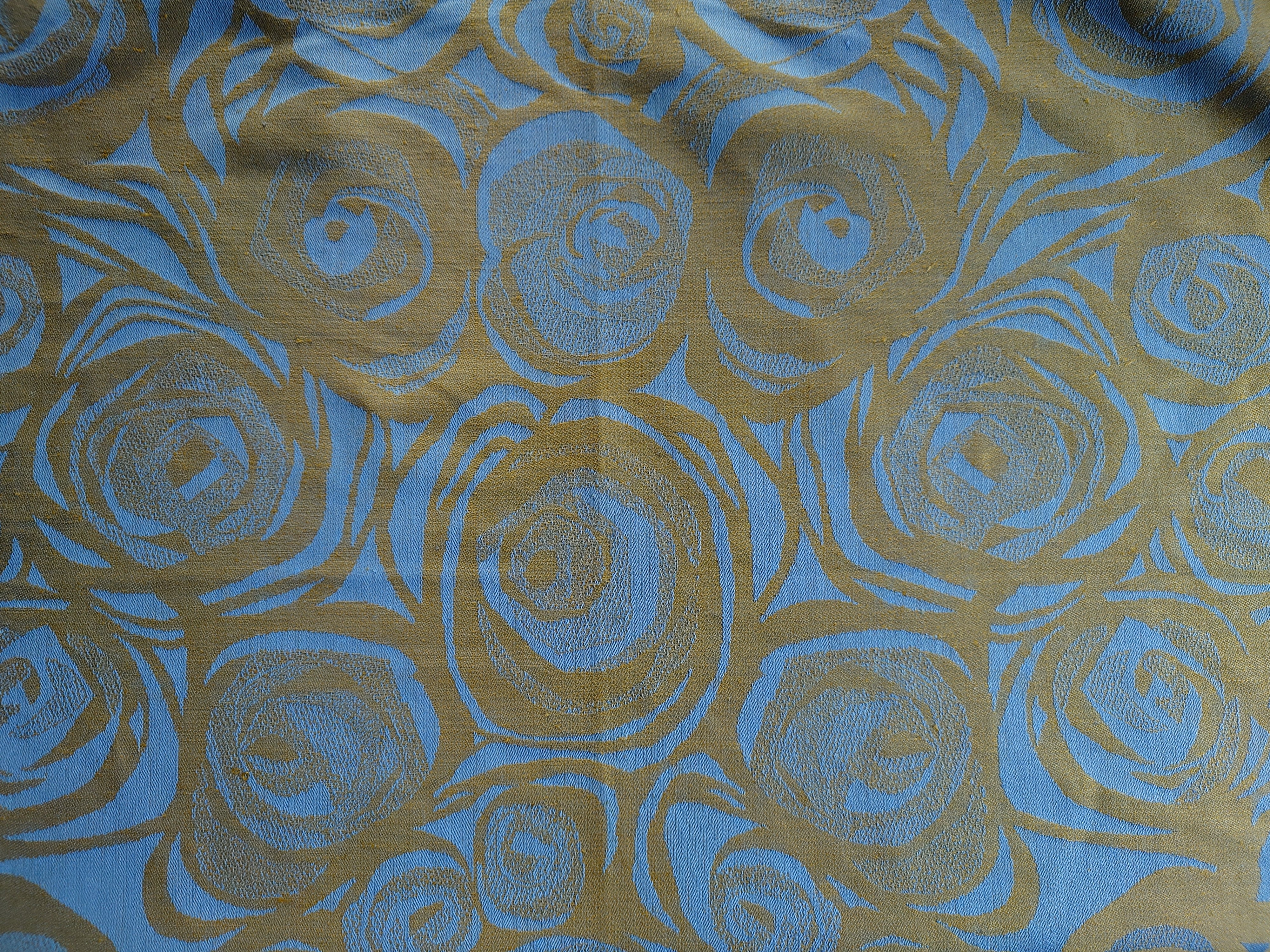 Kudottu niin, että värit ovat vastakkaiset toisella puolella. Ruusukuvioissa toistuu sininen ja hopea, tietyssä valossa hopea taittaa kultaan.