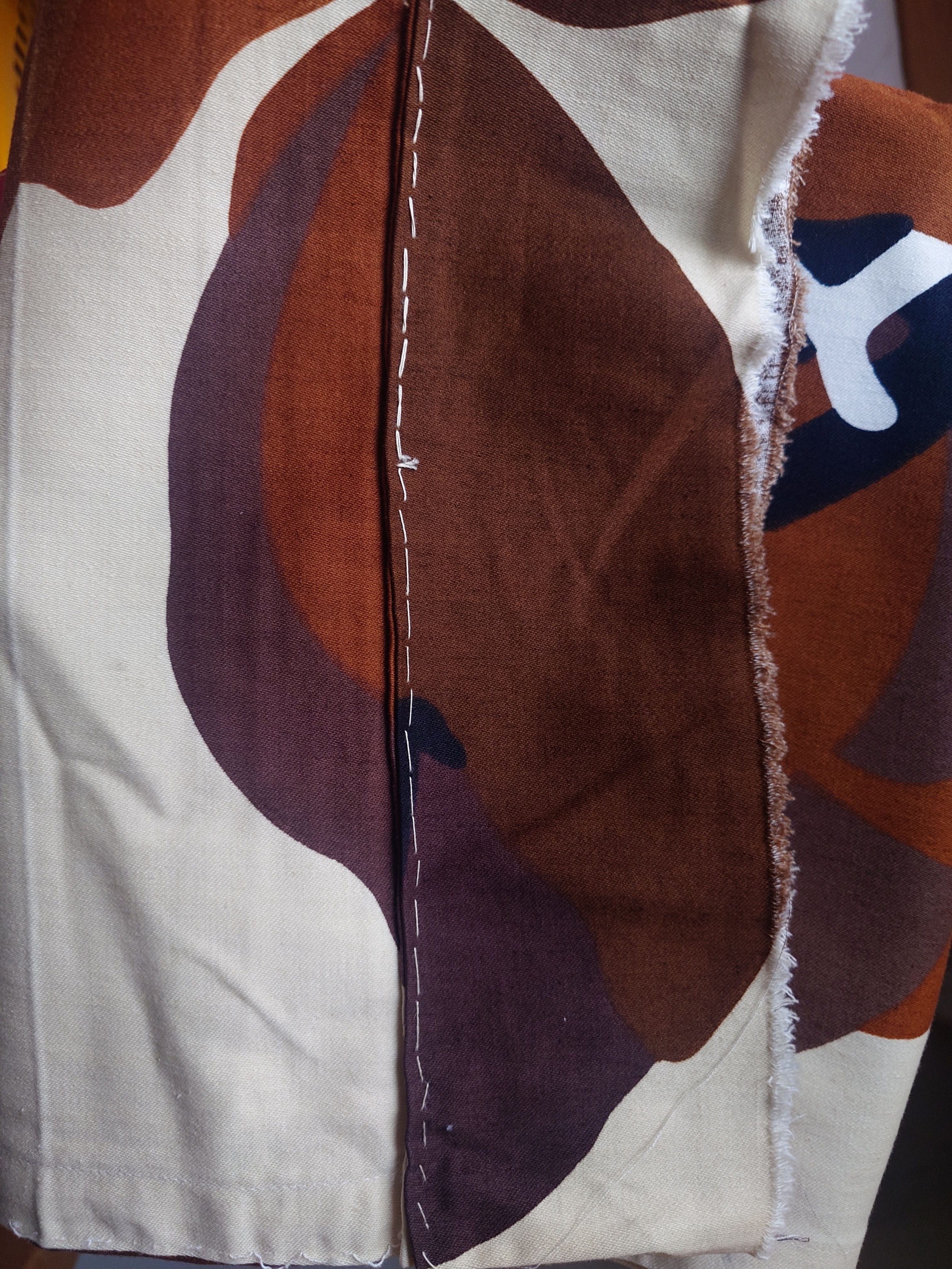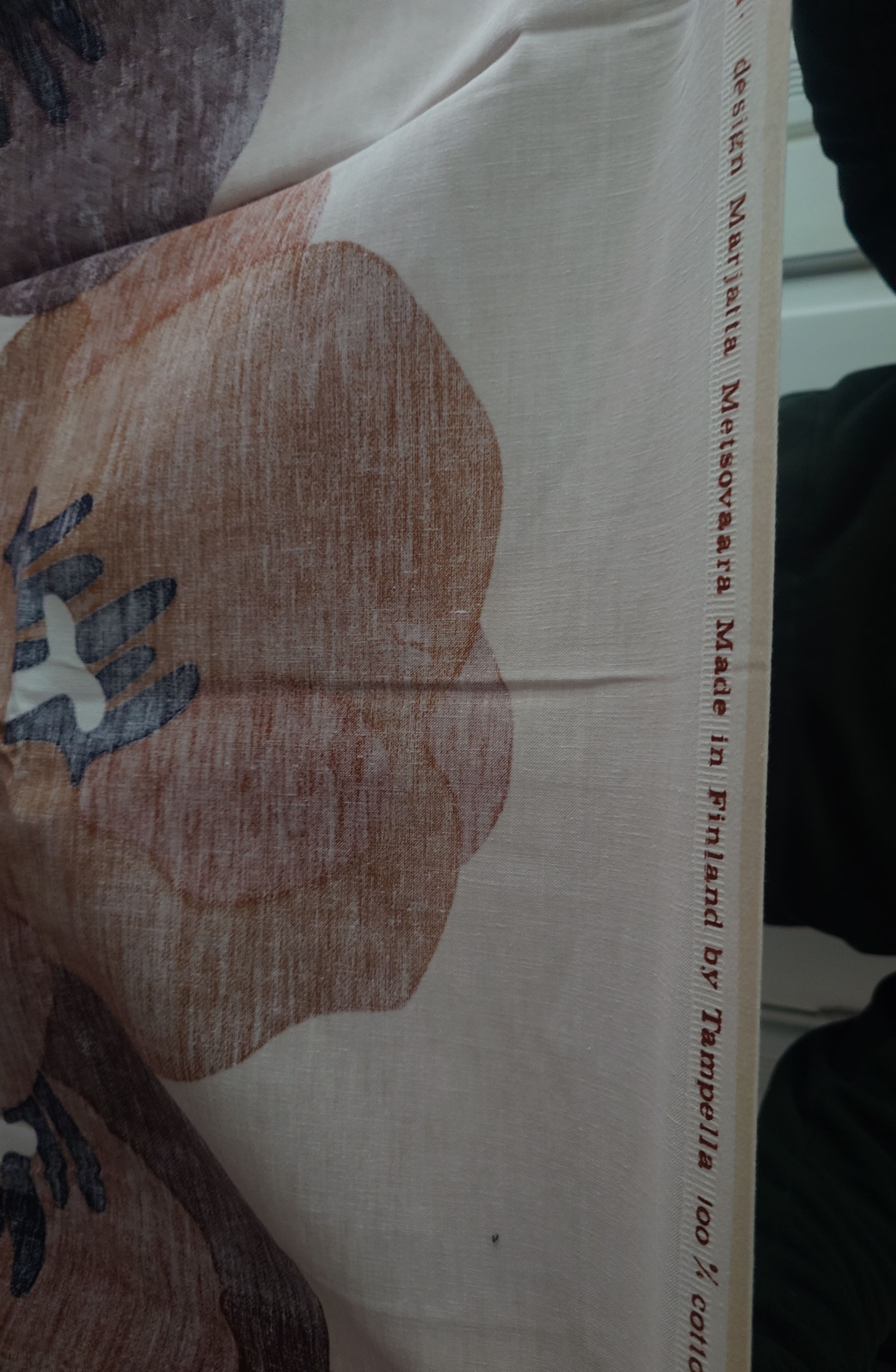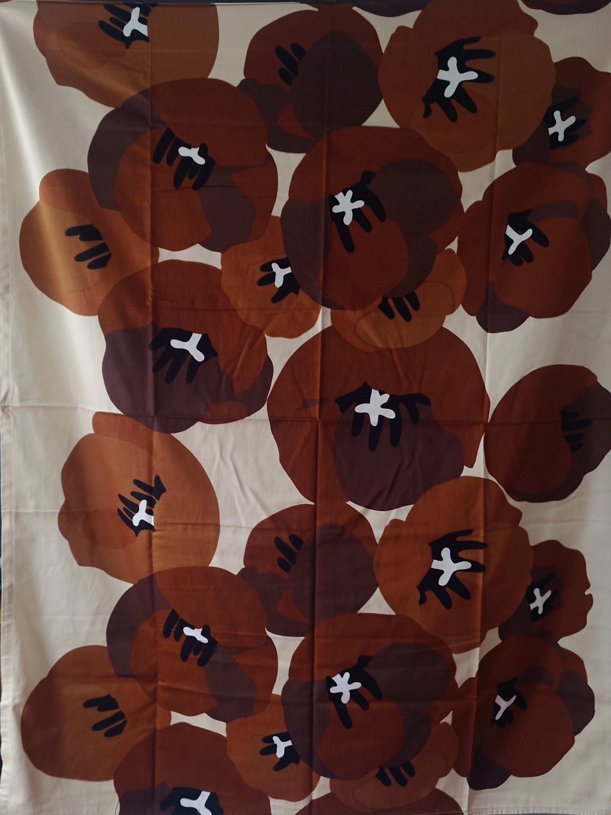 Tausta on vaalea beessi, kukat eri sävyisiä ruskeita. Puuvilla / puuvillasatiini.