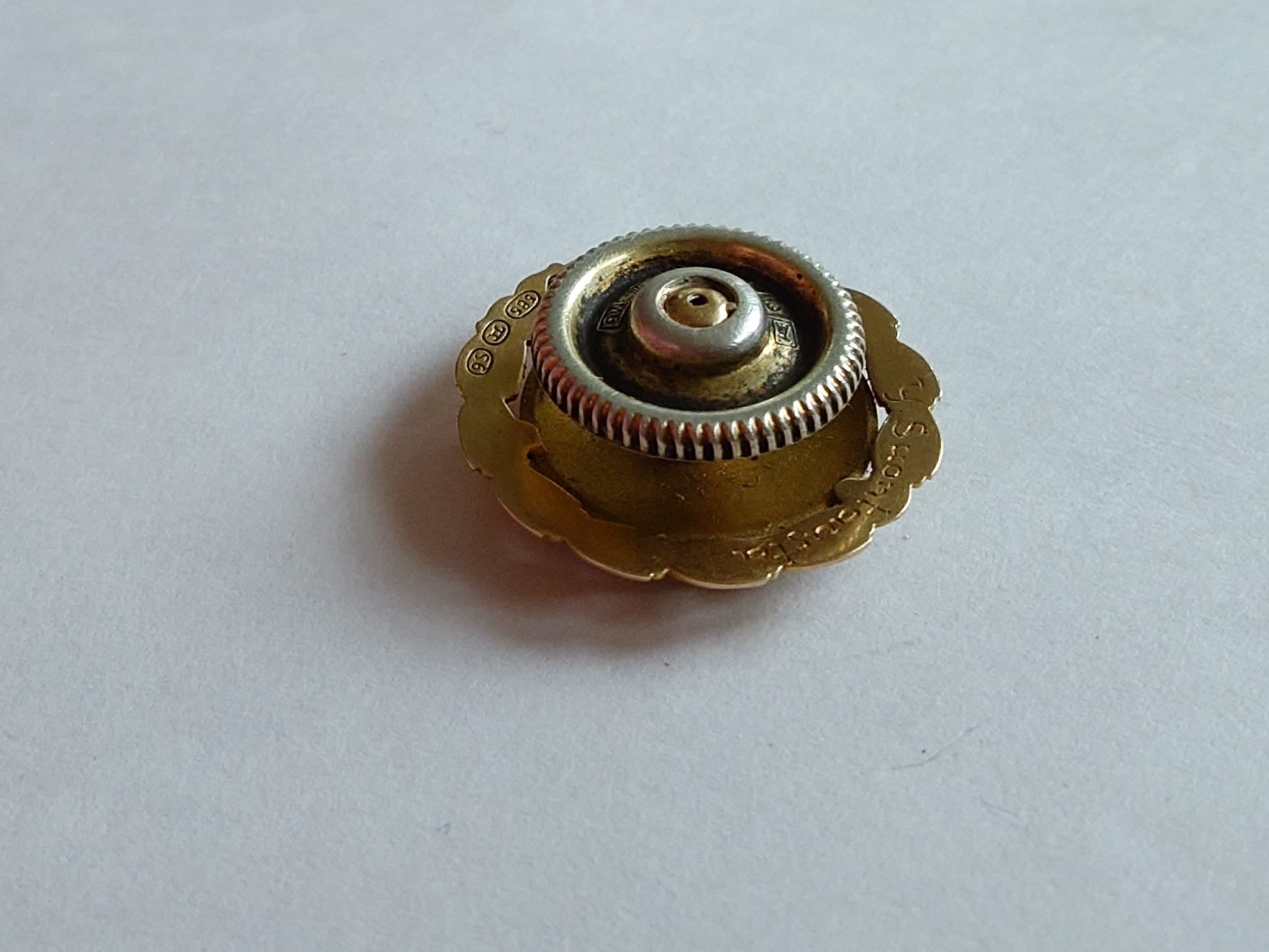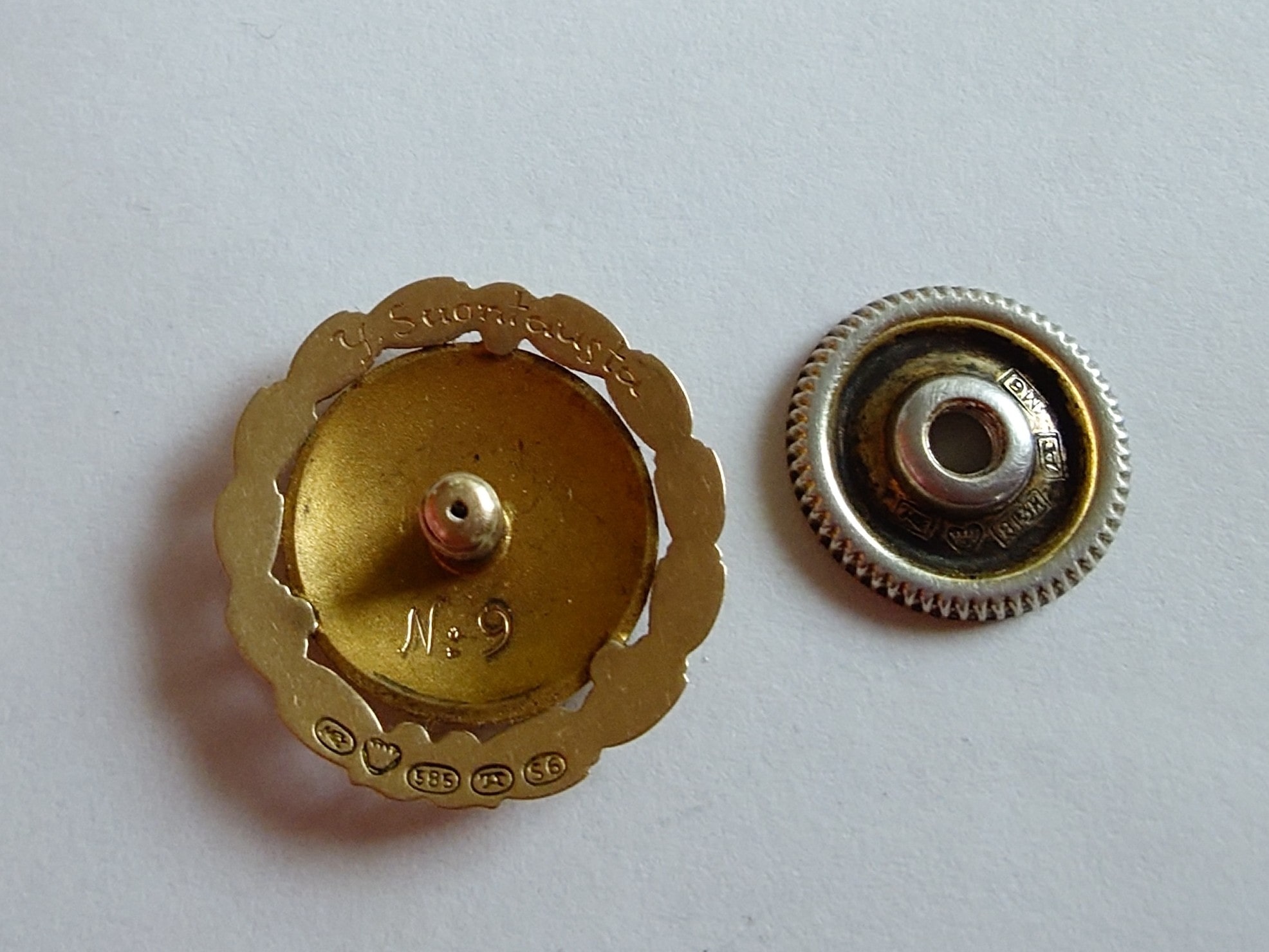 Ansiomerkin keskiö on emalikoristeinen ja sen ympärillä oleva köynnös on 14 karaatin kultaa. Leimat 585 ja S6. Merkin takana on kaiverrus Y. Suontausta nro 9. Merkin paino on 3g.