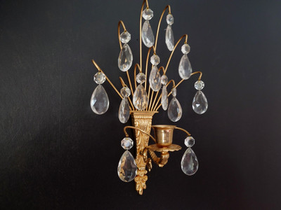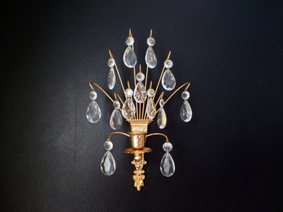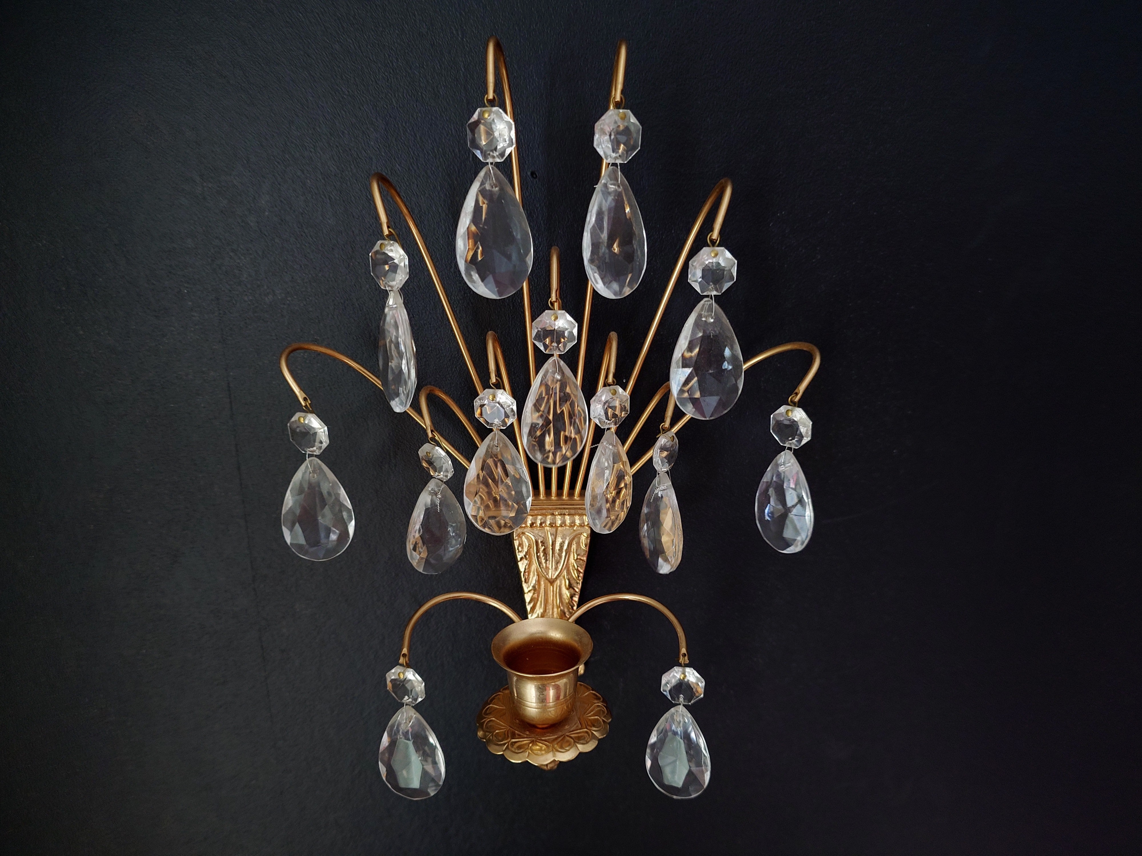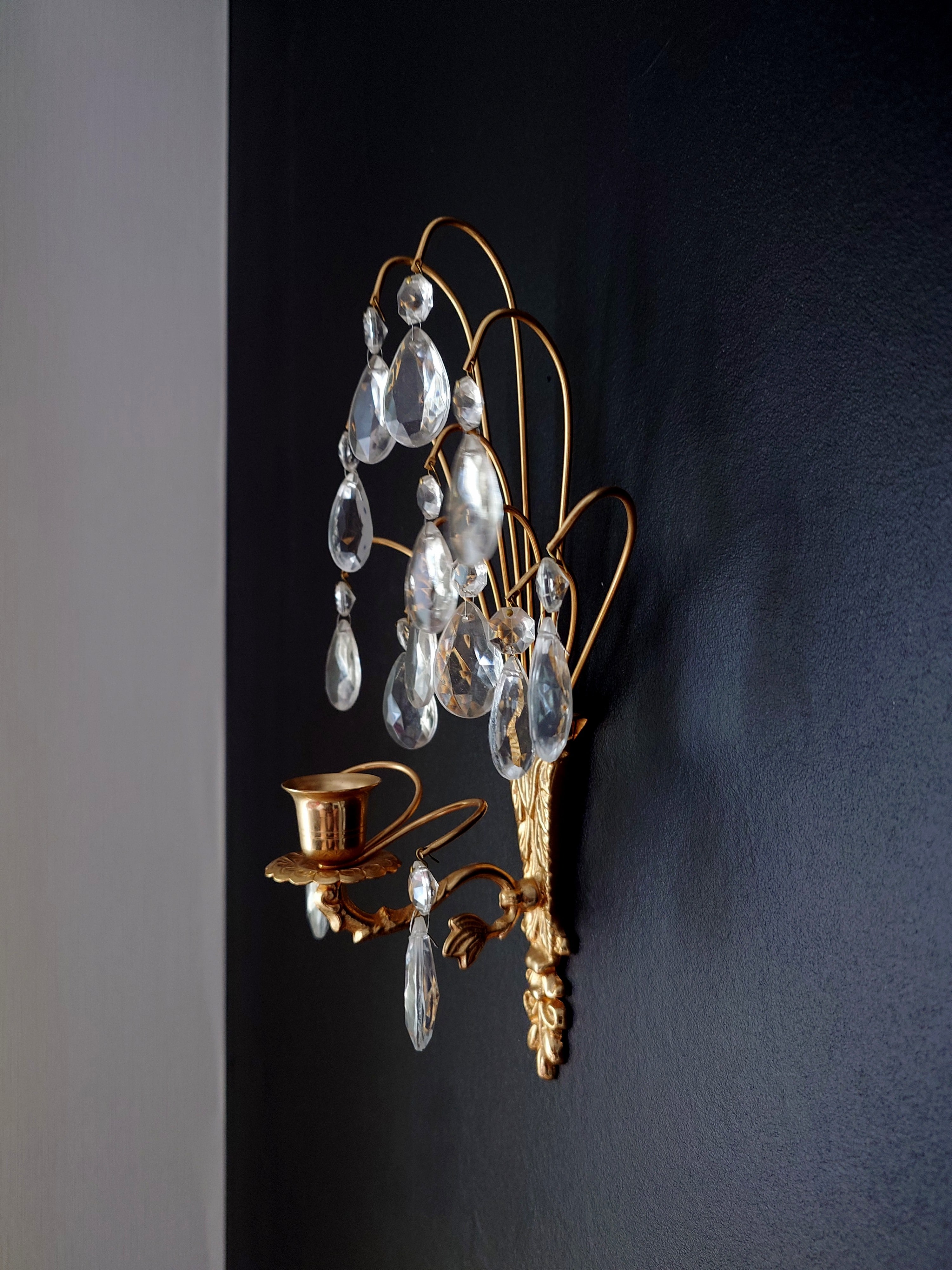 Seinään kiinnitettävä kynttilänjalka, jossa on kristallikoristeita ja messinkirunko.