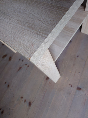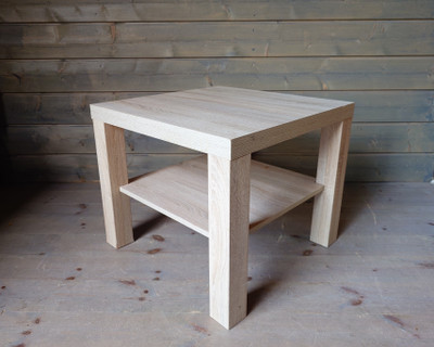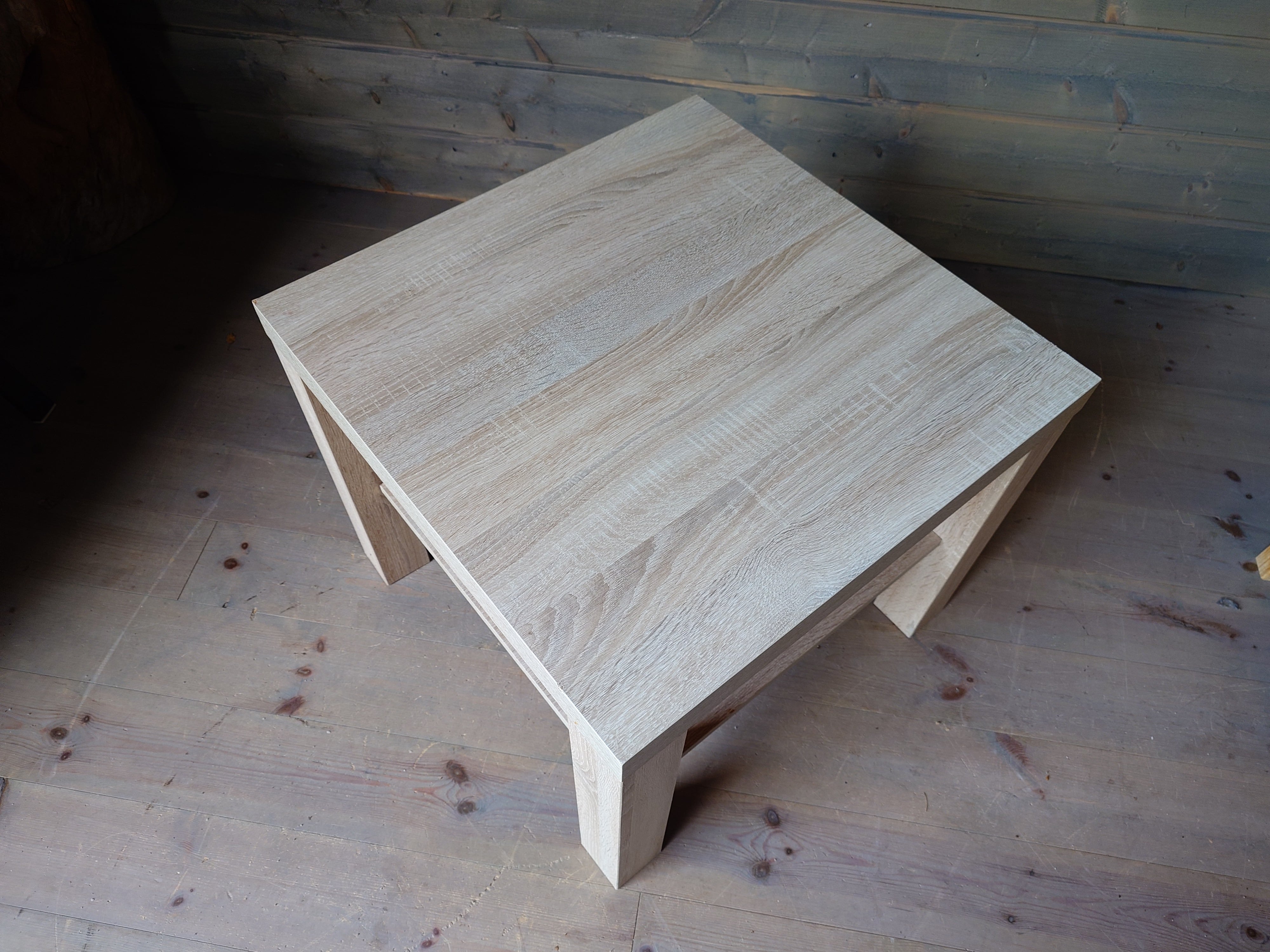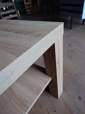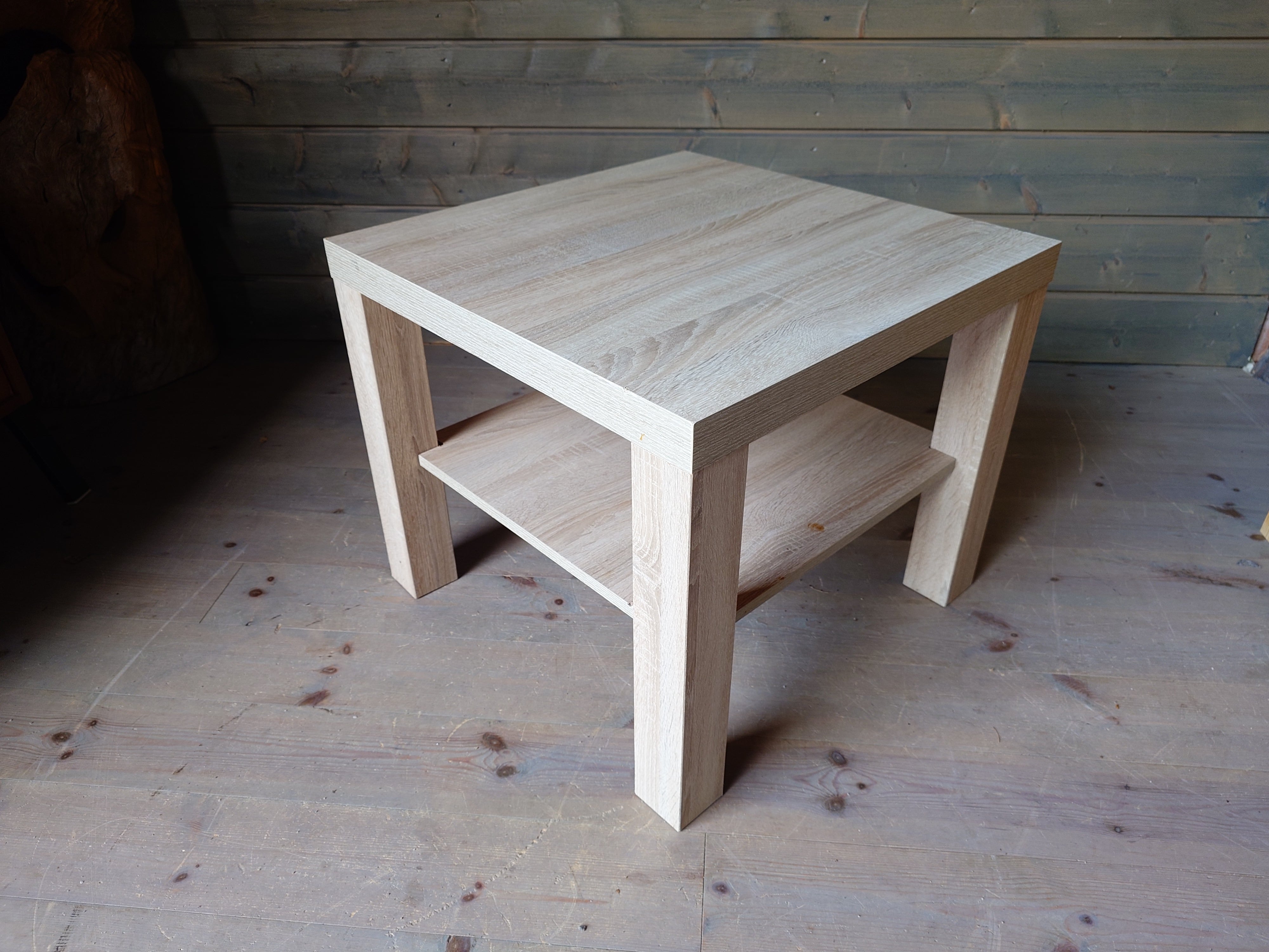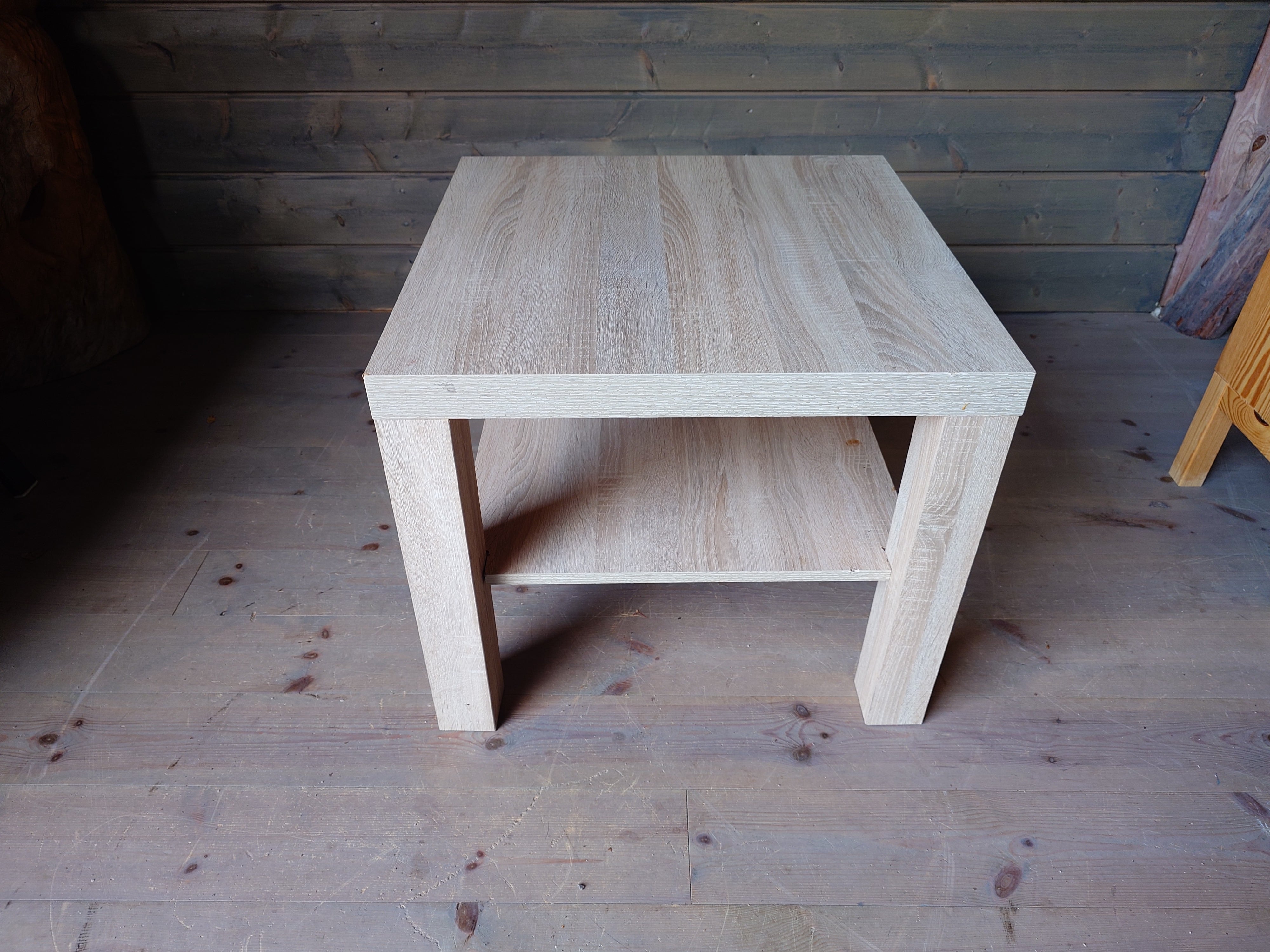 Näpsäkkä sohvapöytä, jossa on vaalean puun kuosi. Kalustelevyä.