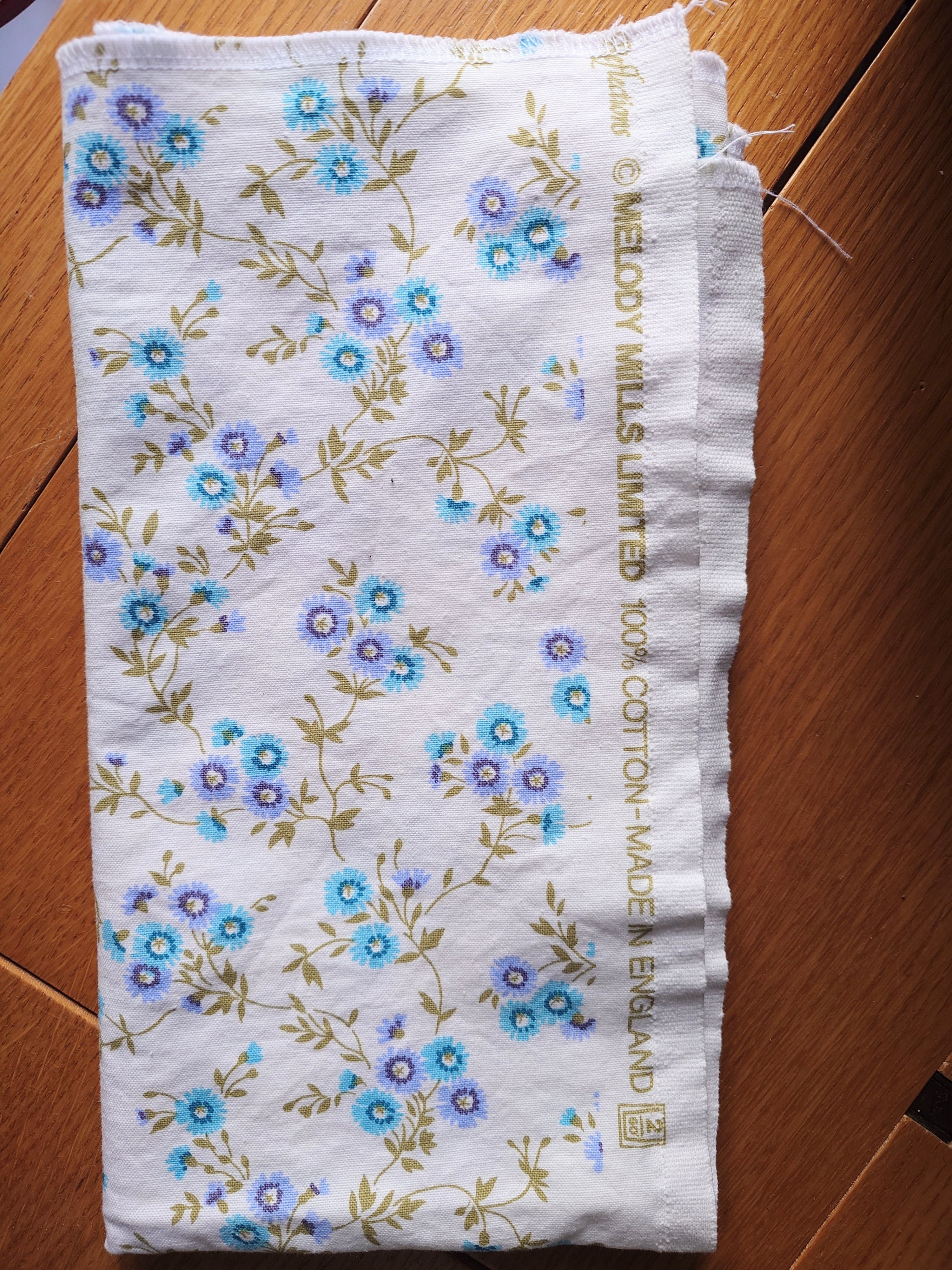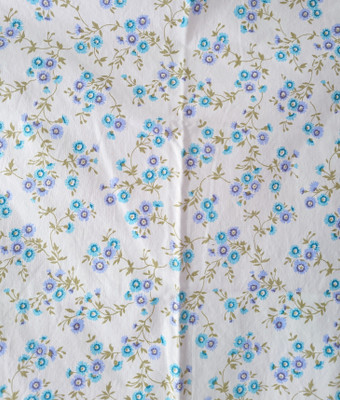Melody Mills Limited puuvillakangas. Valkoisella pohjalla sinisiä kukkia.