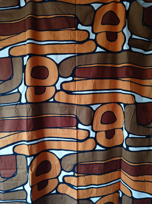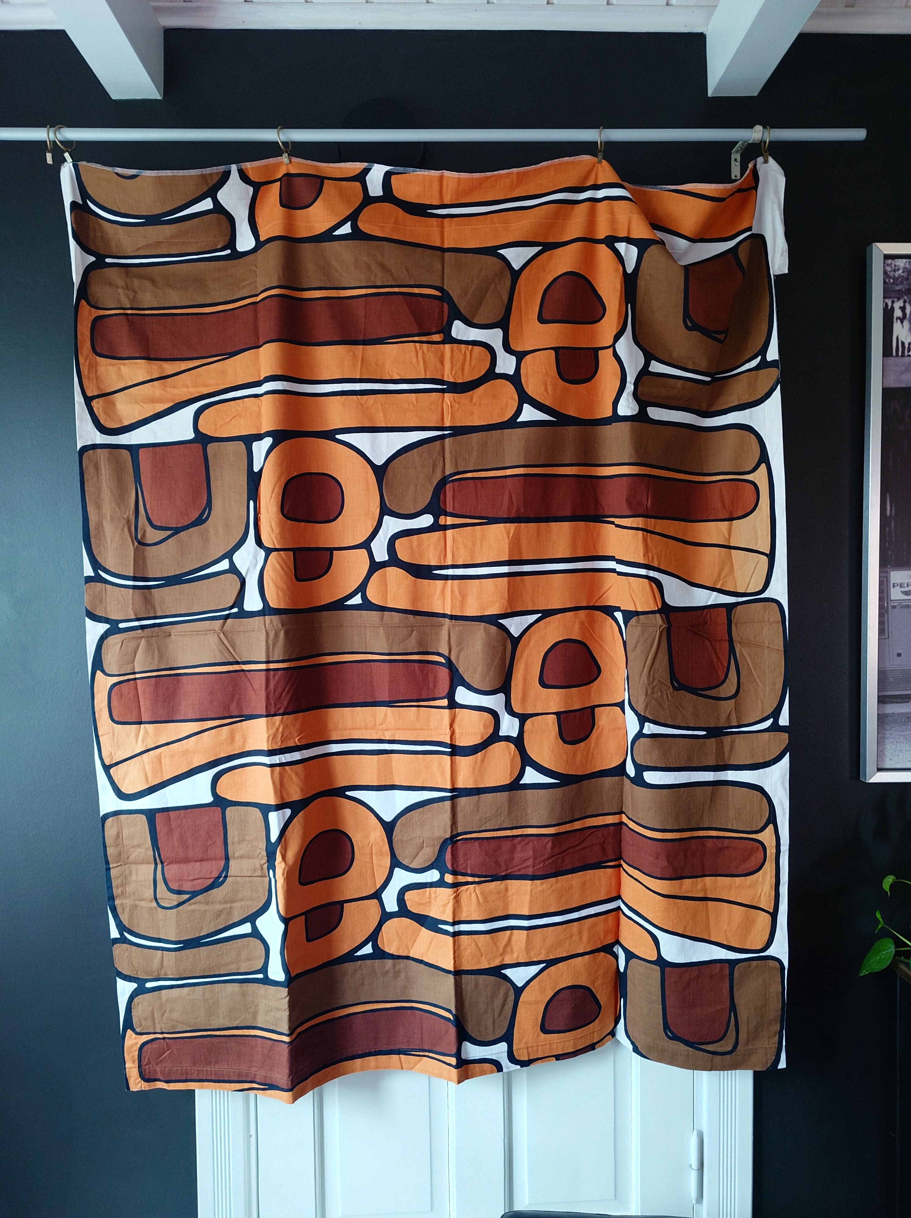 Ruskeasävyinen kuviollinen retro kangas, jota on kaksi suunnilleen samankokoista palaa. 1970-lukua.