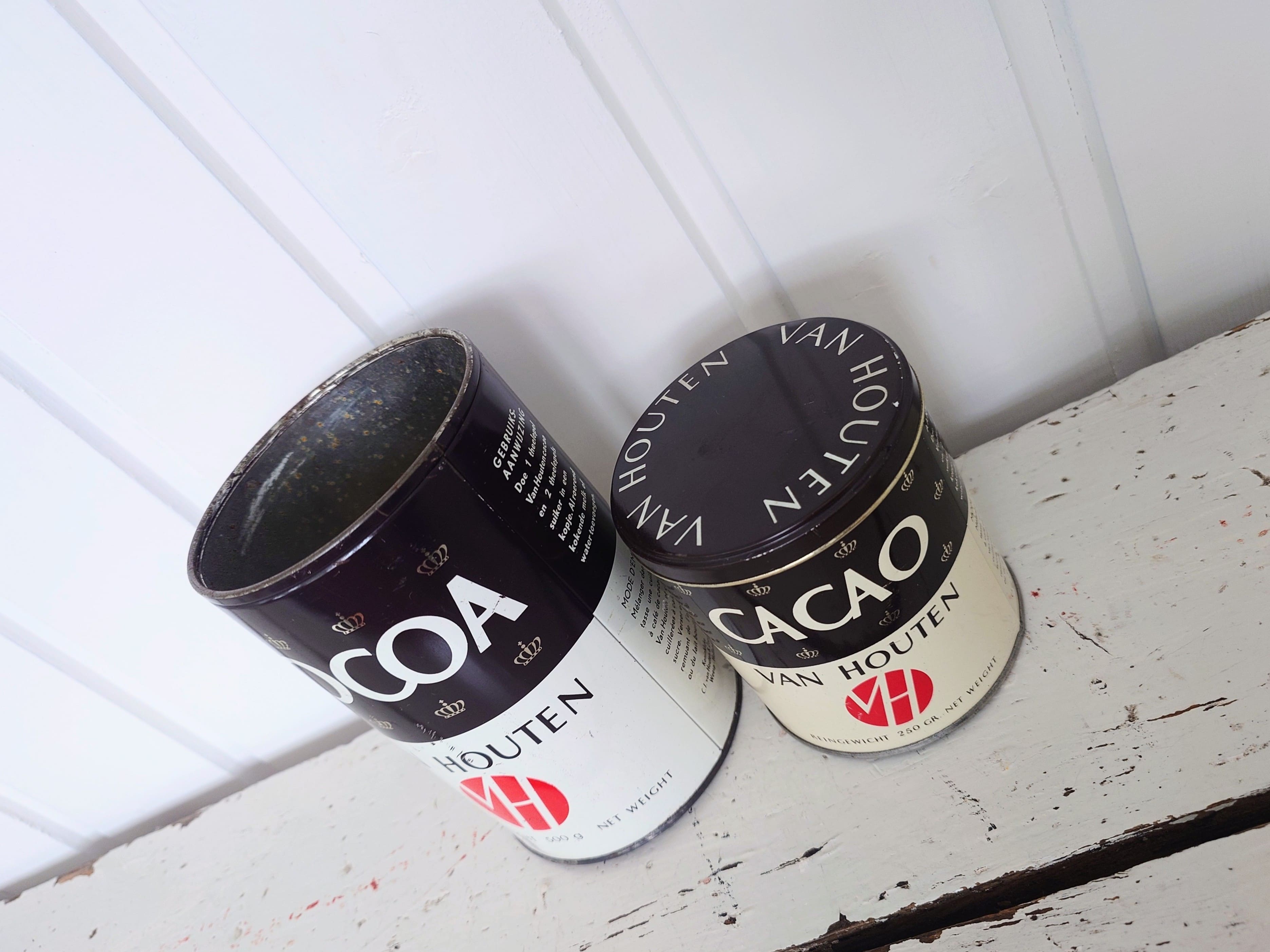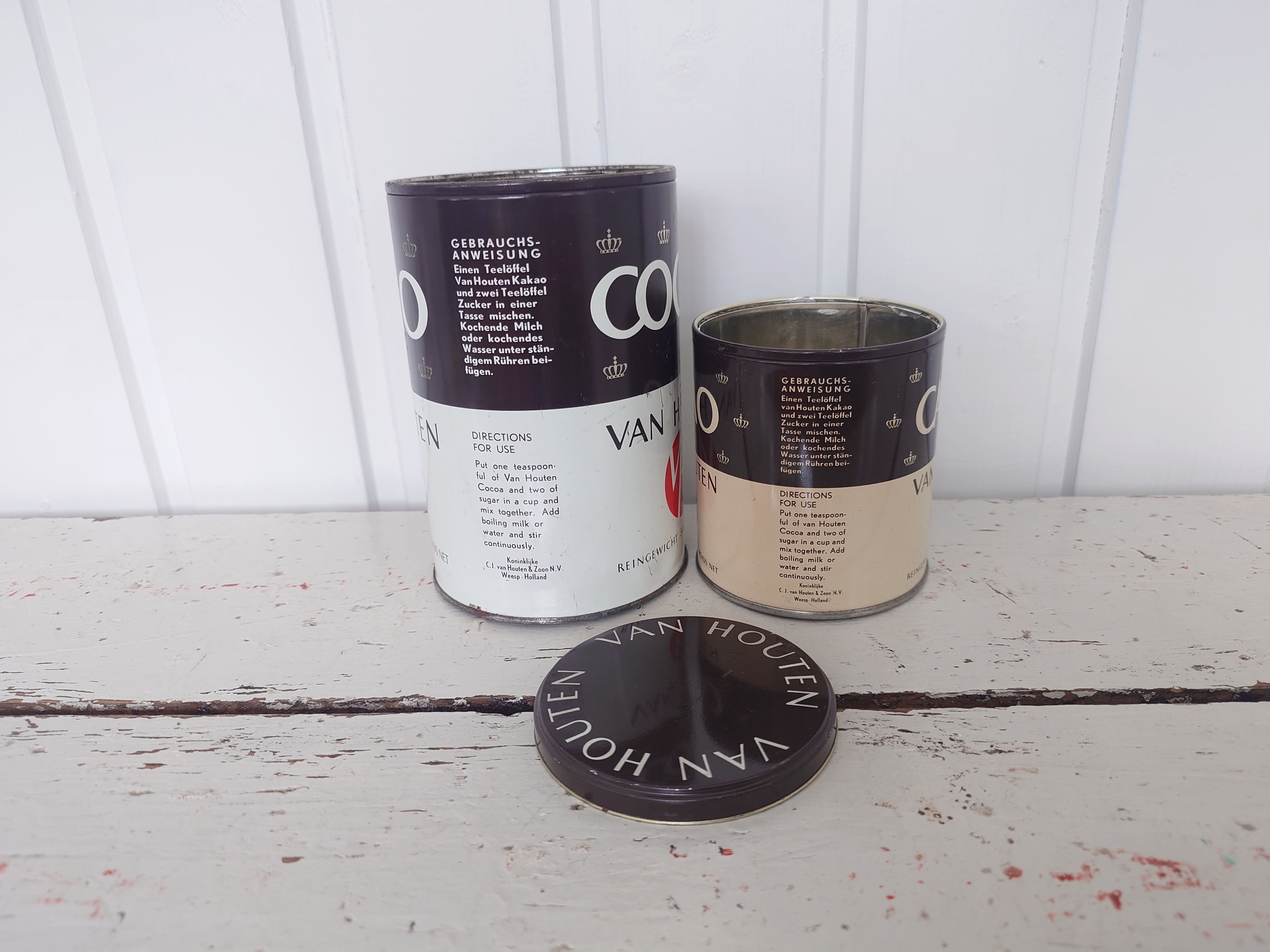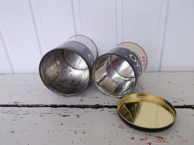 Vanhat peltipurkit, joista pienemmässä on myös kansi tallella.