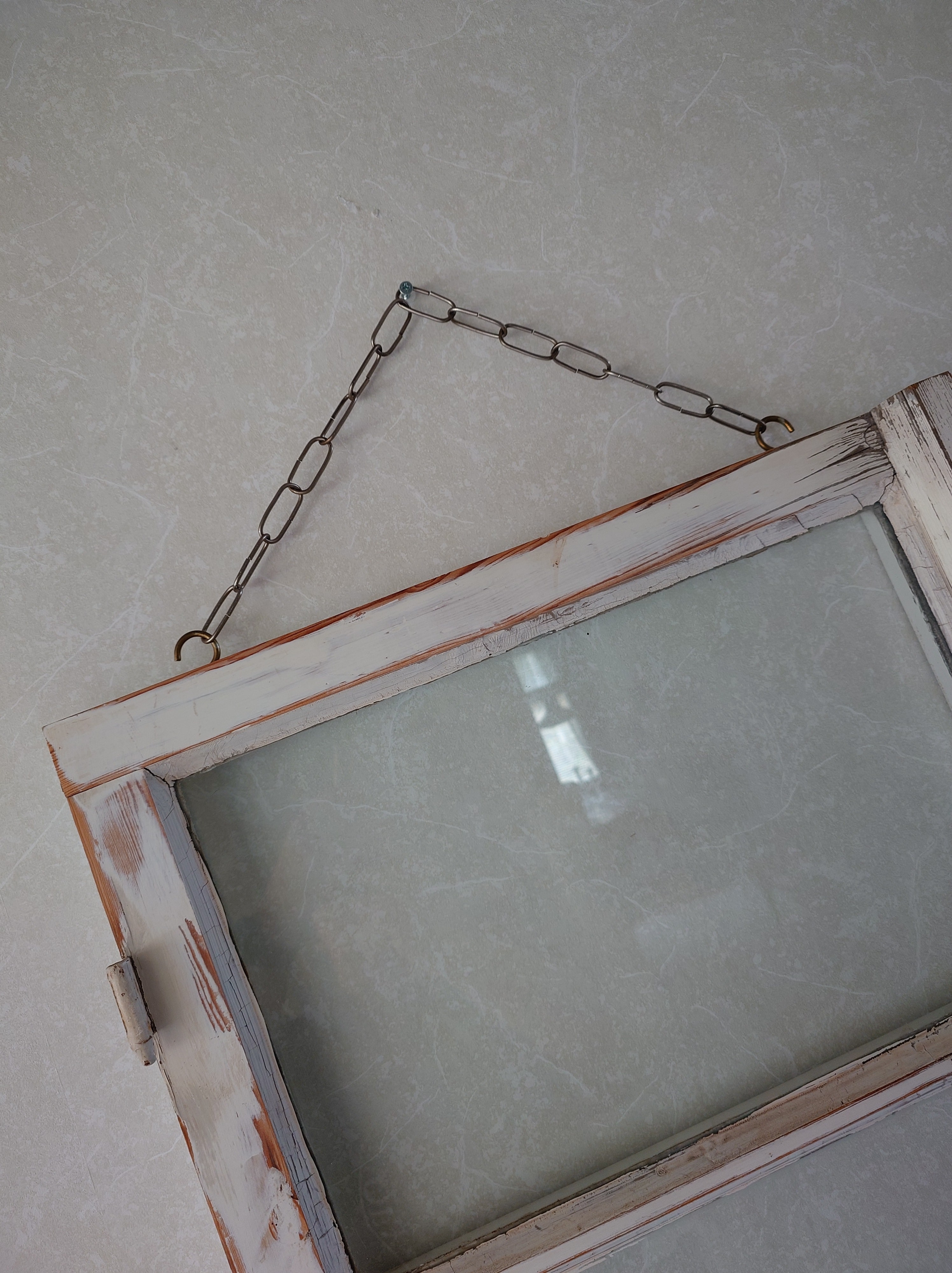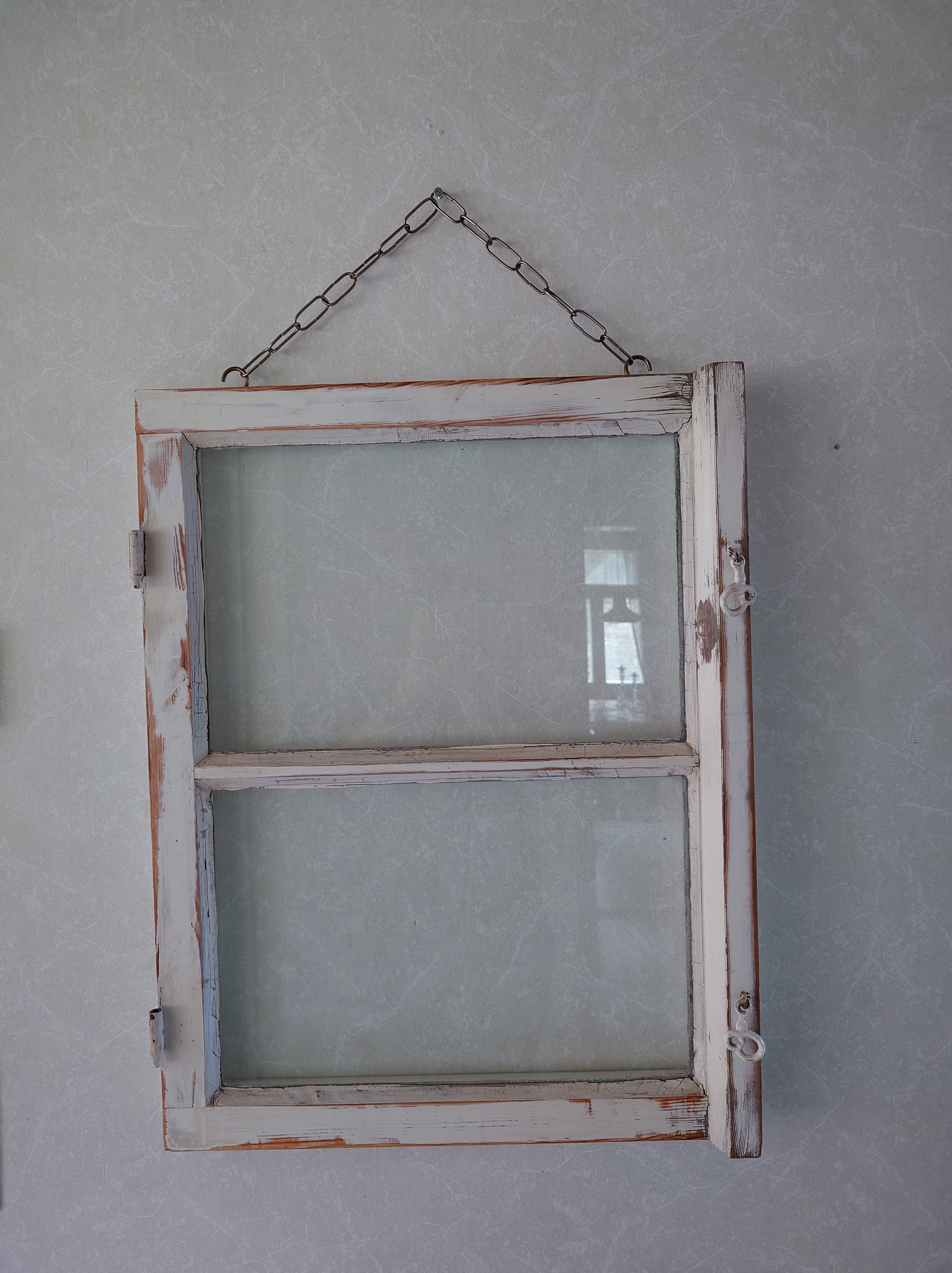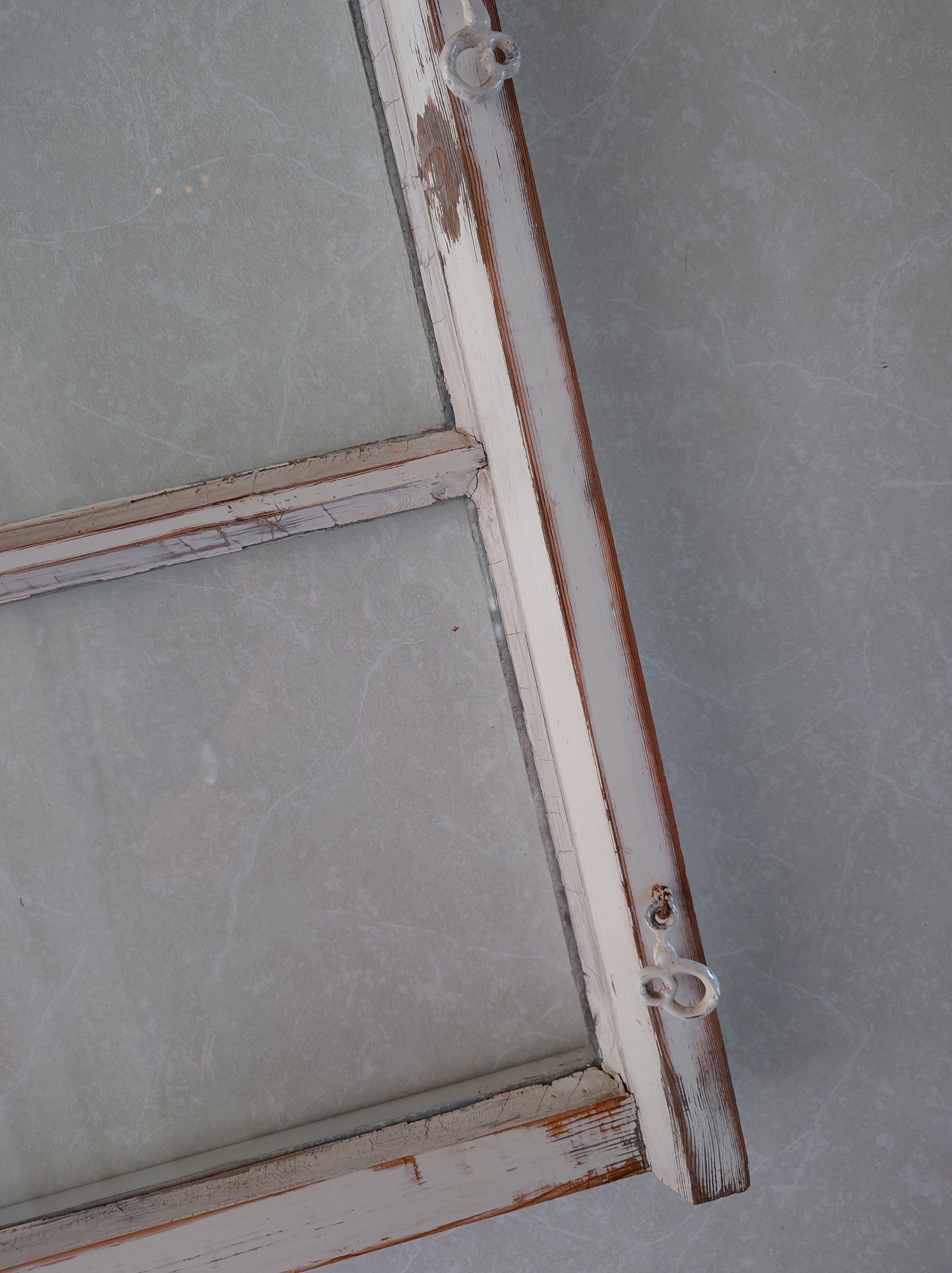 Vanha kaksiruutuinen ikkuna sisustukseen. Yläpuolella on ketju, mistä sen saa ripustettua seinälle. Hyväkuntoinen. Maali ei rapise, vaan irtoavat kohdat on hiottu.