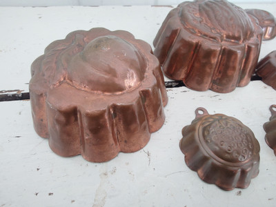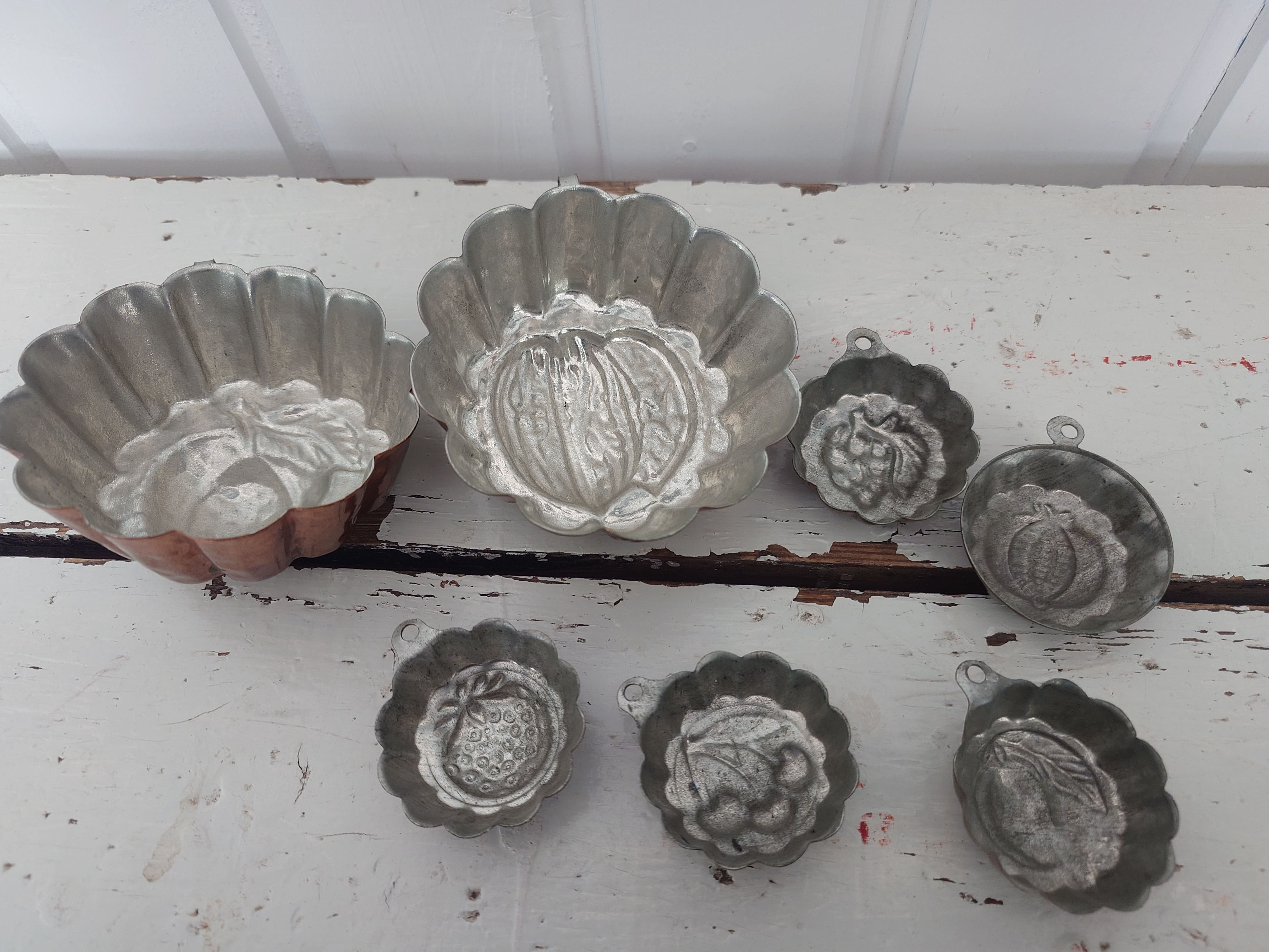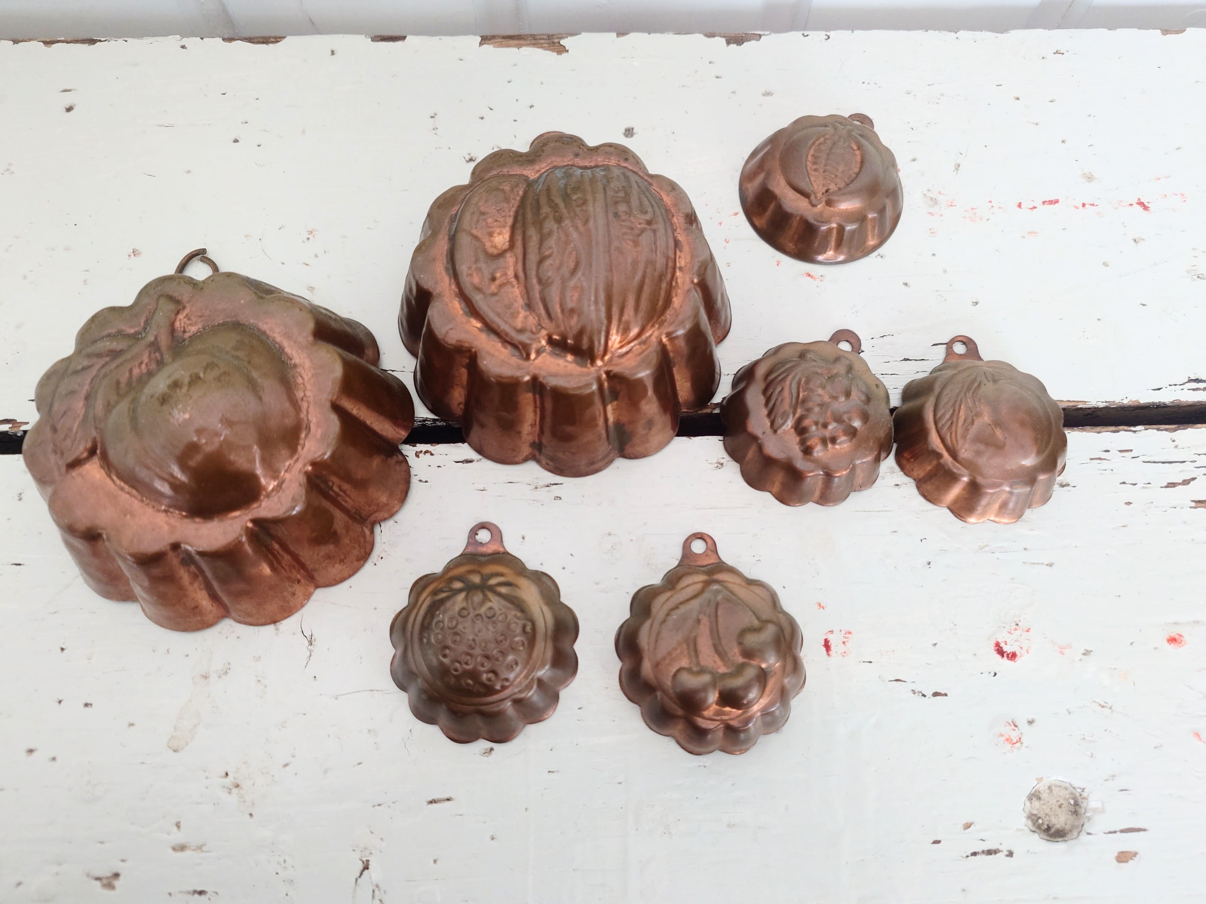 1960-luvun kupariset leivosmuotit, jossa on kaiverretut hedelmien kuvat. Kahta kokoa.