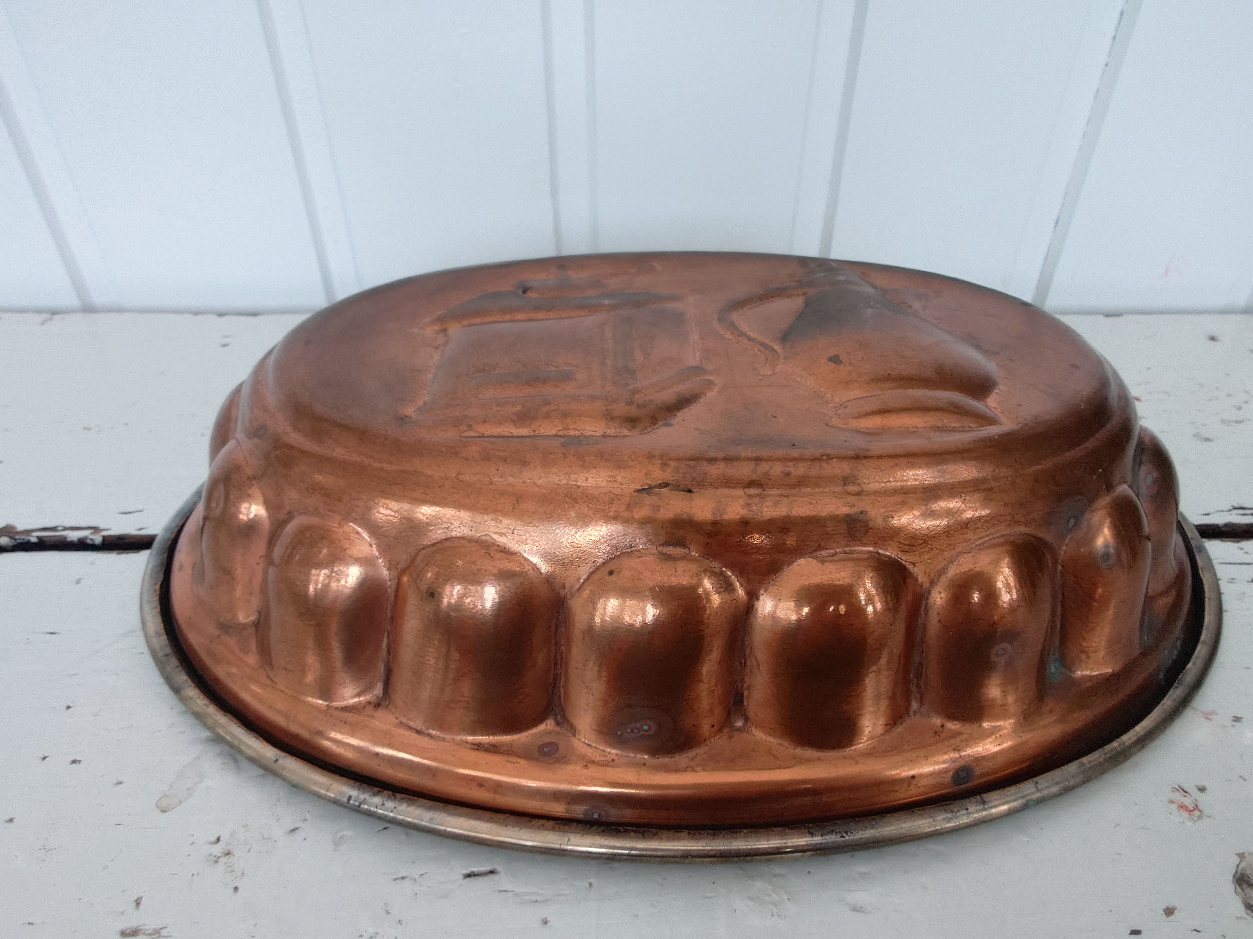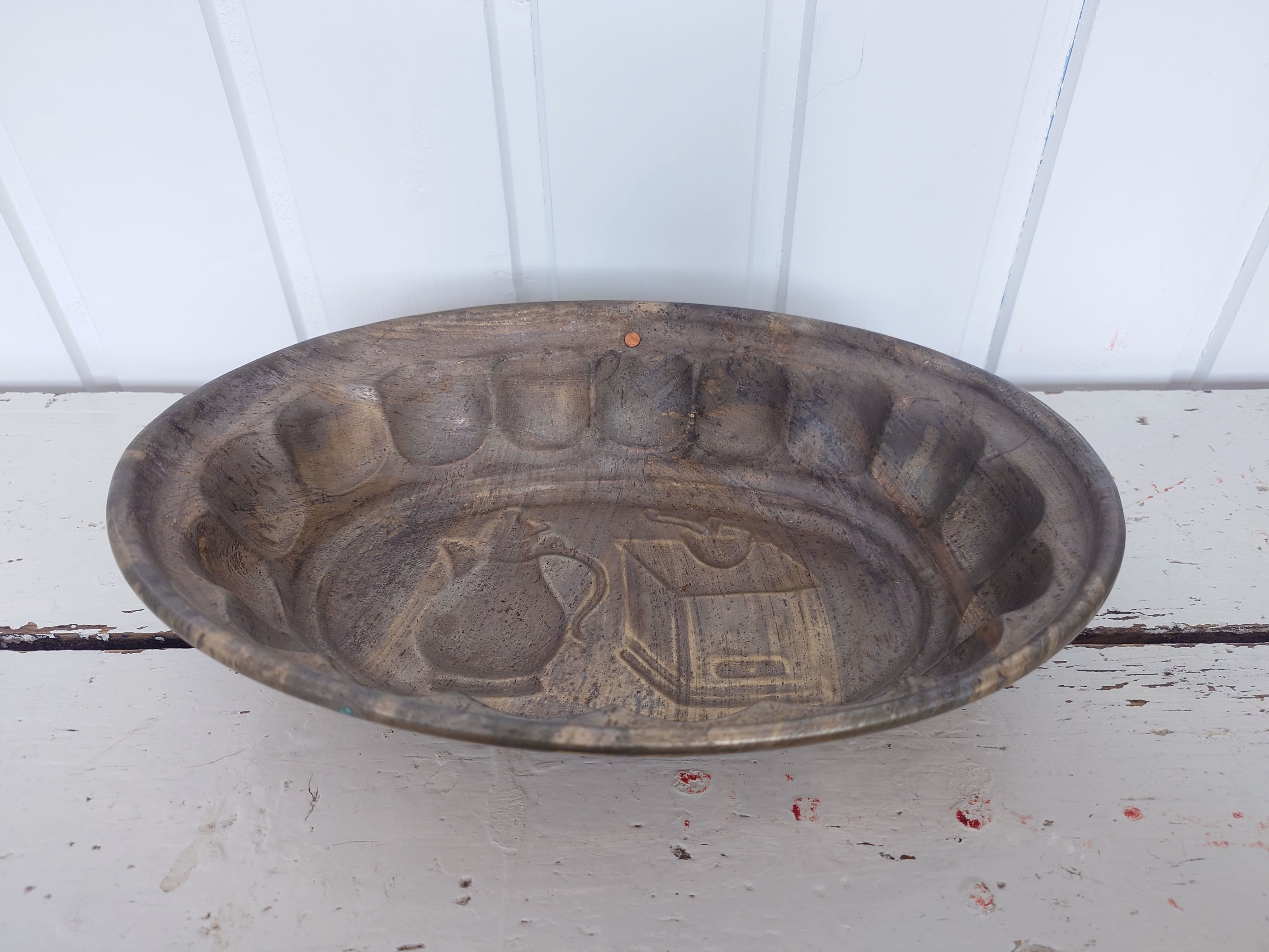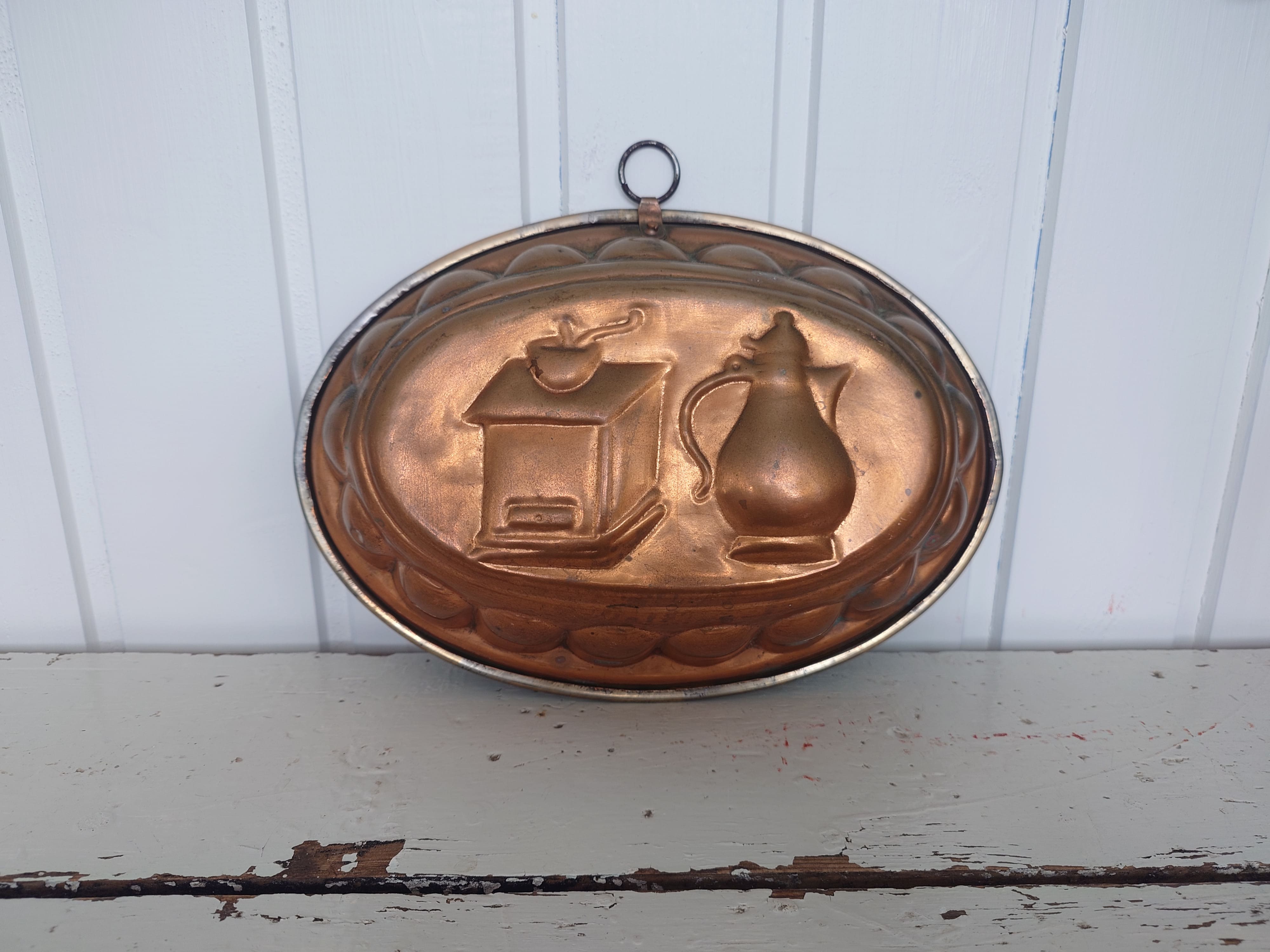 1960-luvun kuparinen kakkuvuoka, jossa on kaiverretut kahvimyllyn ja kannun kuvat.