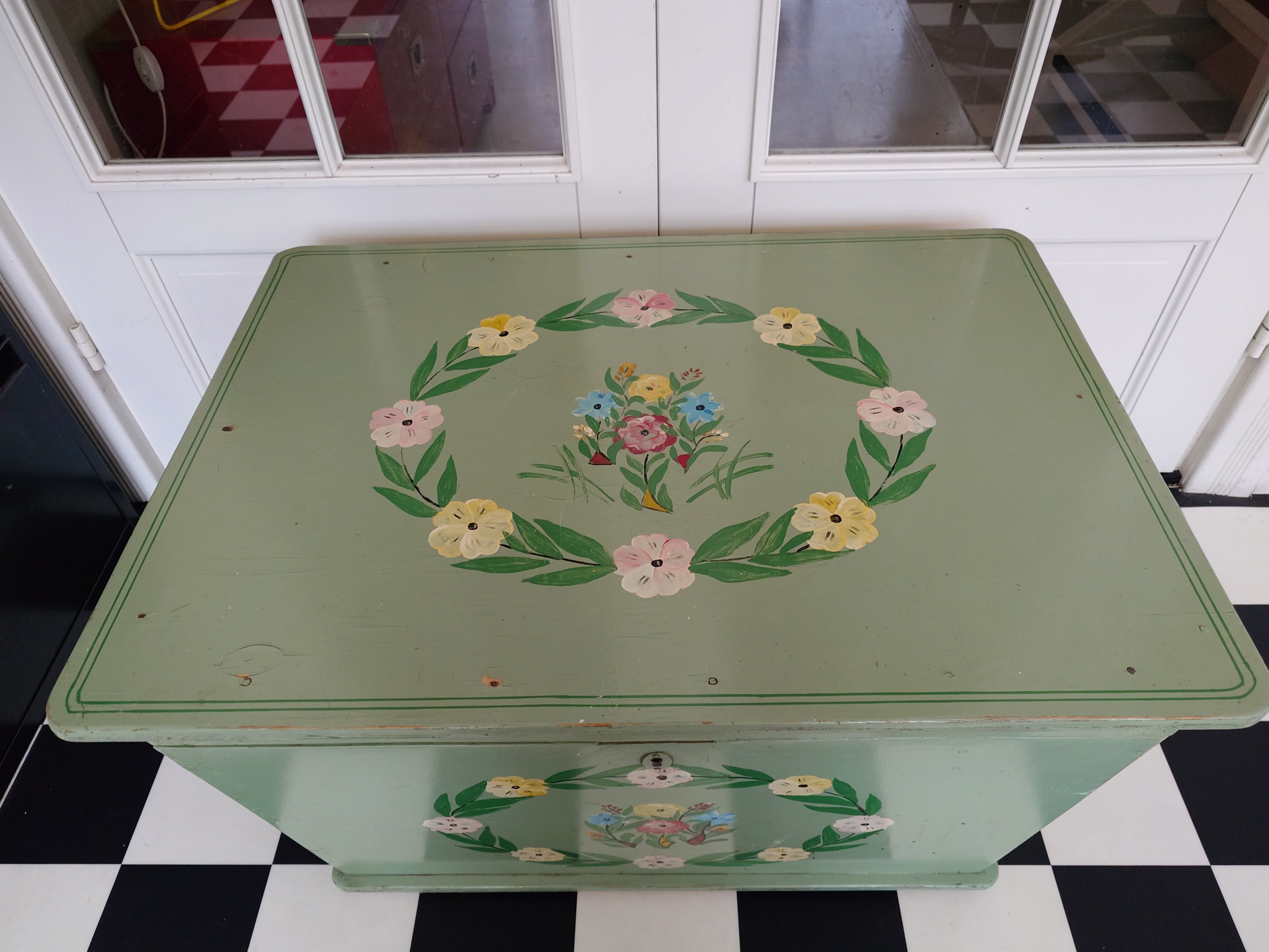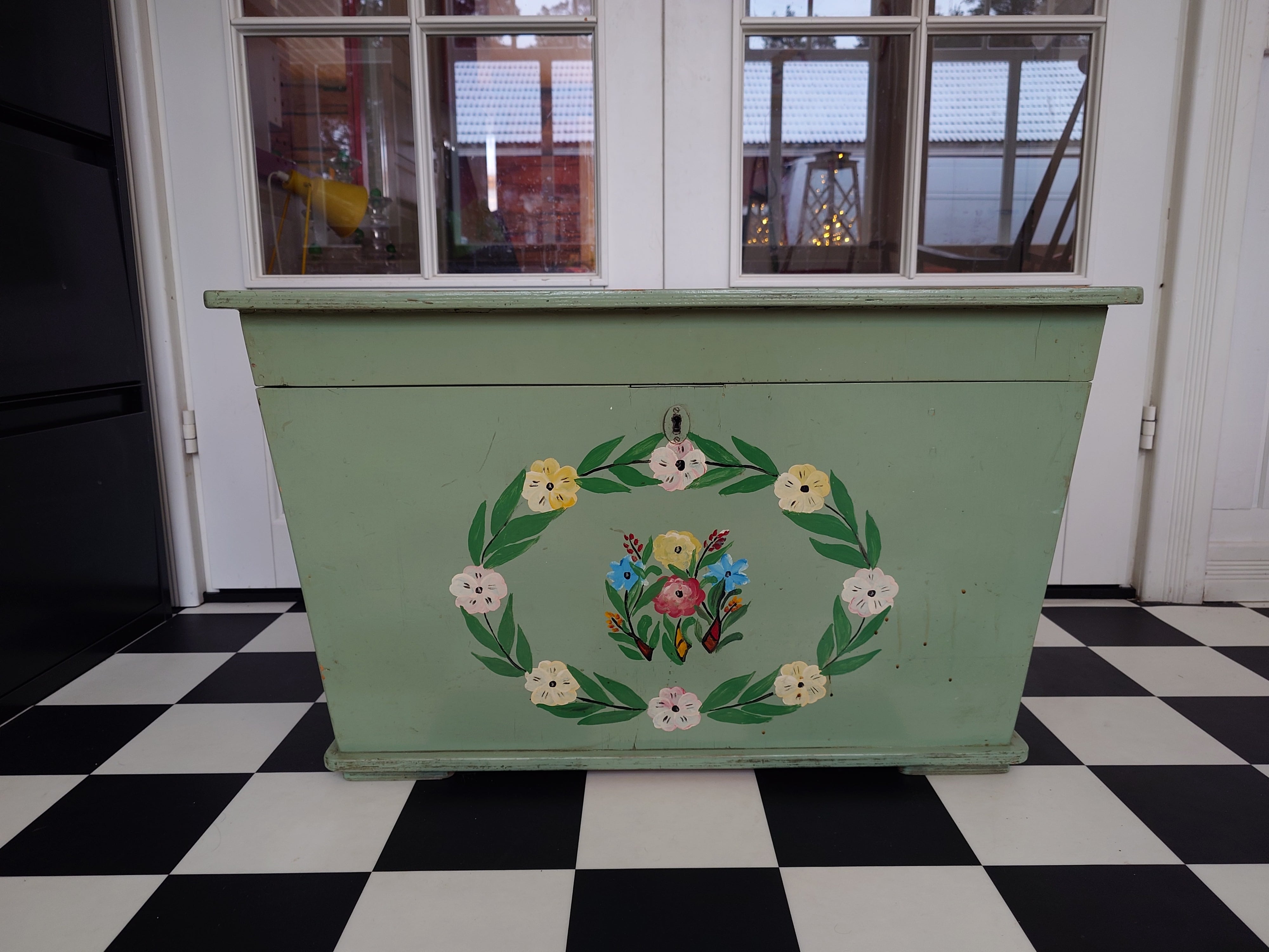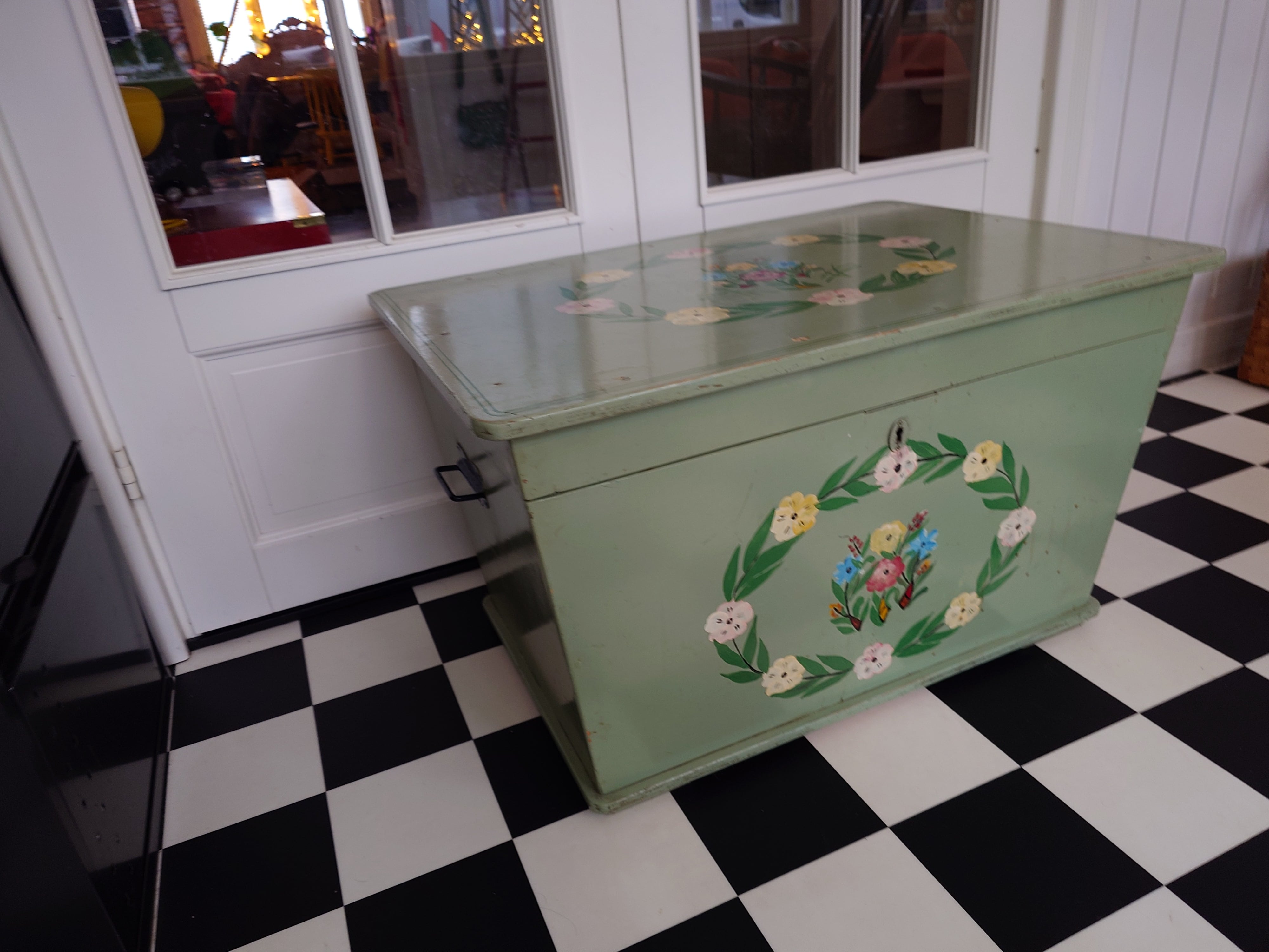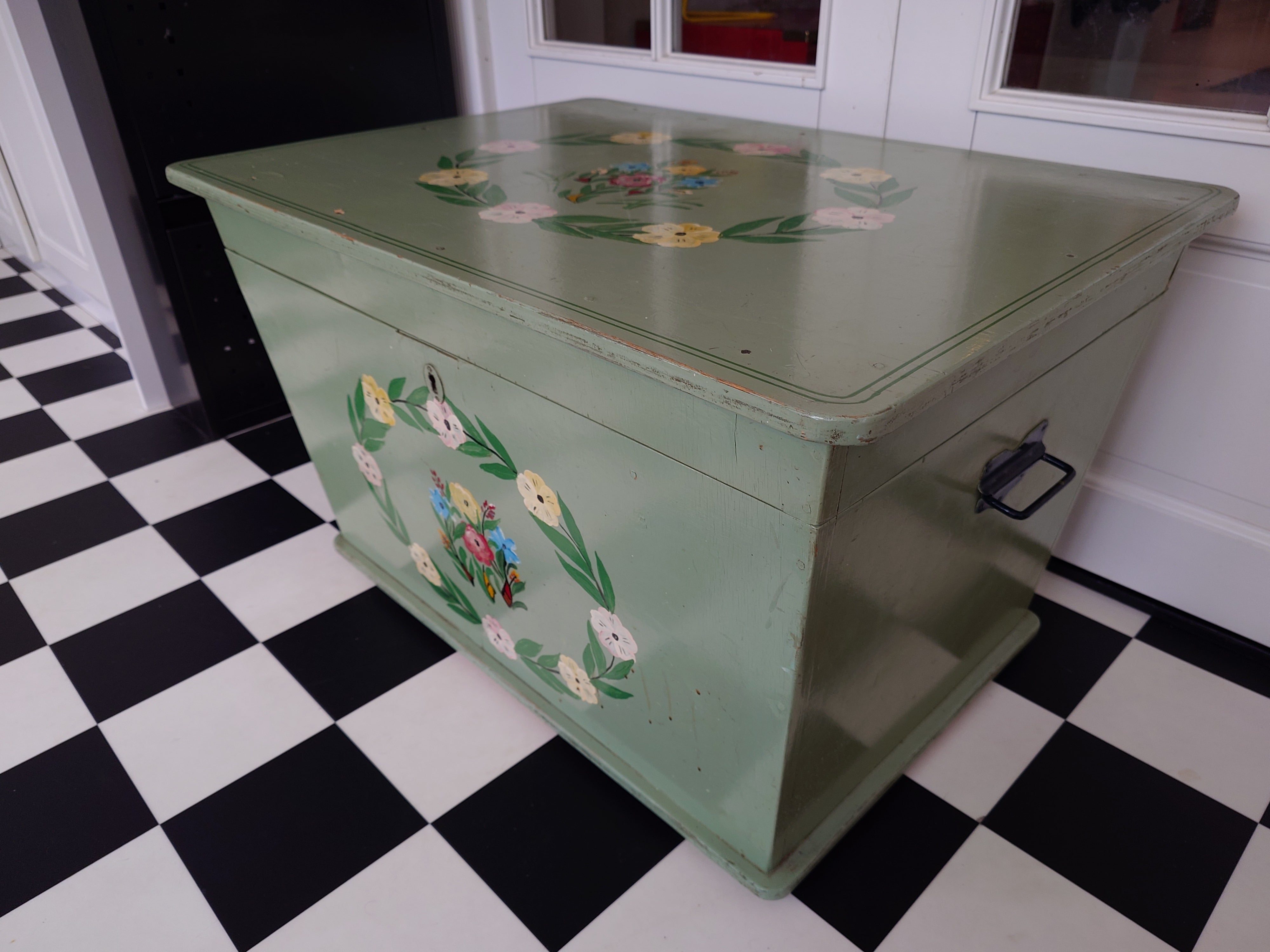 1950-luvun kaunis puuarkku, jossa on etupuolella ja kannessa maalatut kukkaseppeleet. Päädyissä rautakahvat. Ei avainta tallella.