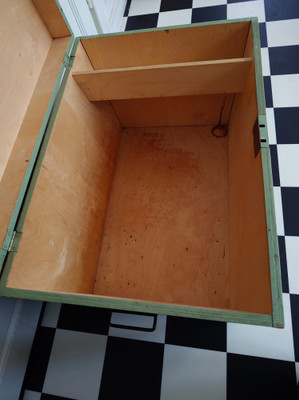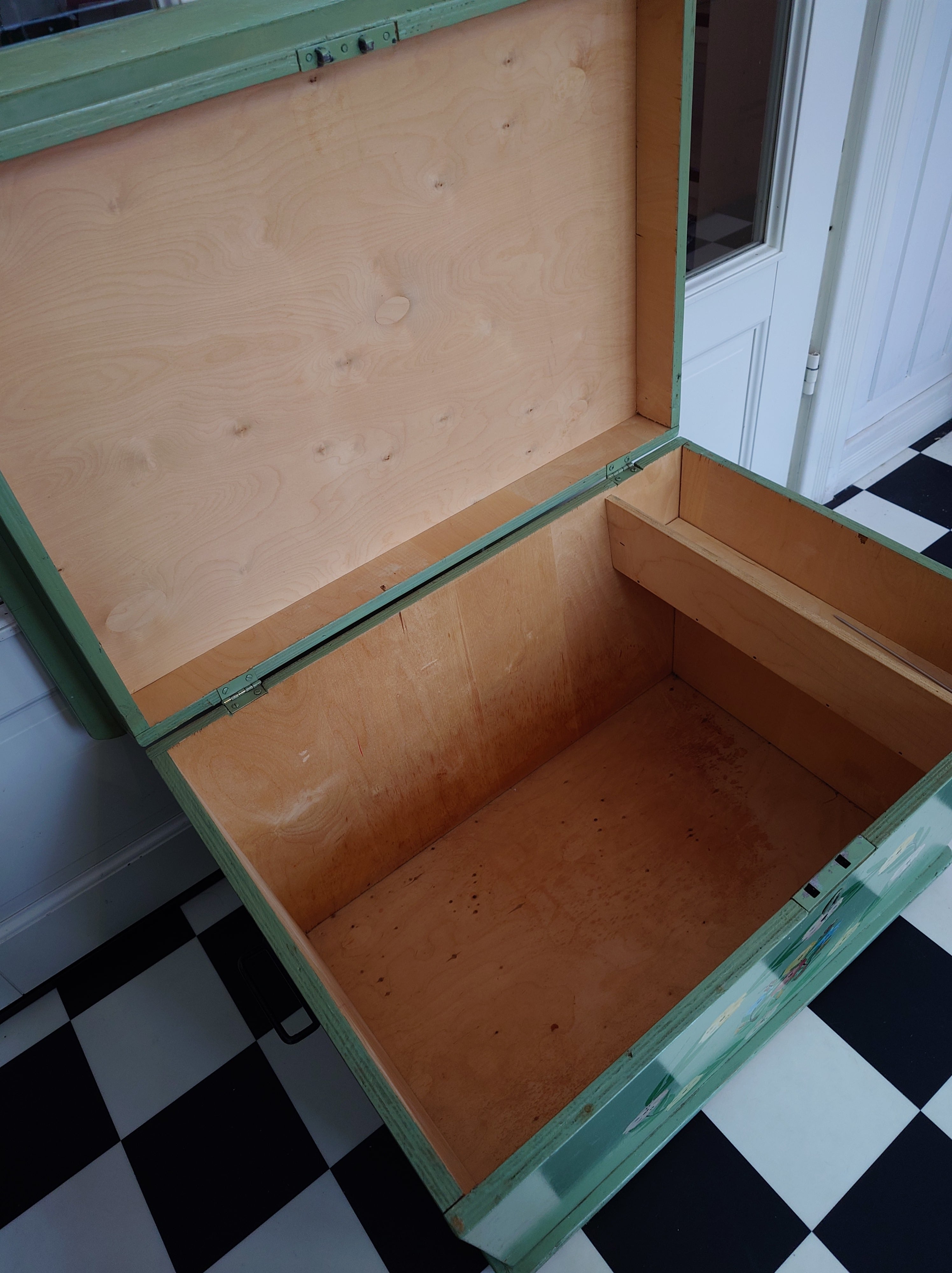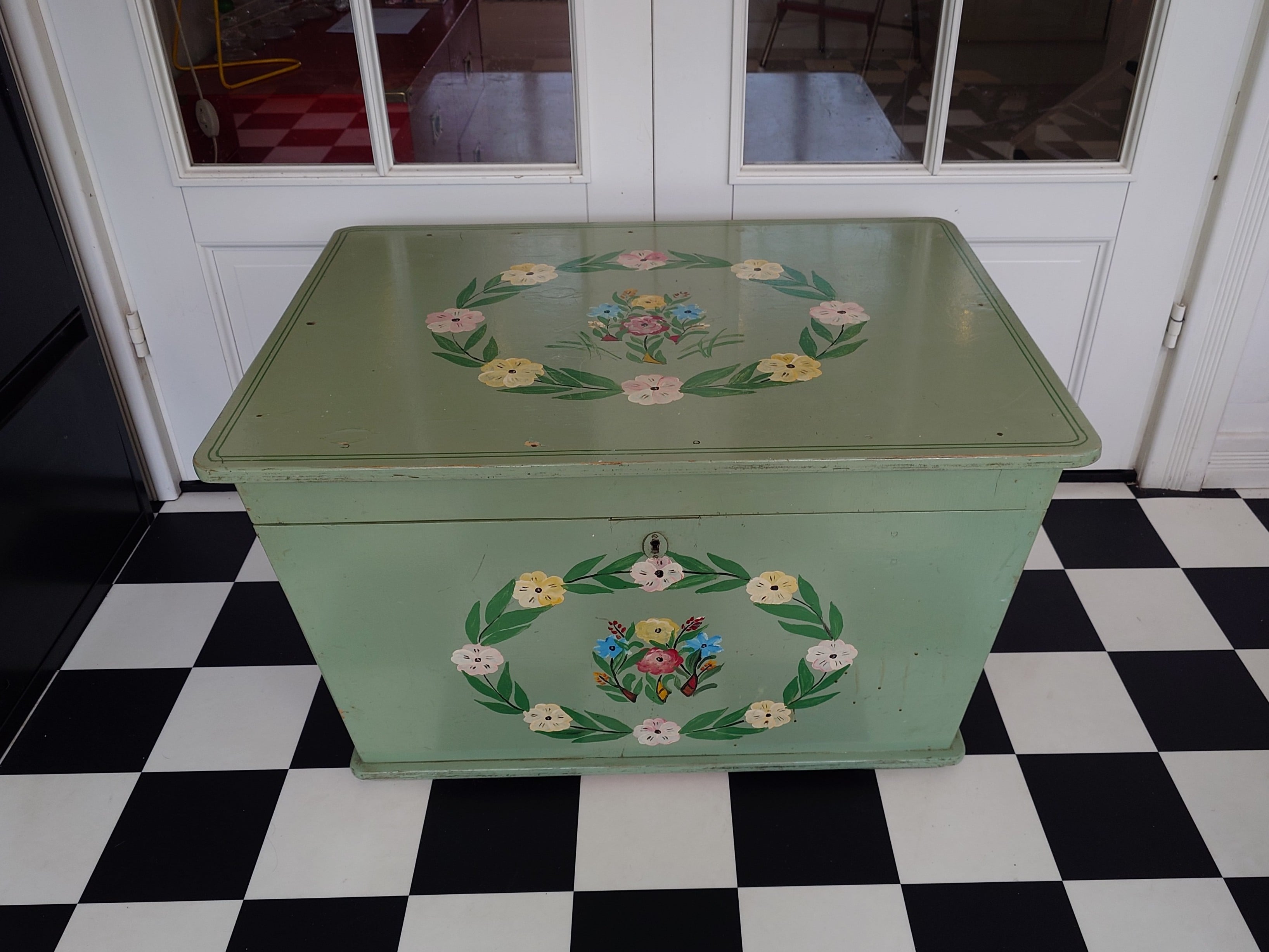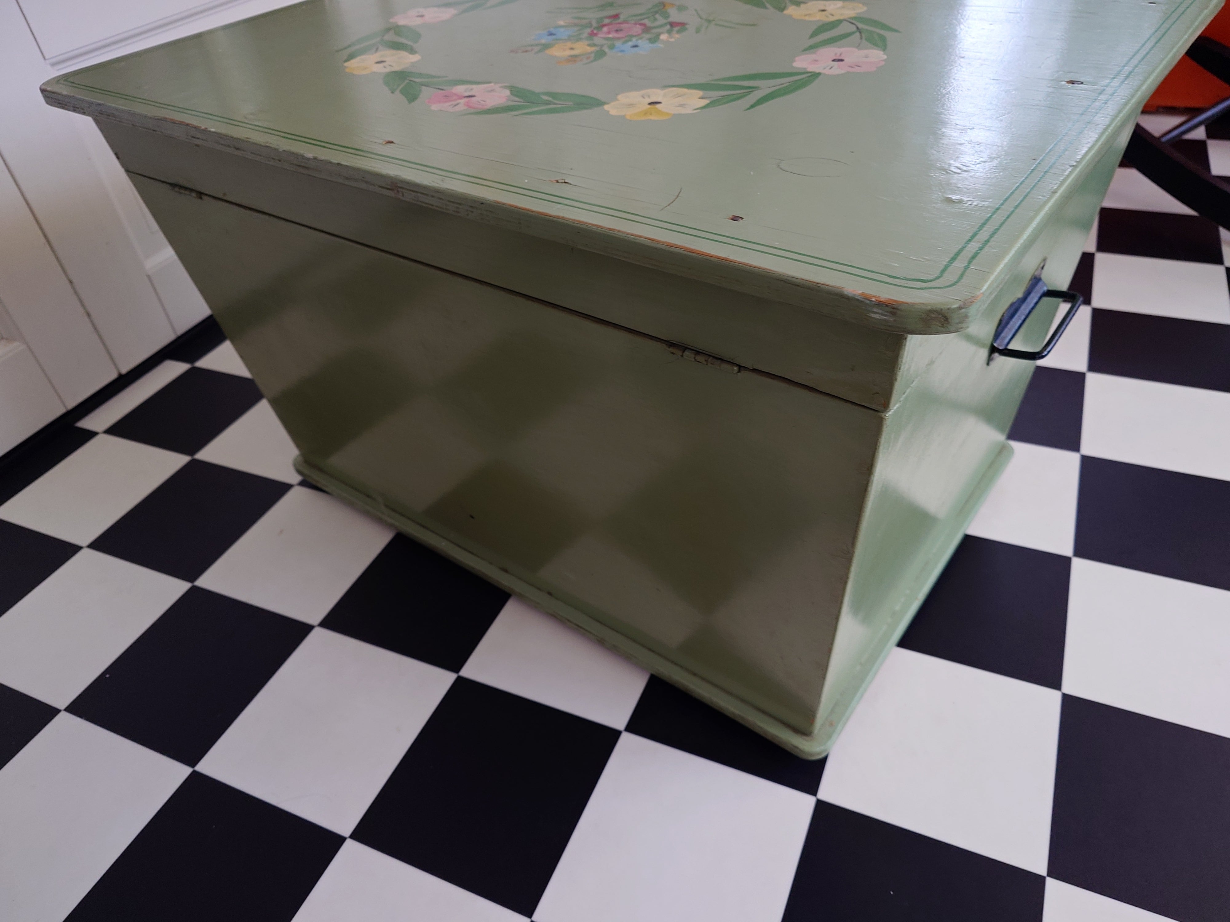 1950-luvun kaunis puuarkku, jossa on etupuolella ja kannessa maalatut kukkaseppeleet. Päädyissä rautakahvat. Ei avainta tallella.