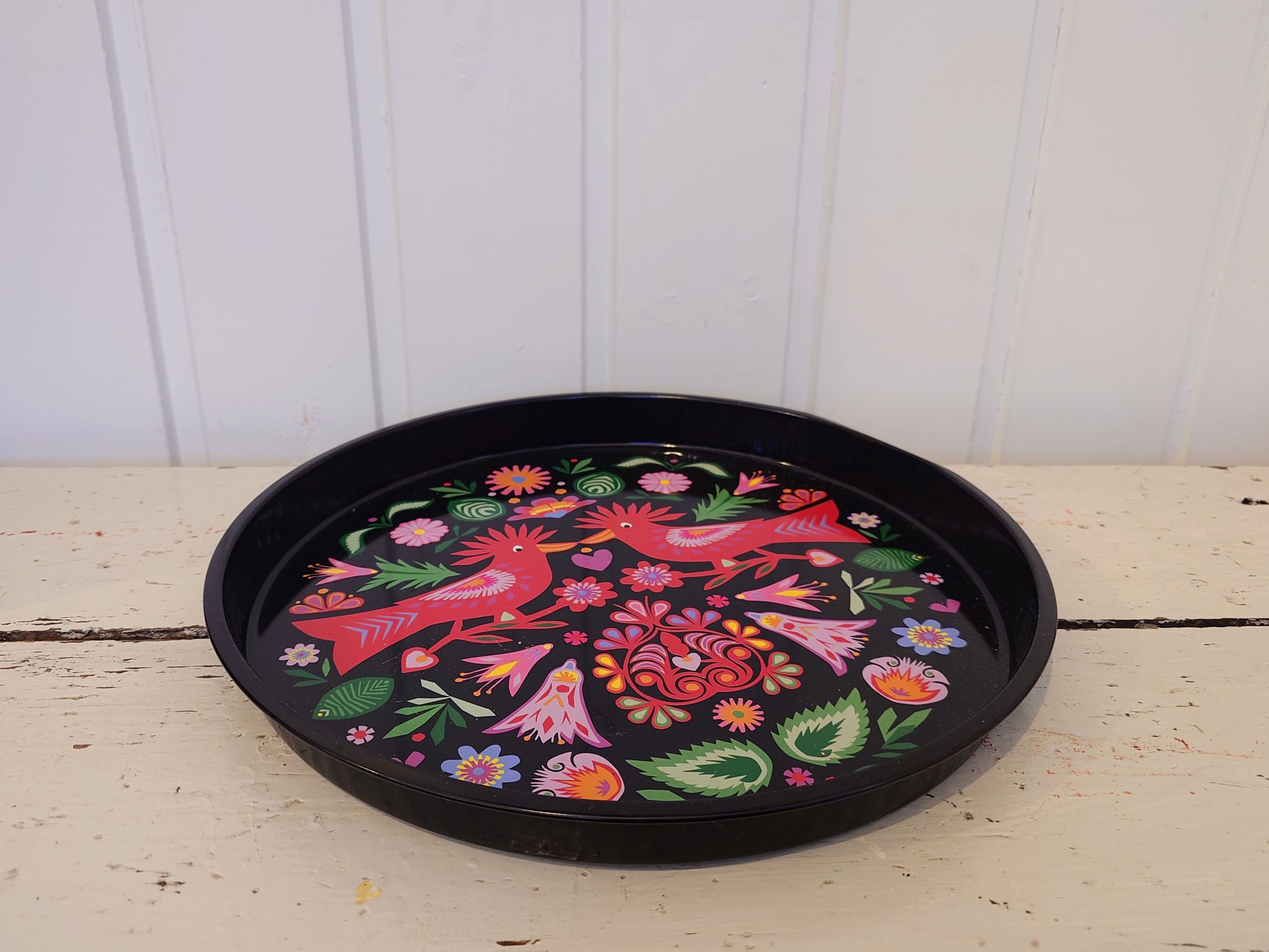 Kiva retro peltitarjotin, jossa on musta pohja ja värikäs painatus.