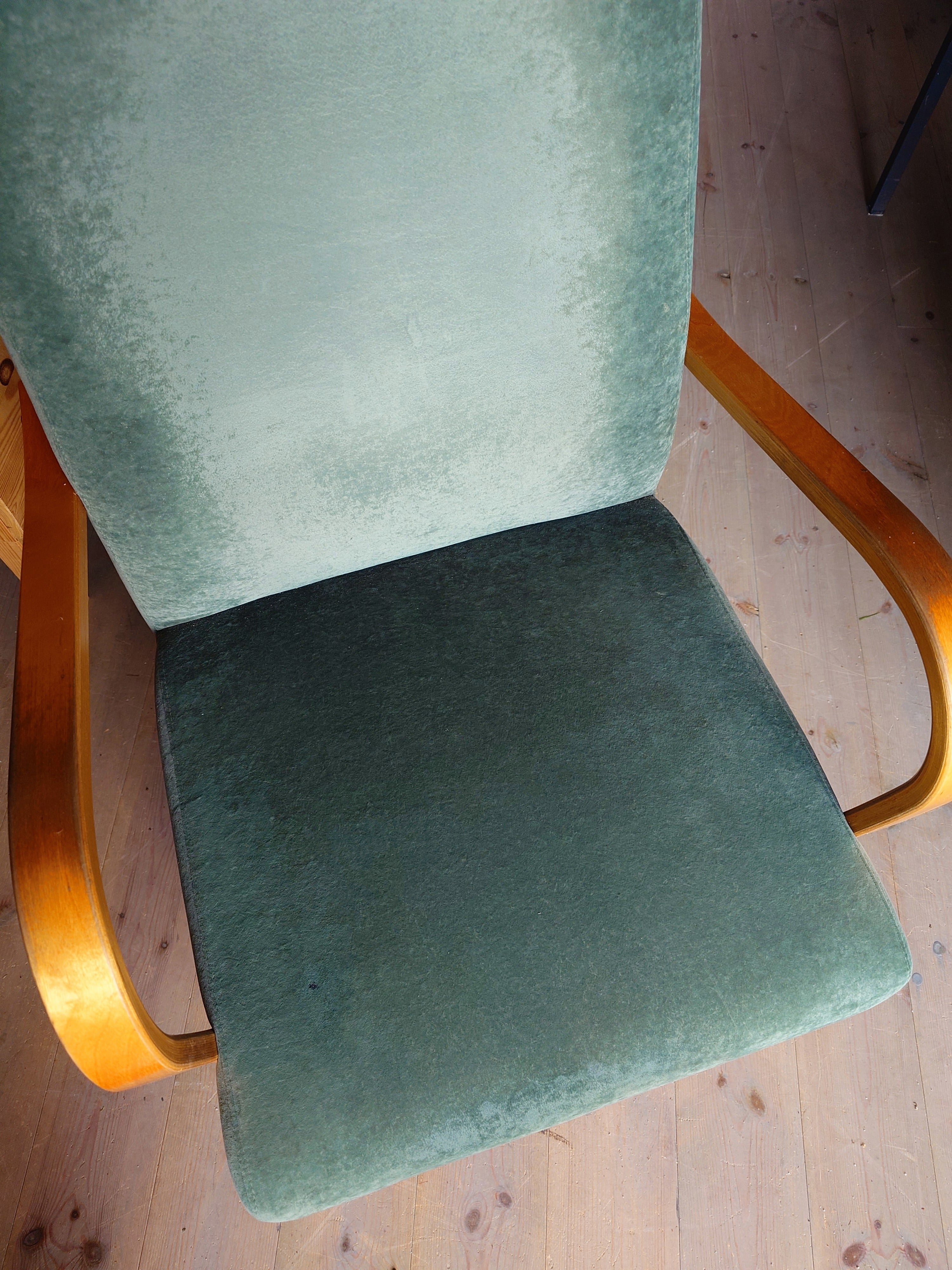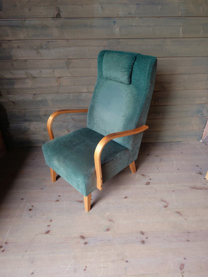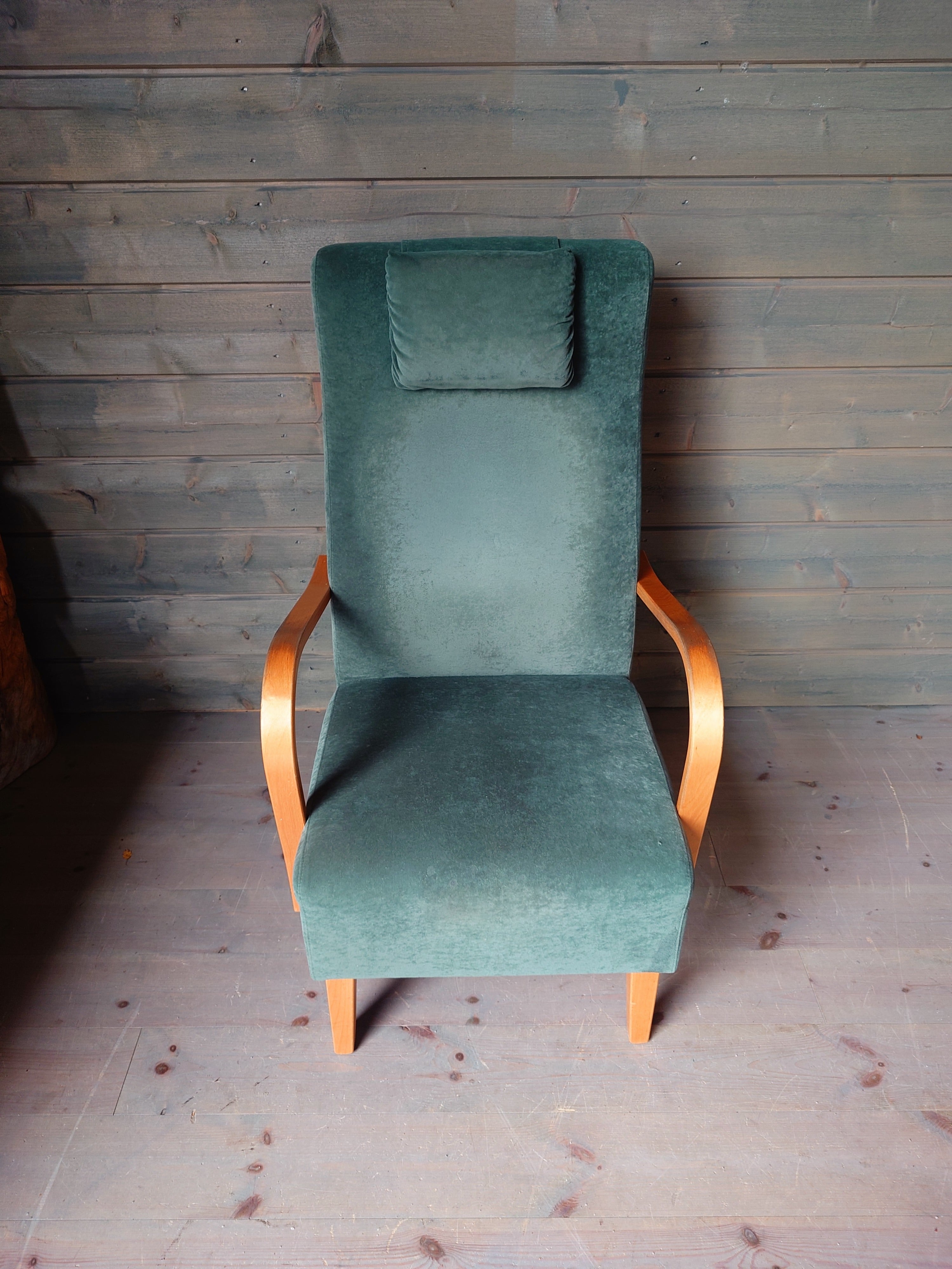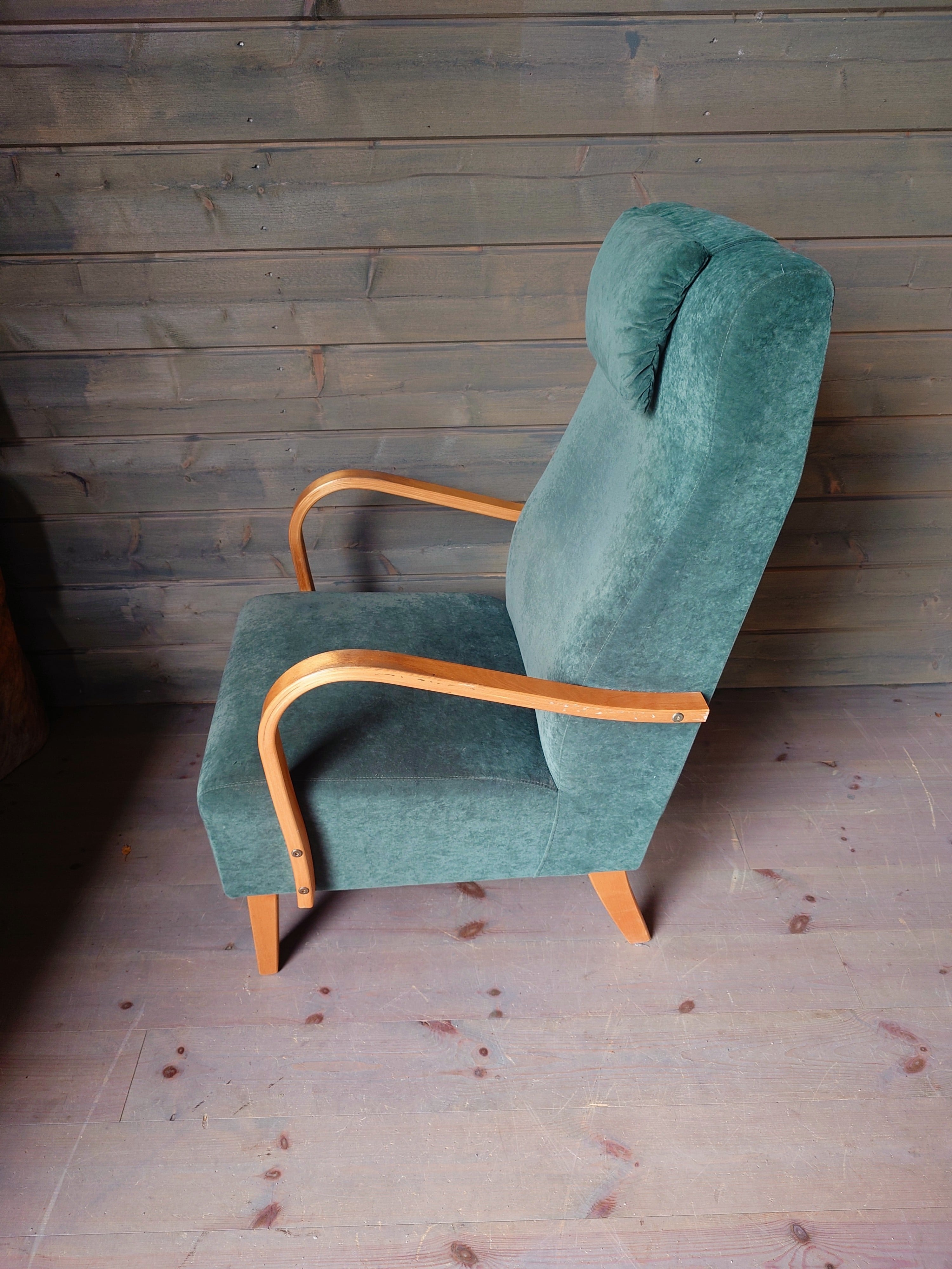 Vihreä siro nojatuoli, jossa verhoilu on mikroplyysiä.