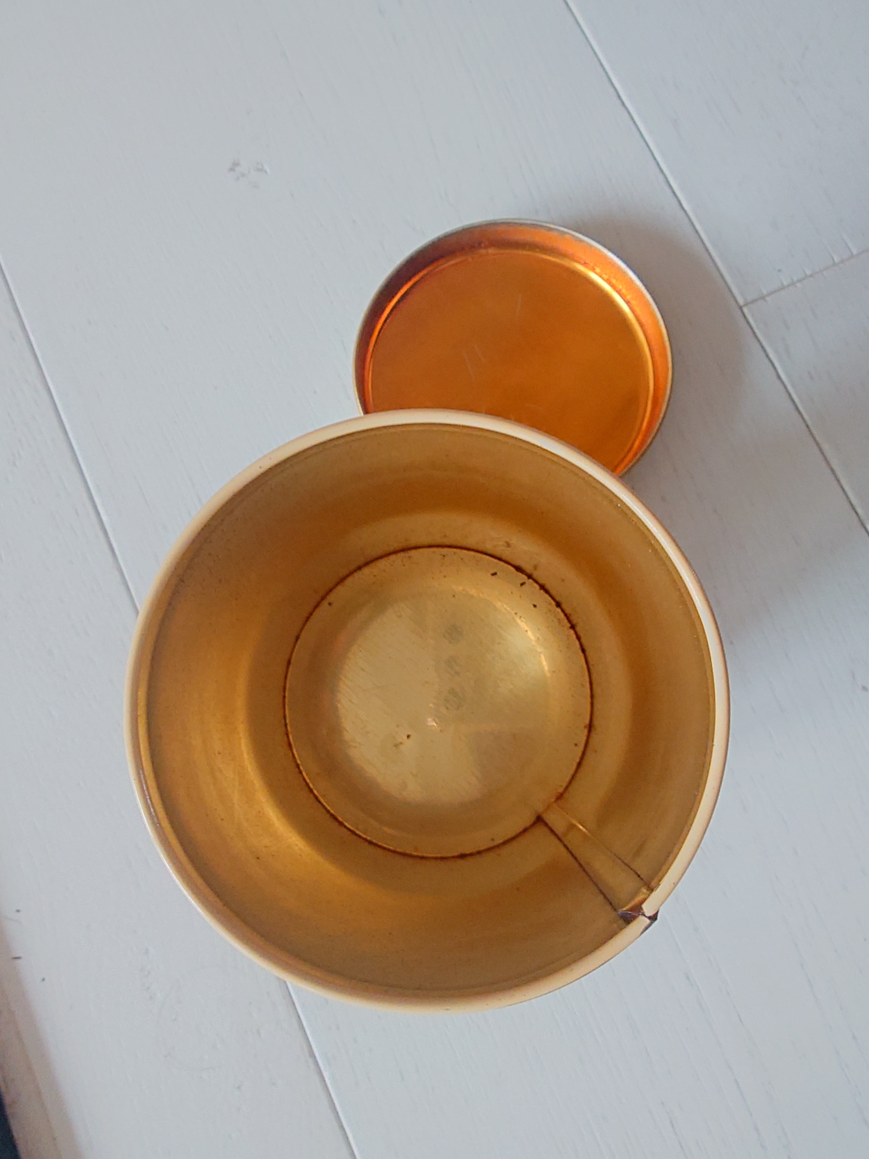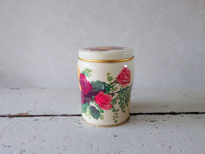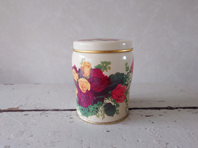 Vanha ruusukuvioinen peltipurkki.