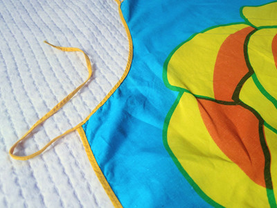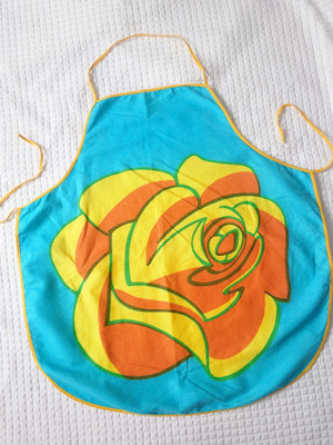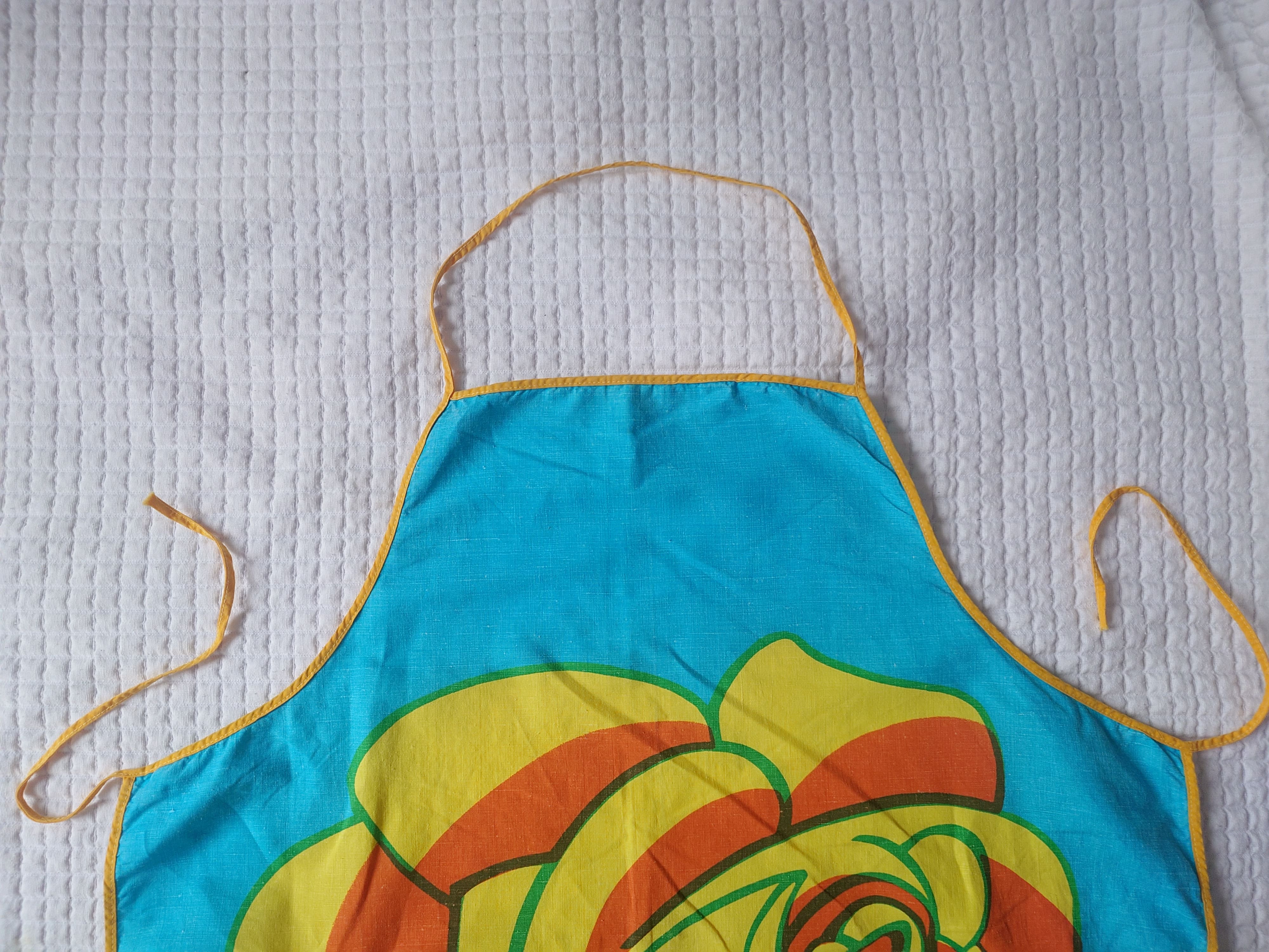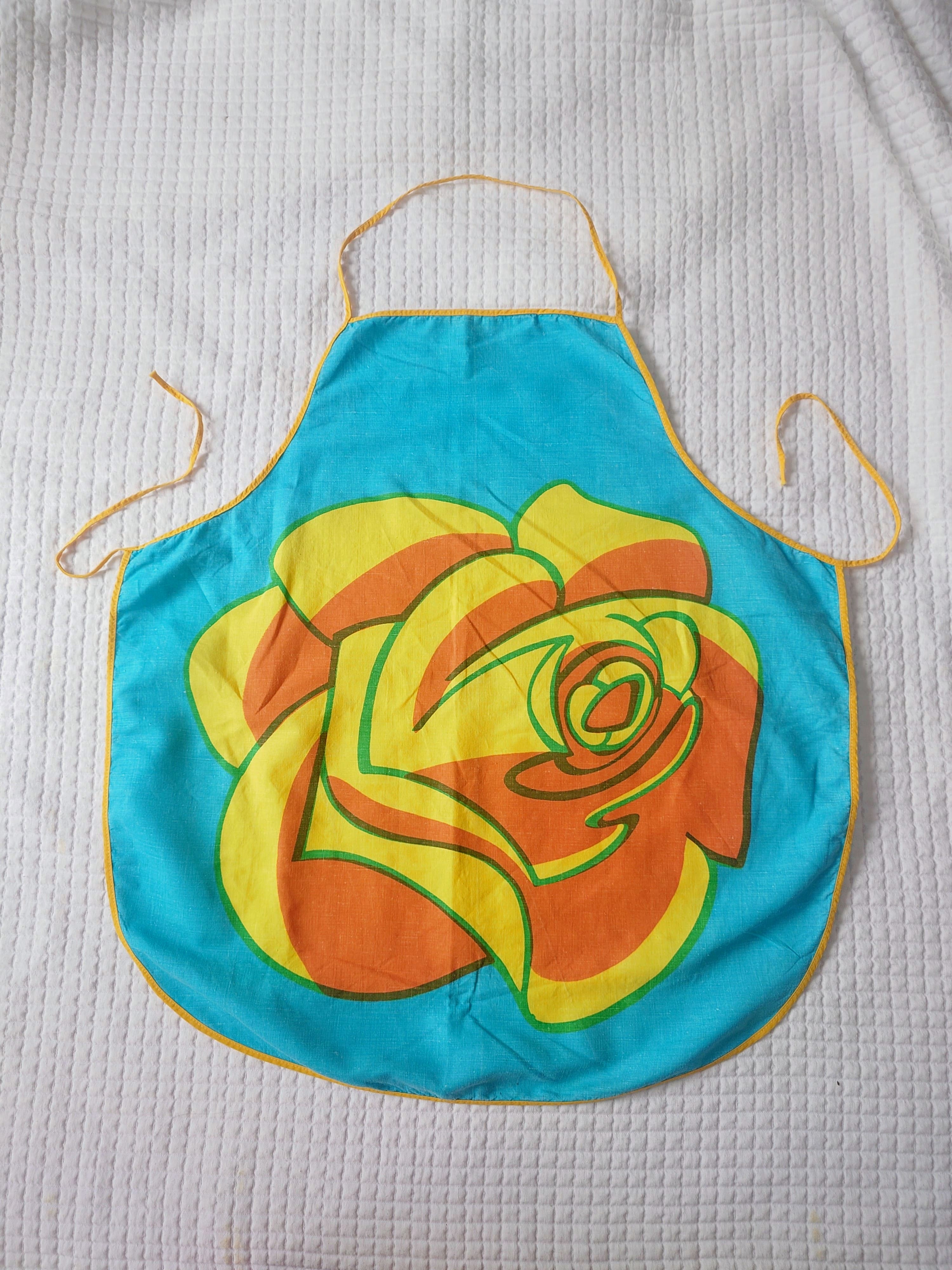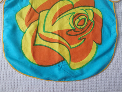 Pirtsakka 1970-1980 luvun turkoosi essu, missä on oranssi-keltainen ruusu koristeena. Puuvillaa.