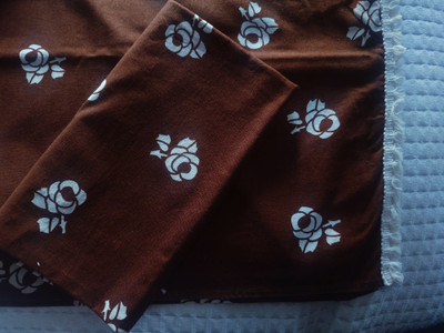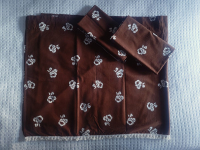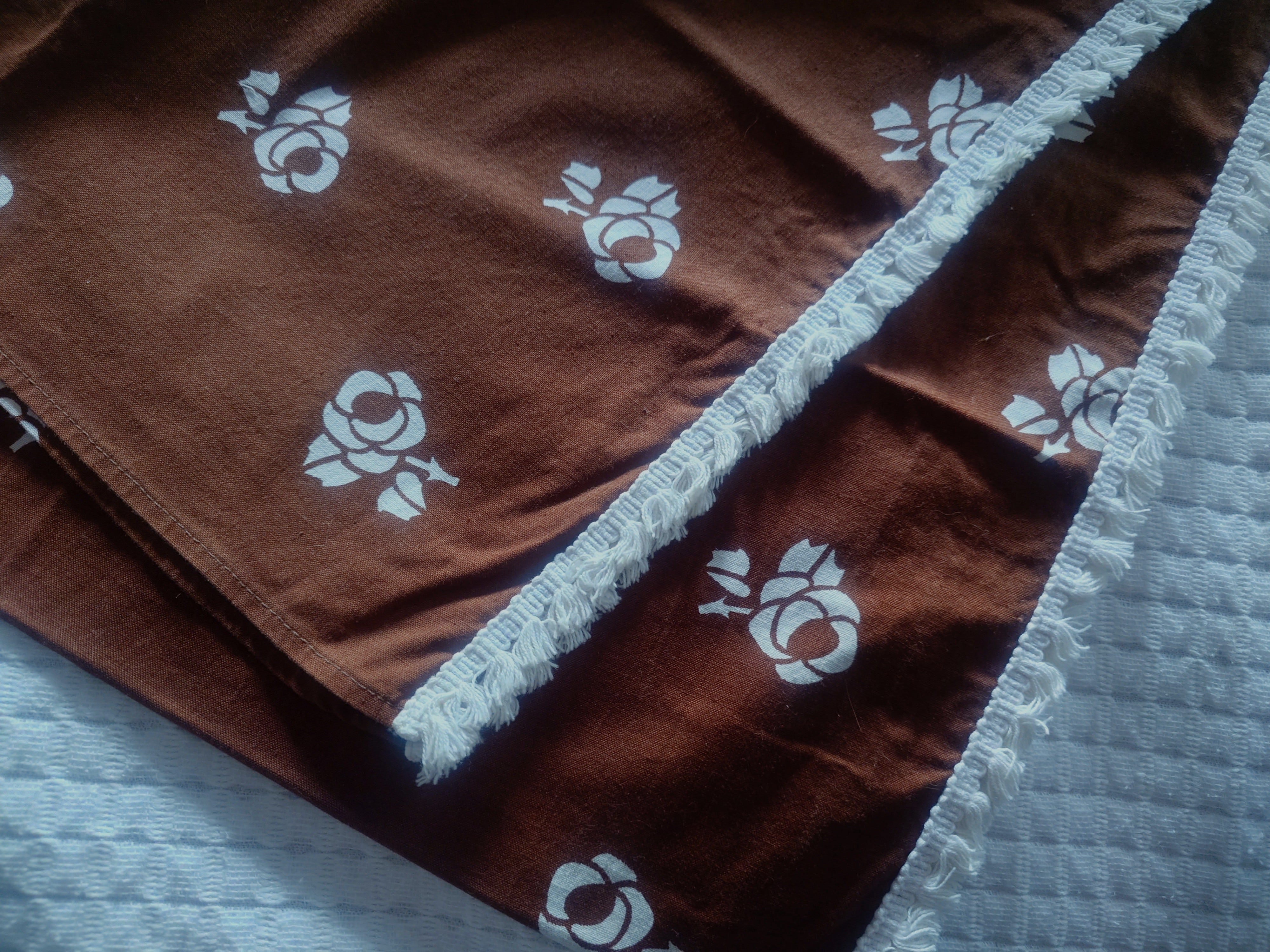 Retrot ruskeat ruusukuvioiset verhot ja samaa kangasta kaksi salusiinia. Finlaysonin 1970-luvun tuotantoa. Materiaali puuvilla.