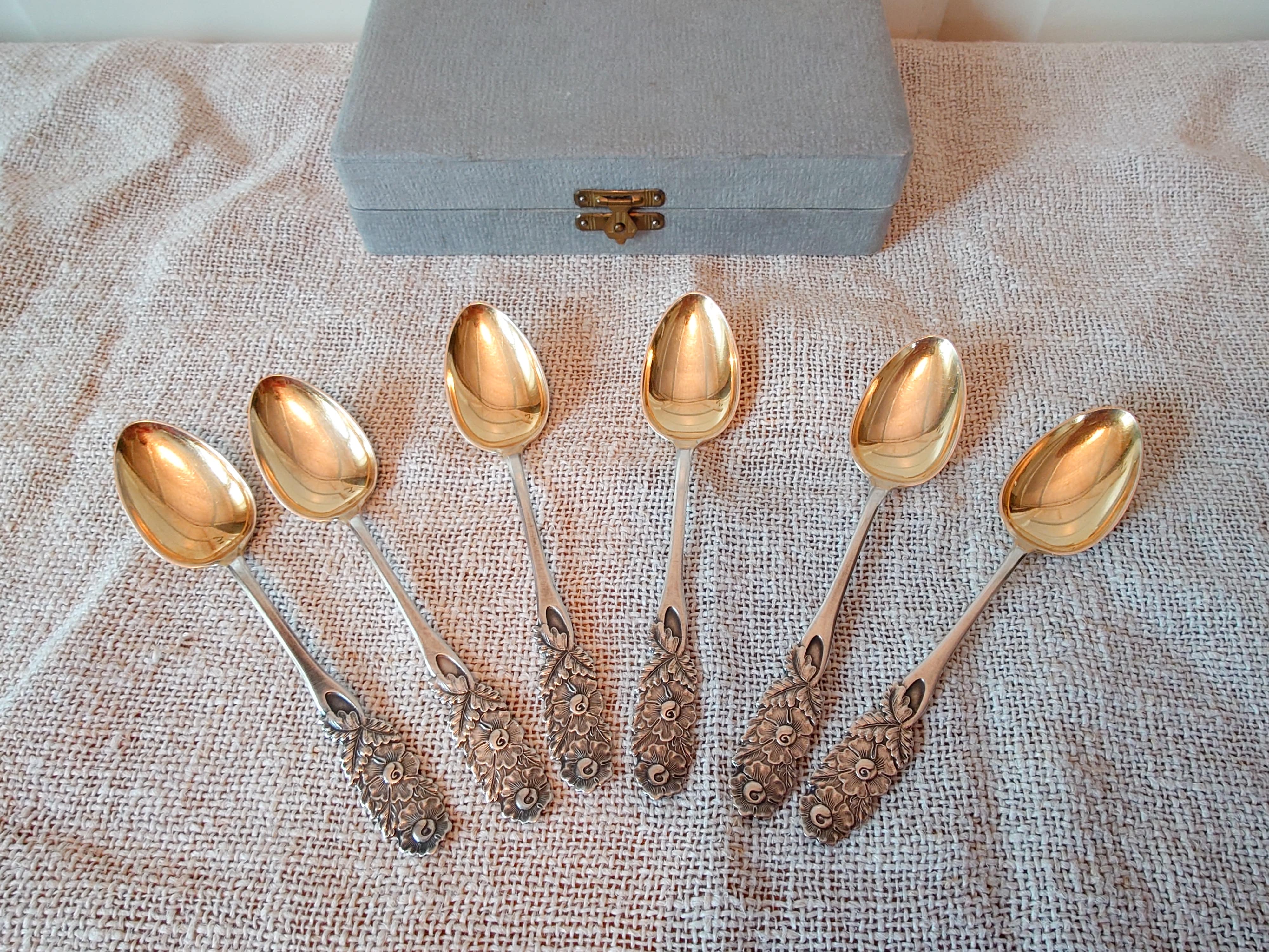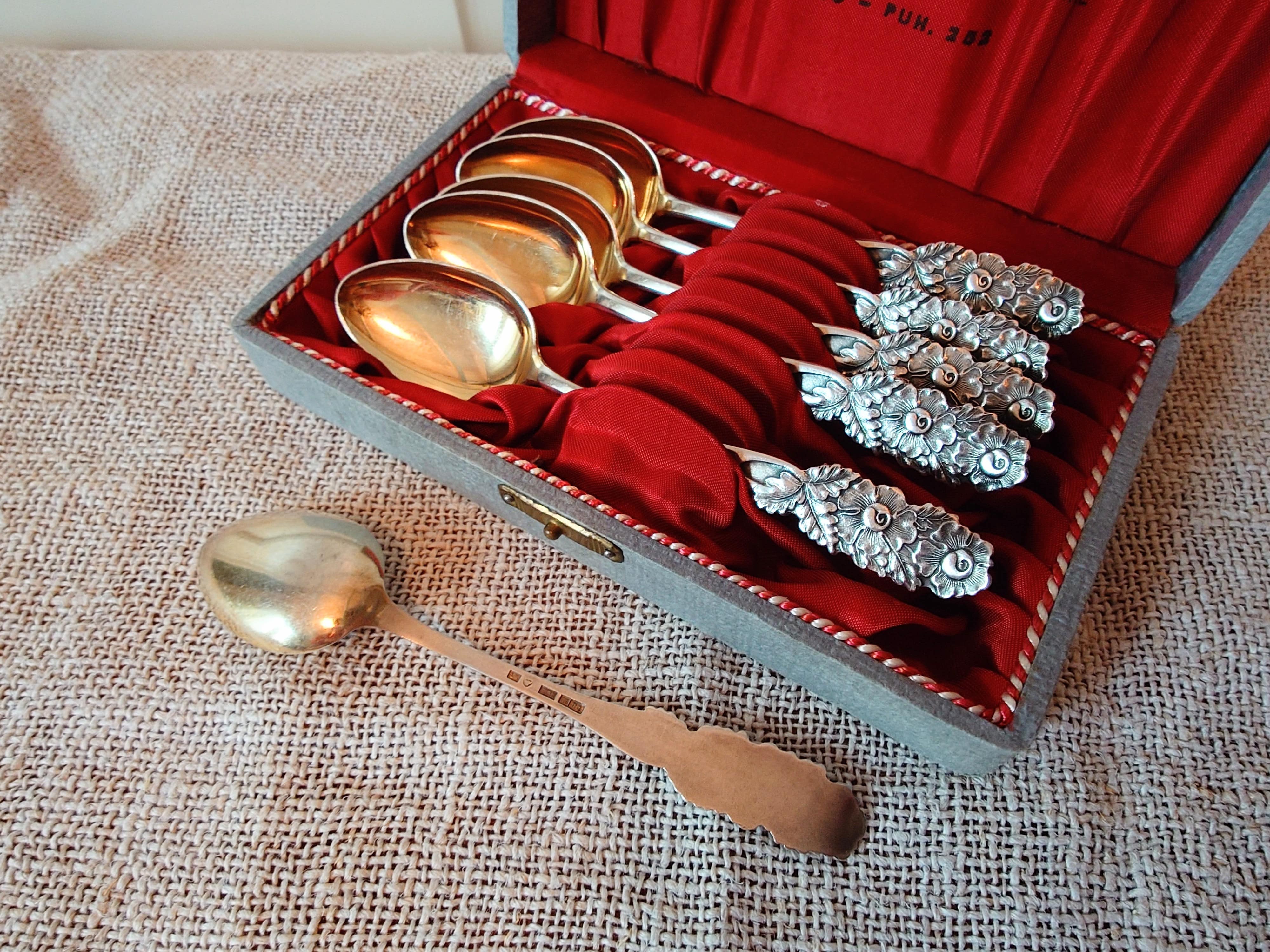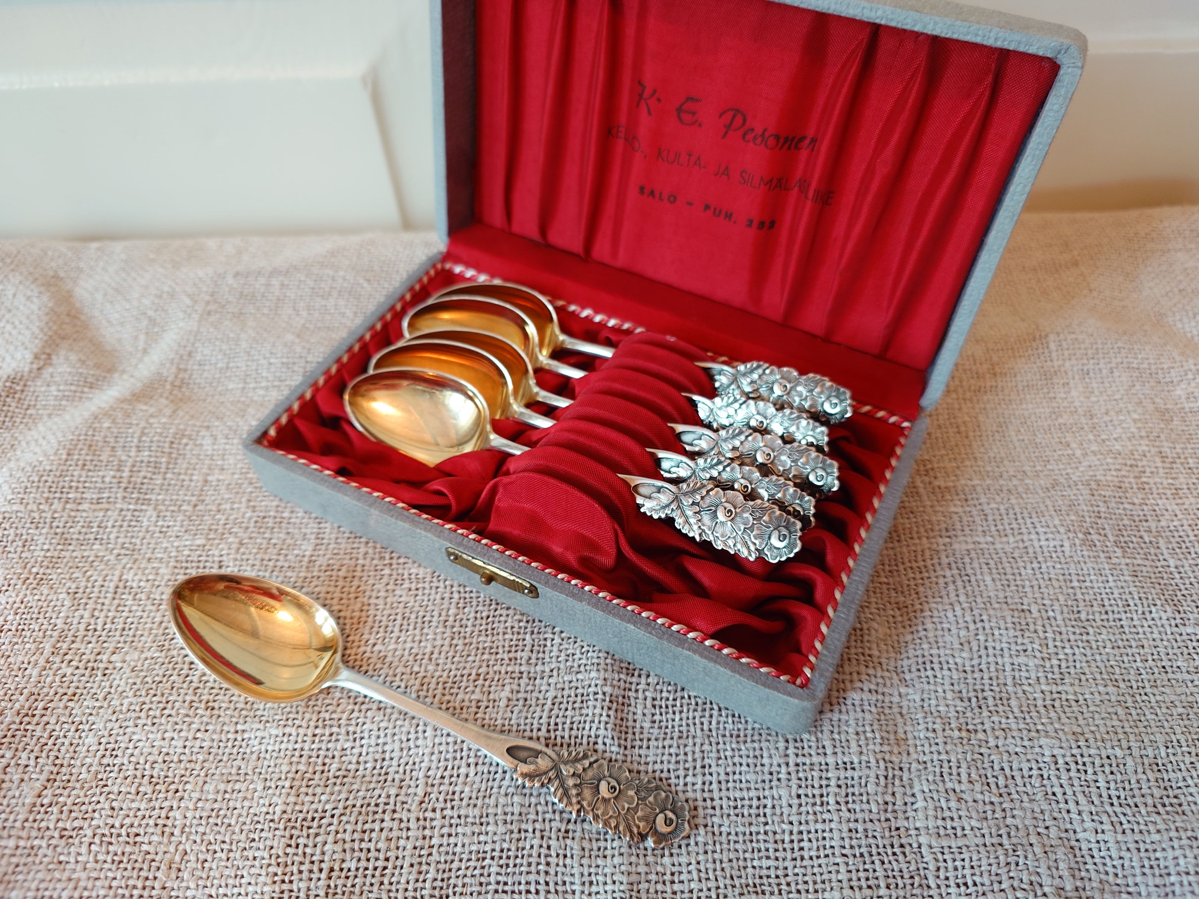 Kauniit kukkalusikat vuodelta 1946. Alkuperäinen säilytyslaatikko K.E. Pesonen Salo.