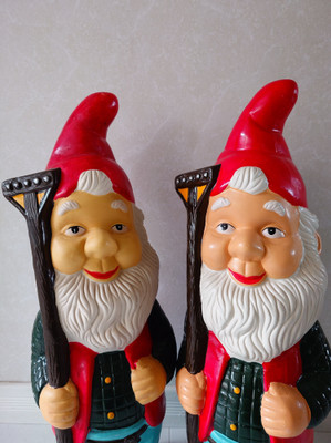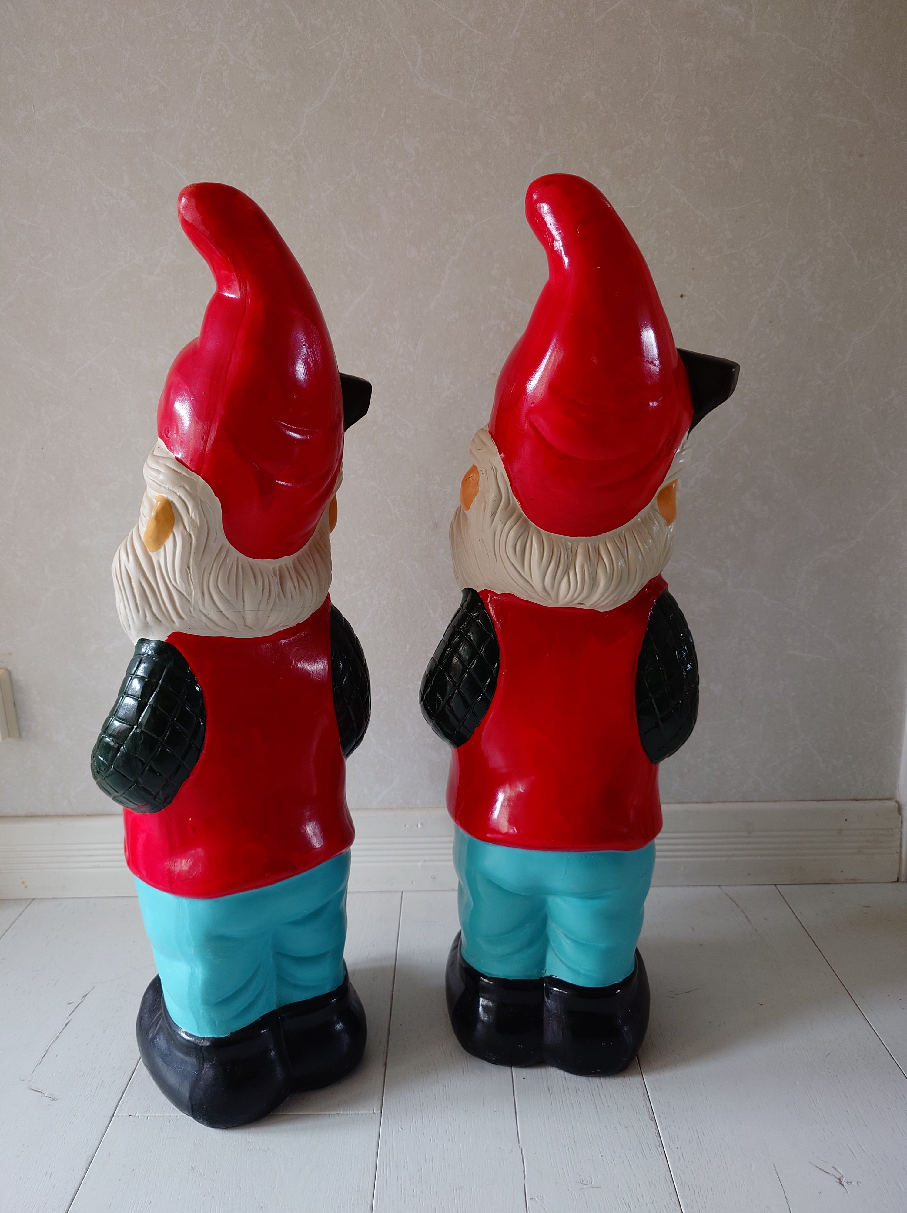 Ehjät ja hyväkuntoiset. Toisessa tonttulakissa vähän jälkeä. Toisen tontun iho on hiukan punertavampi kuin toisen, mutta muuten nämä ovat ihan samanlaiset.
