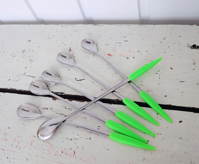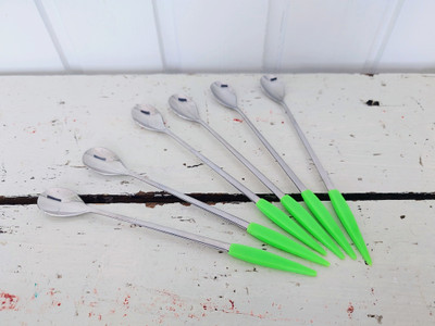 Stainless Japan merkityt pitkät pikkulusikat, joissa kahvassa on kirkkaan vihreä muovinen pää.